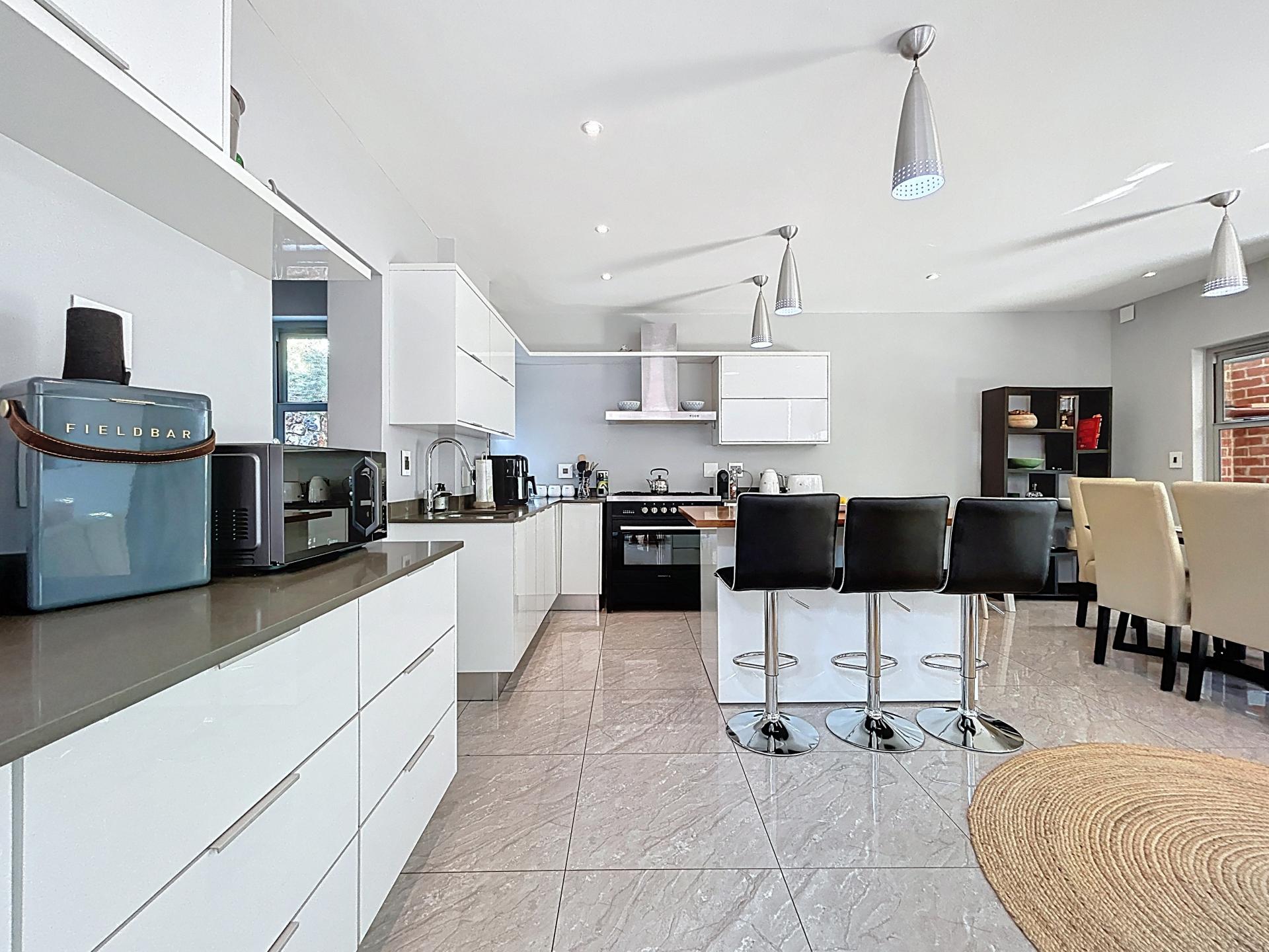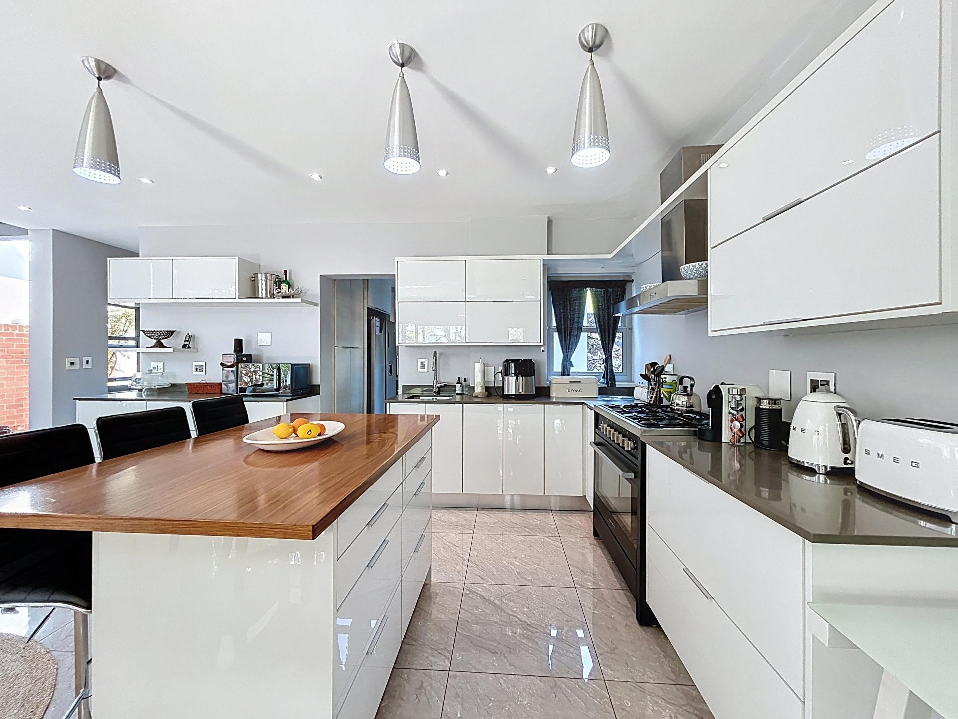 The modern kitchen with ample built in cupboards, hosts an oven with a gas hob and electric oven.