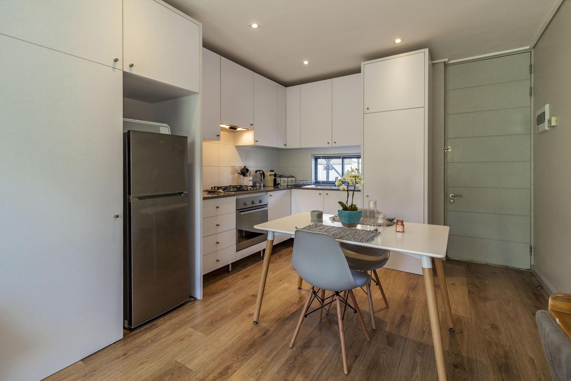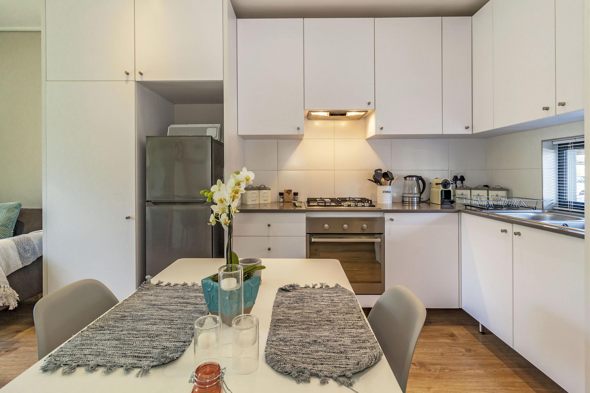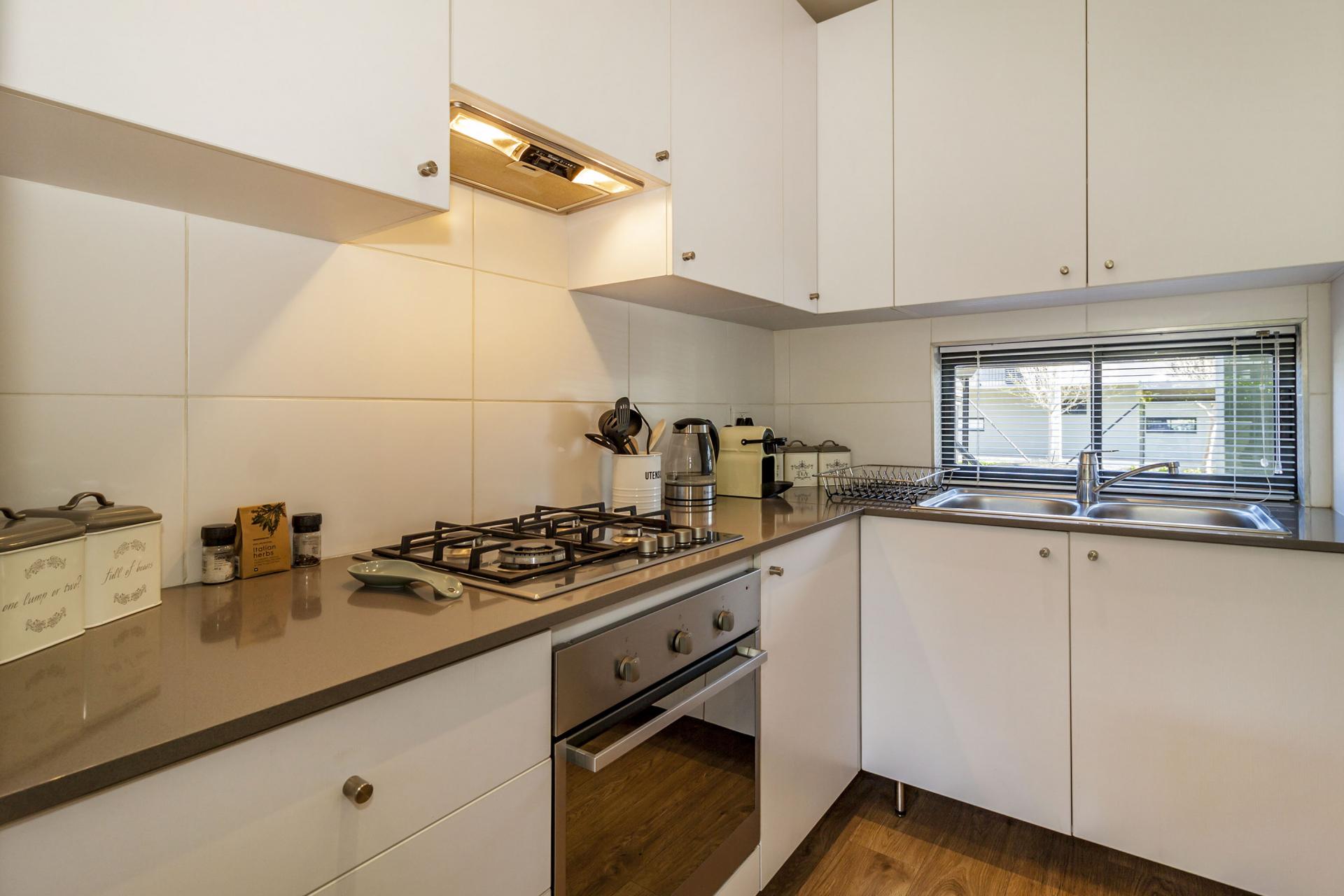 Designed for convenience and comfort, the home offers an open-plan living and kitchen area, perfect for relaxed everyday living. The kitchen is fitted with a gas stovetop, electric oven, and extractor fan, while a clever hidden cupboard provides space for two standard size front loading appliances keeping the aesthetic streamlined. Laminate flooring flows throughout the unit, creating a warm and cohesive feel.