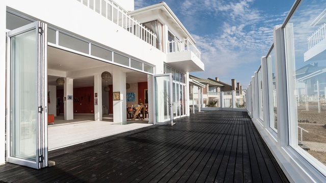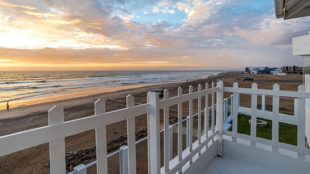 The expansive beachfront deck is ideal for sunny lunches, morning coffee, and sunset cocktails, providing an inviting beachside experience.