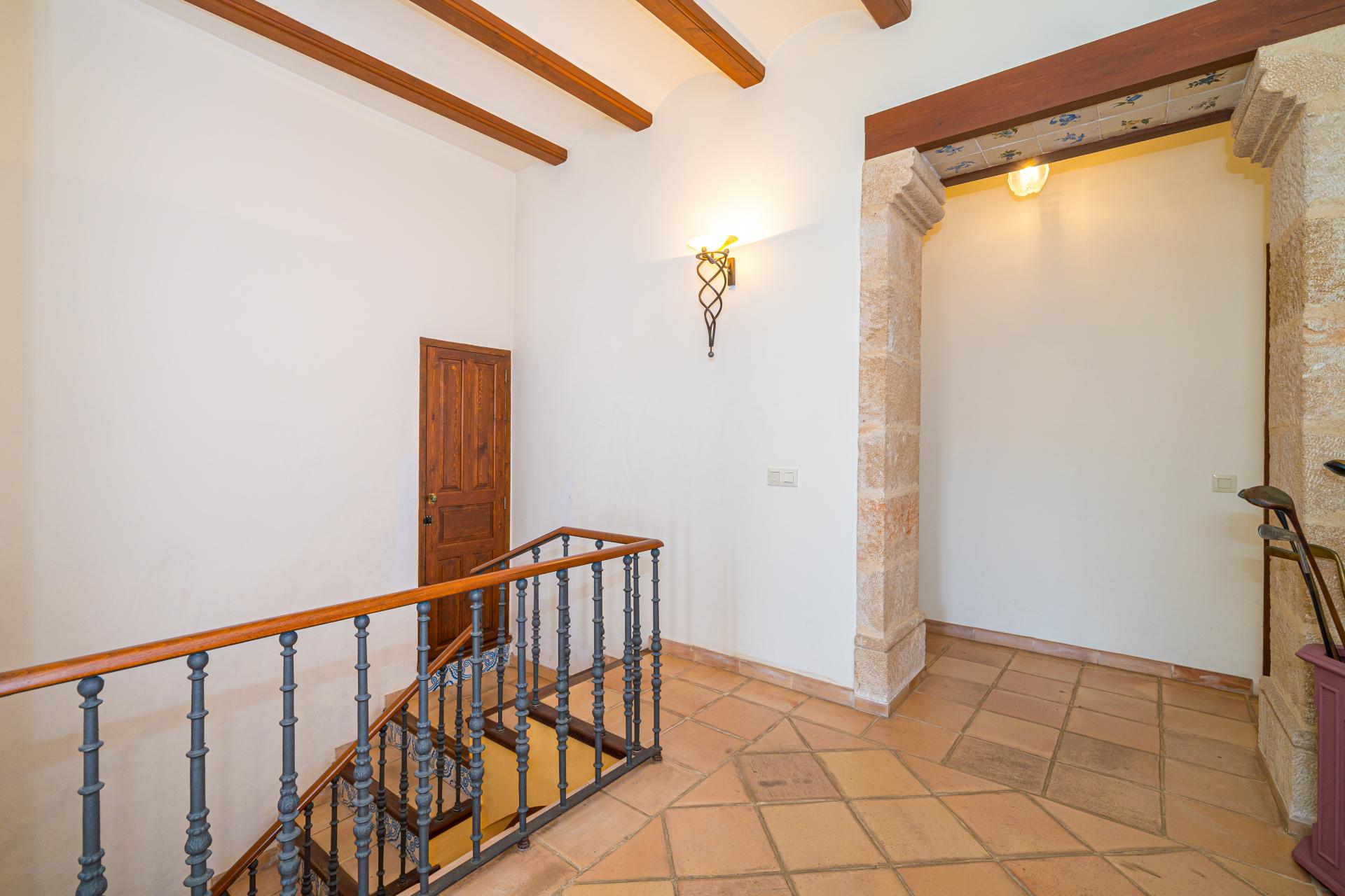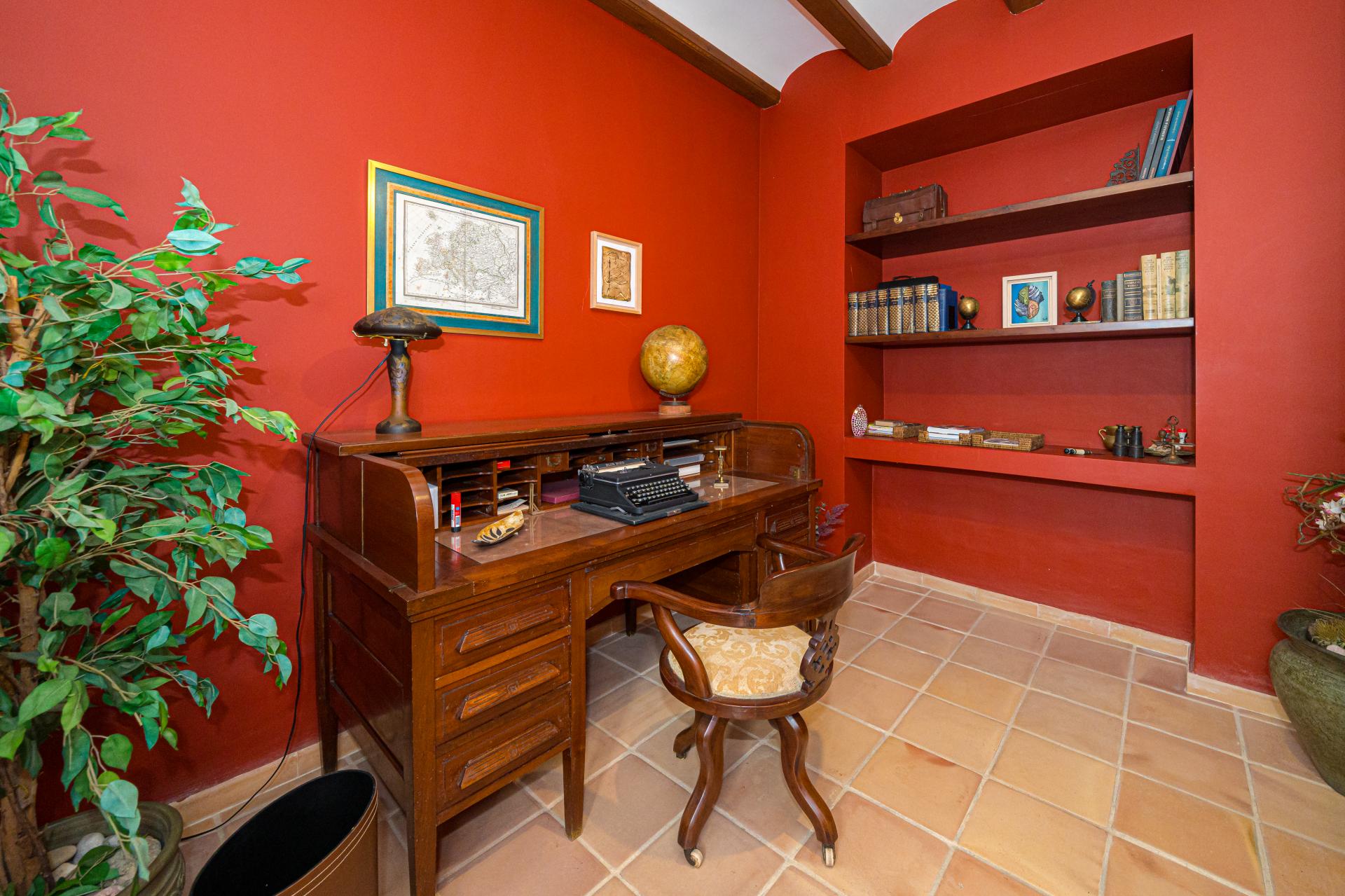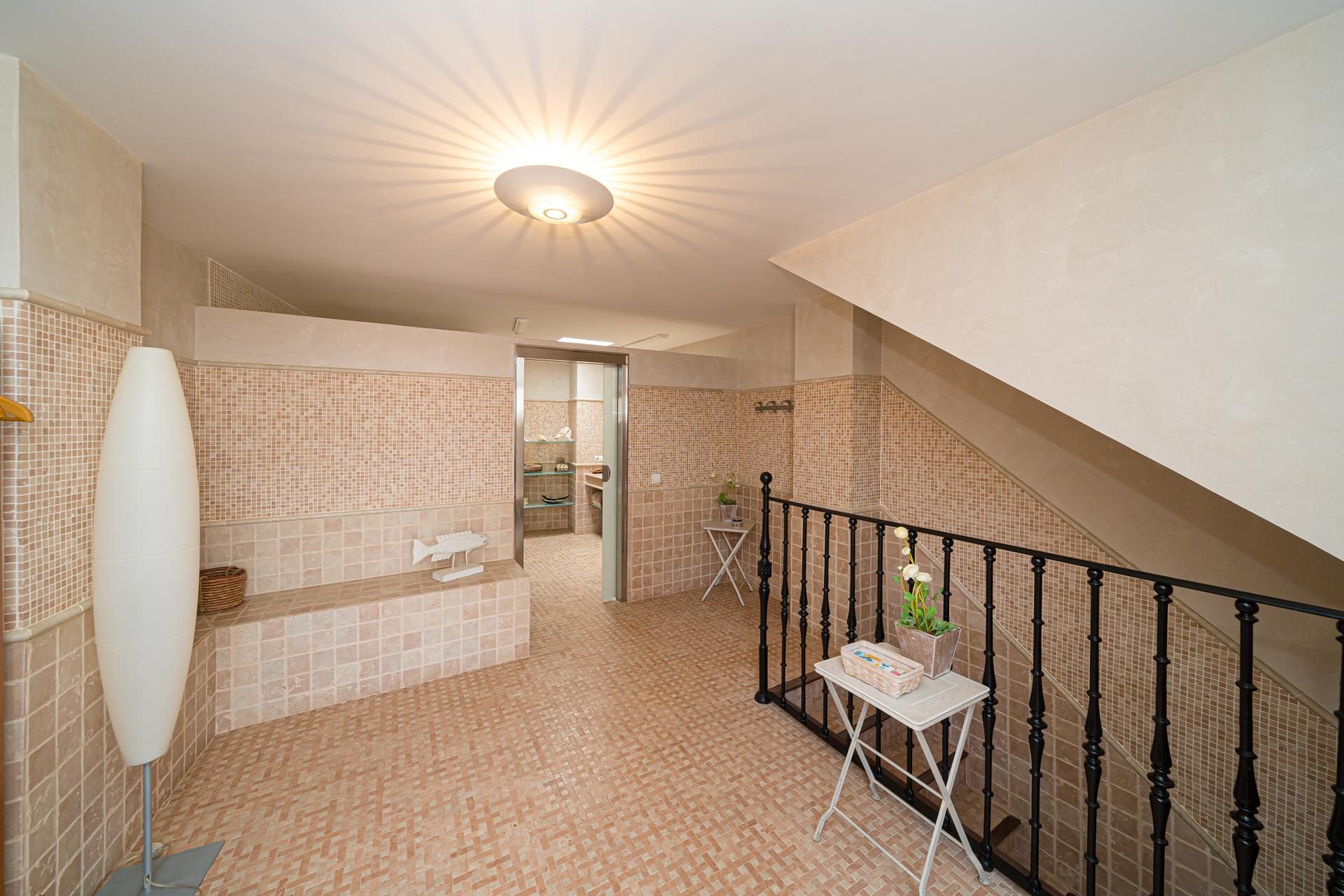 The main house is spread over three floors, with a lift shaft available for the installation of a private lift to connect the different floors and the garage should the buyer require. On the main floor, there is a large entrance hall, an office, and a generously sized reception room with two sitting areas and a dining room, connected by tosca stone arches. All of this enjoys a marvellous continuous connection with the south-facing terraces, as well as a practical access to the kitchen with its utility room and laundry room.