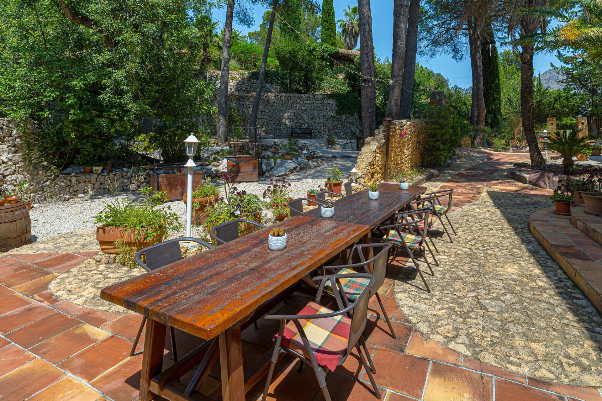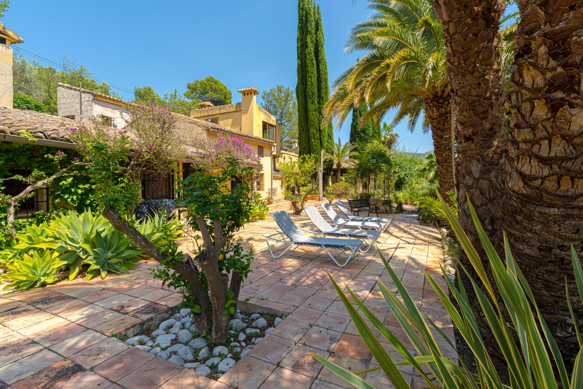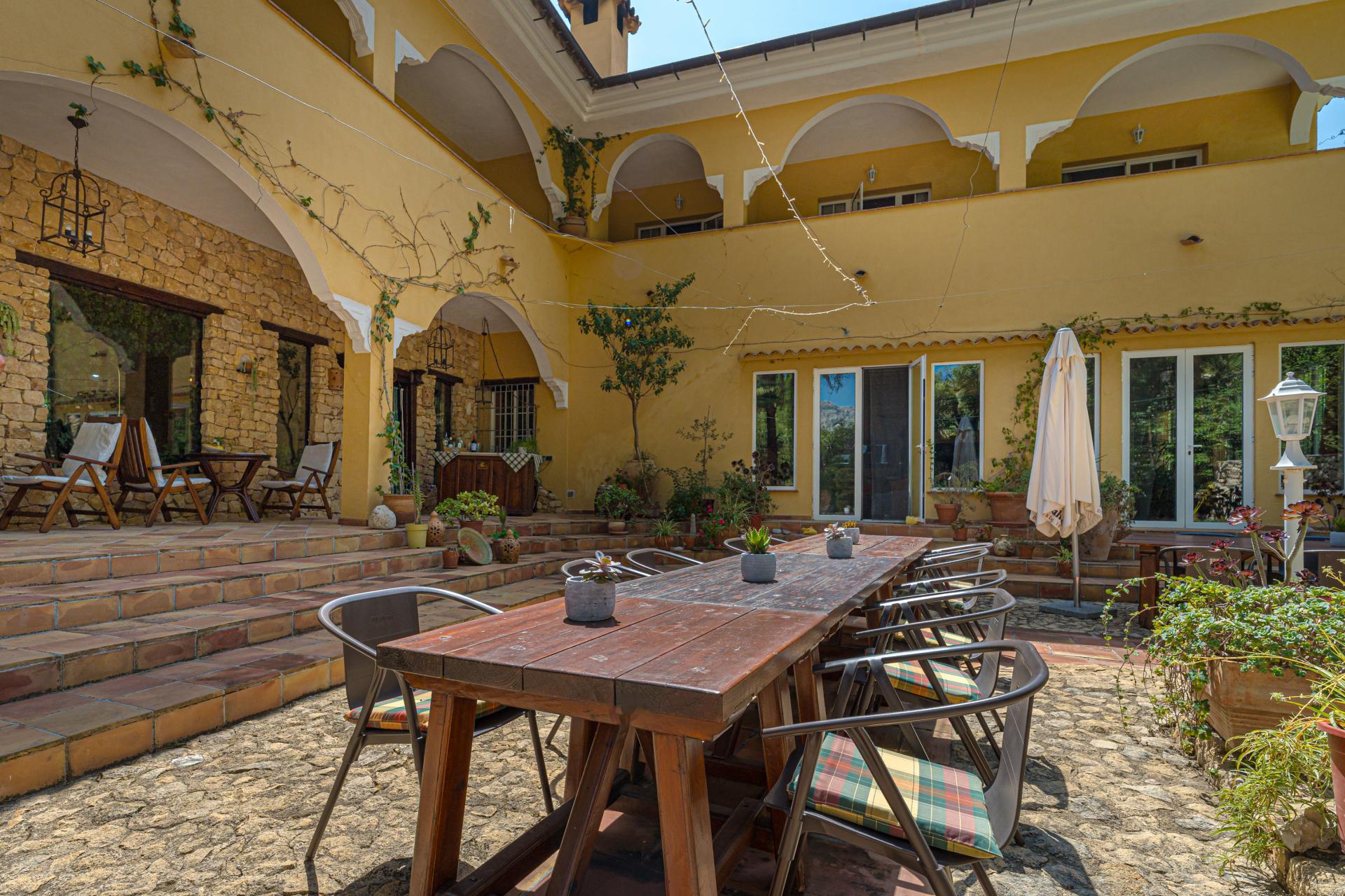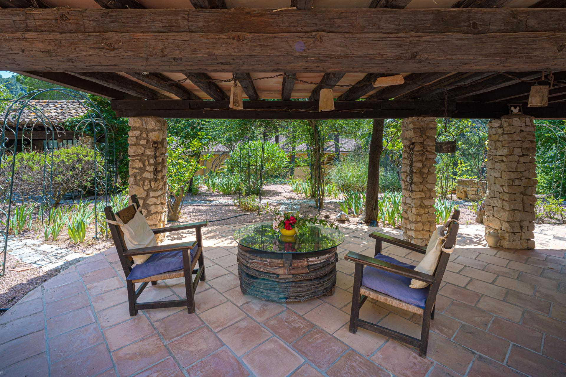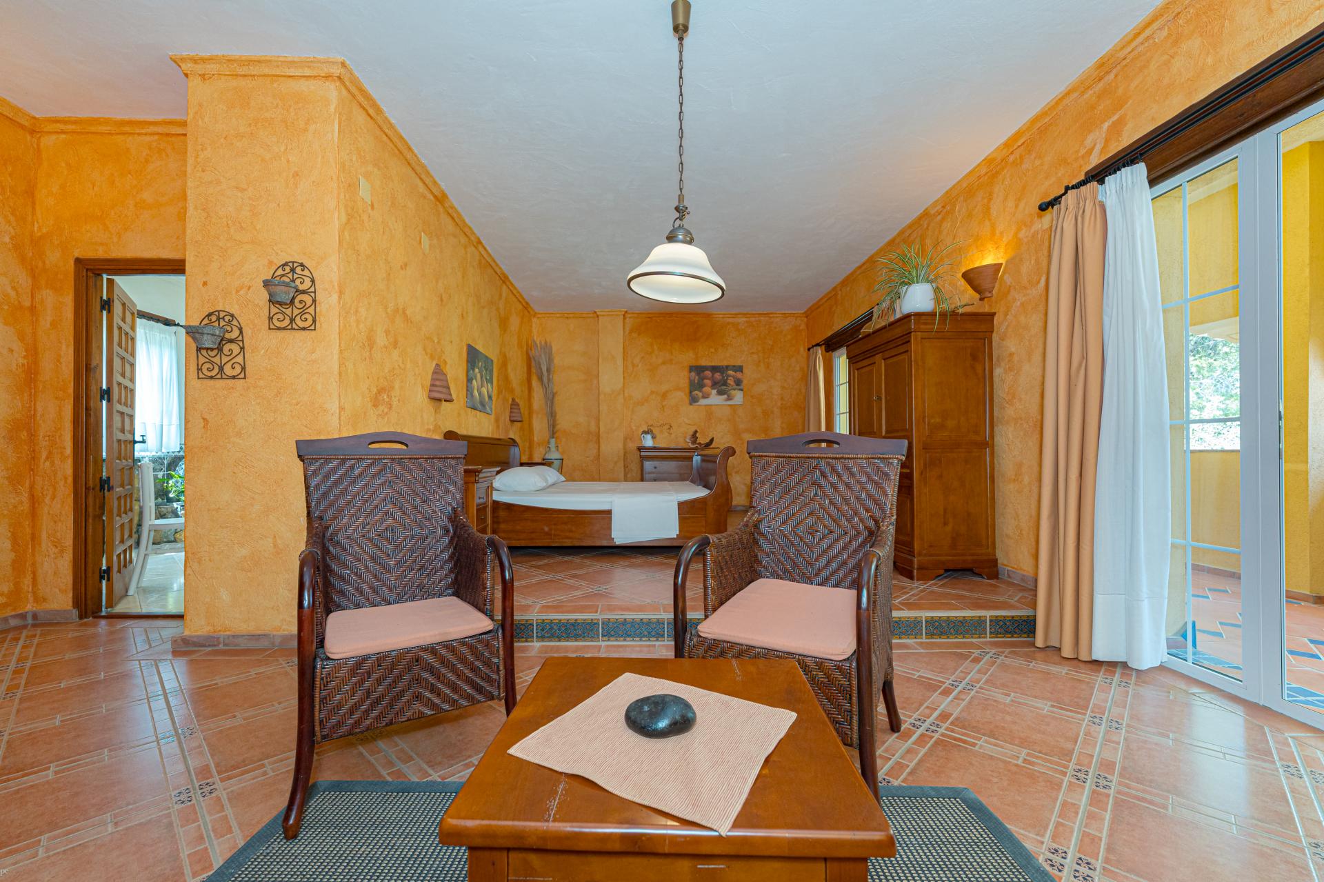 The main house is a grand yet welcoming villa, brimming with rustic elegance and classic warmth. Terracotta tiles underfoot and timber-beamed ceilings speak to its heritage, while modern comforts are woven subtly throughout. The eight bedroom suites, each with their own bathrooms and quiet seating areas or balconies, are designed for privacy and peace. Shared spaces are expansive, yet soulful—lounges for storytelling, dining areas that stretch into the garden, and a beautiful indoor bar for winter evenings by candlelight. The guest finca, just a short stroll away, offers four further ensuite bedrooms, rustic lounges, and its own bar and pergola terrace—an ideal setting for long lunches, private stays, or memorable family events. And yet, the true magic lies in the moments between: a carved bench under a fig tree, a morning coffee on a shaded veranda, the quiet hush of dusk as birds settle in the trees. This is a home that reveals itself slowly and rewards those who linger.