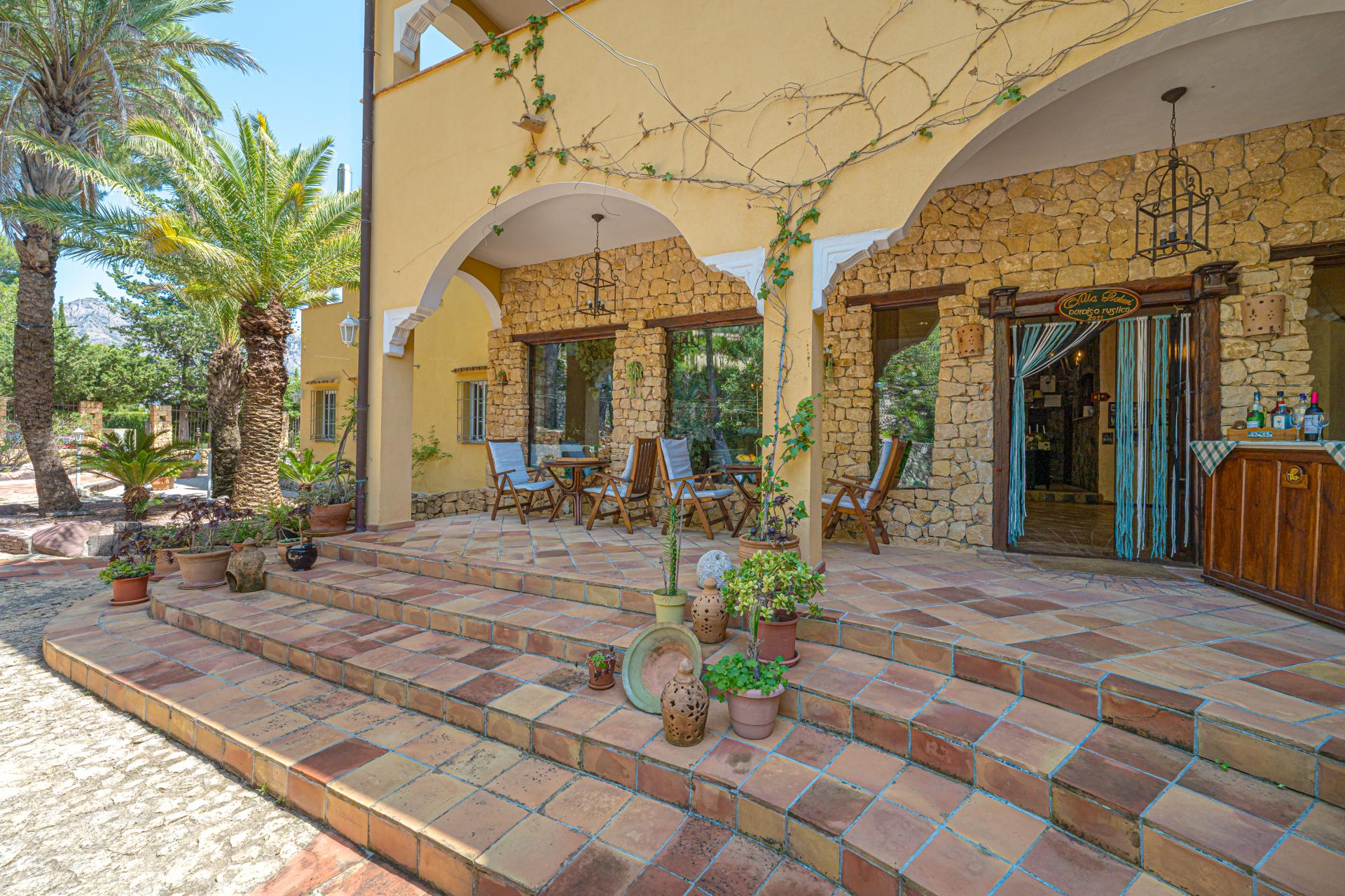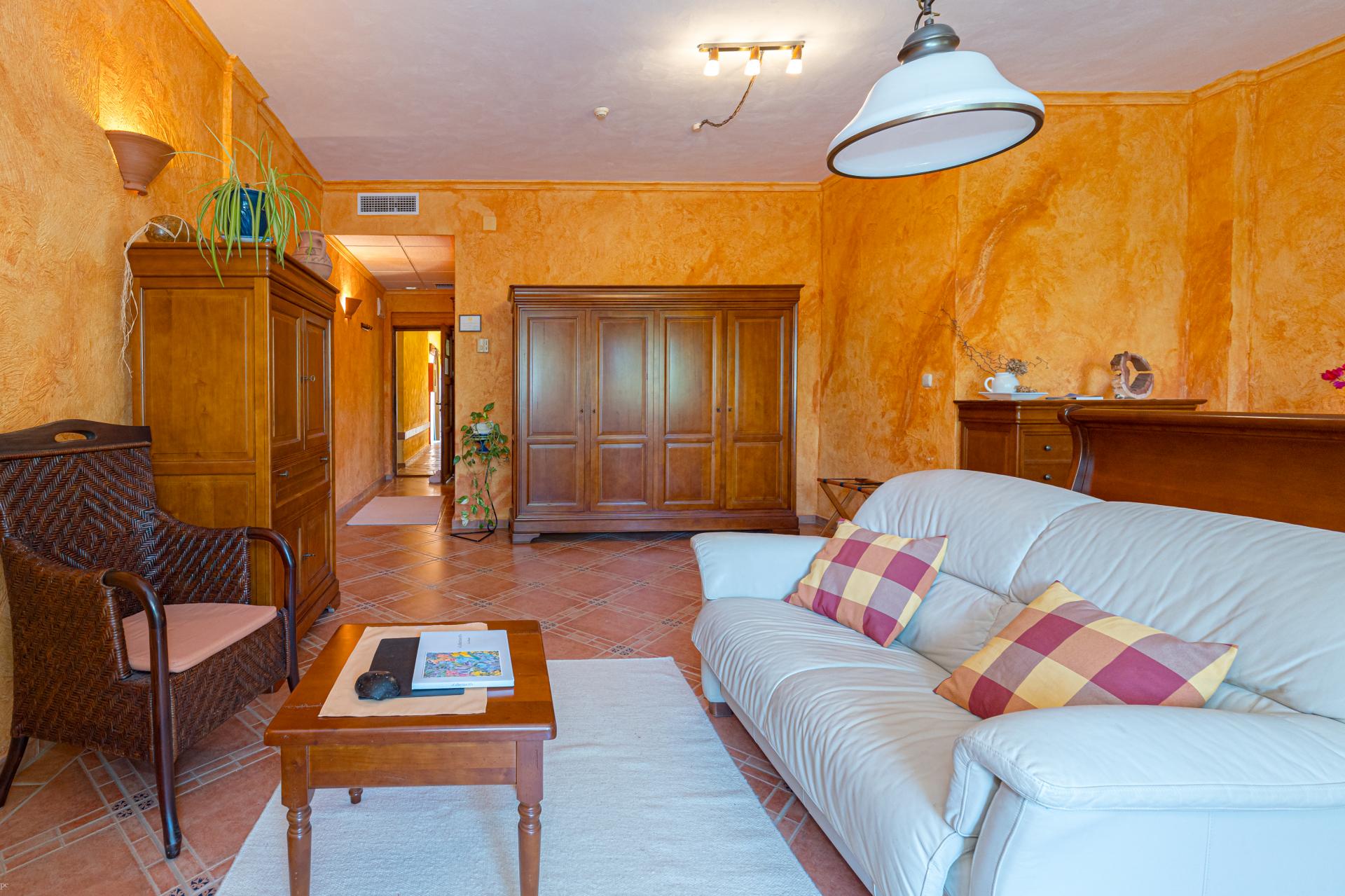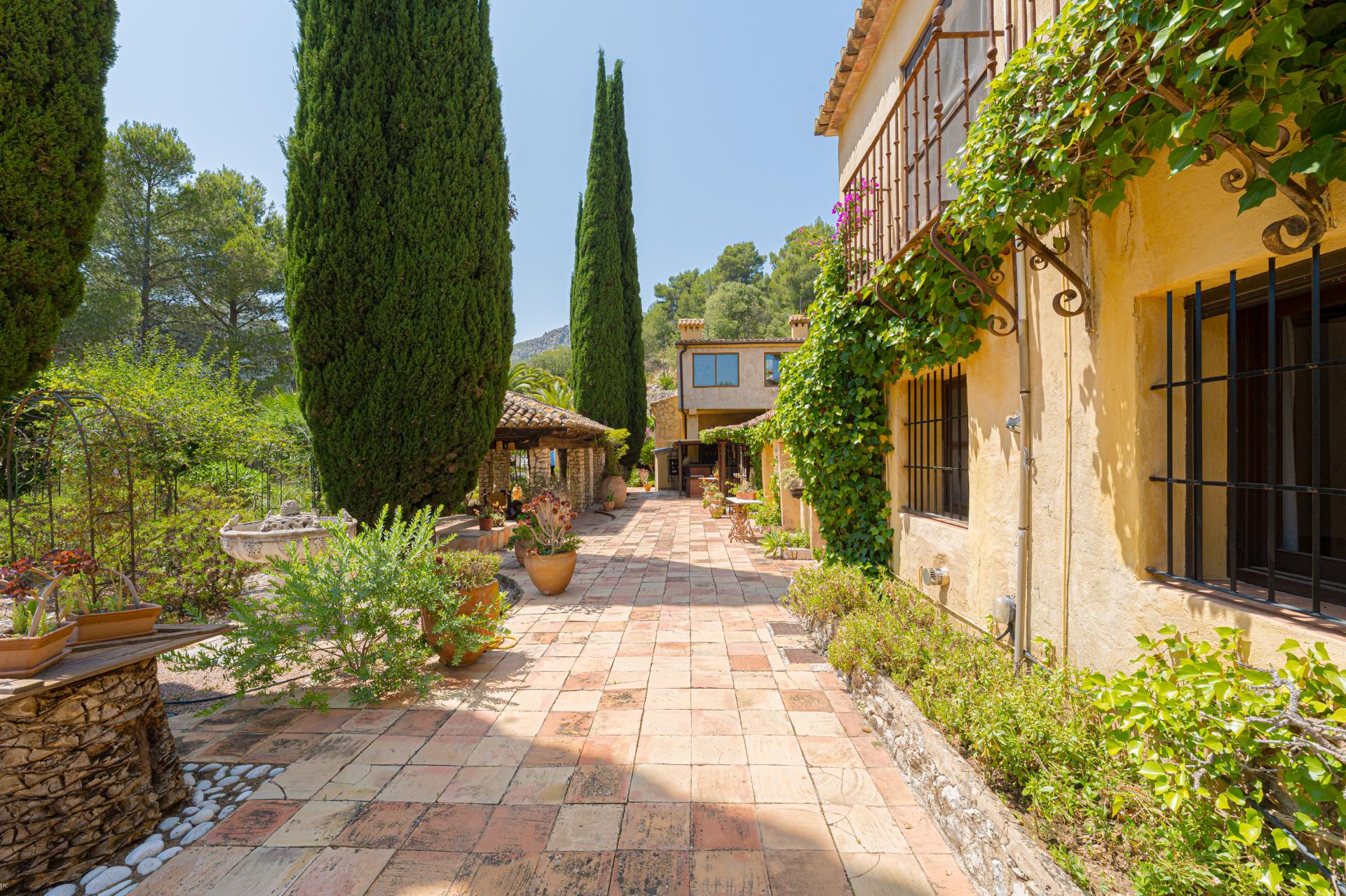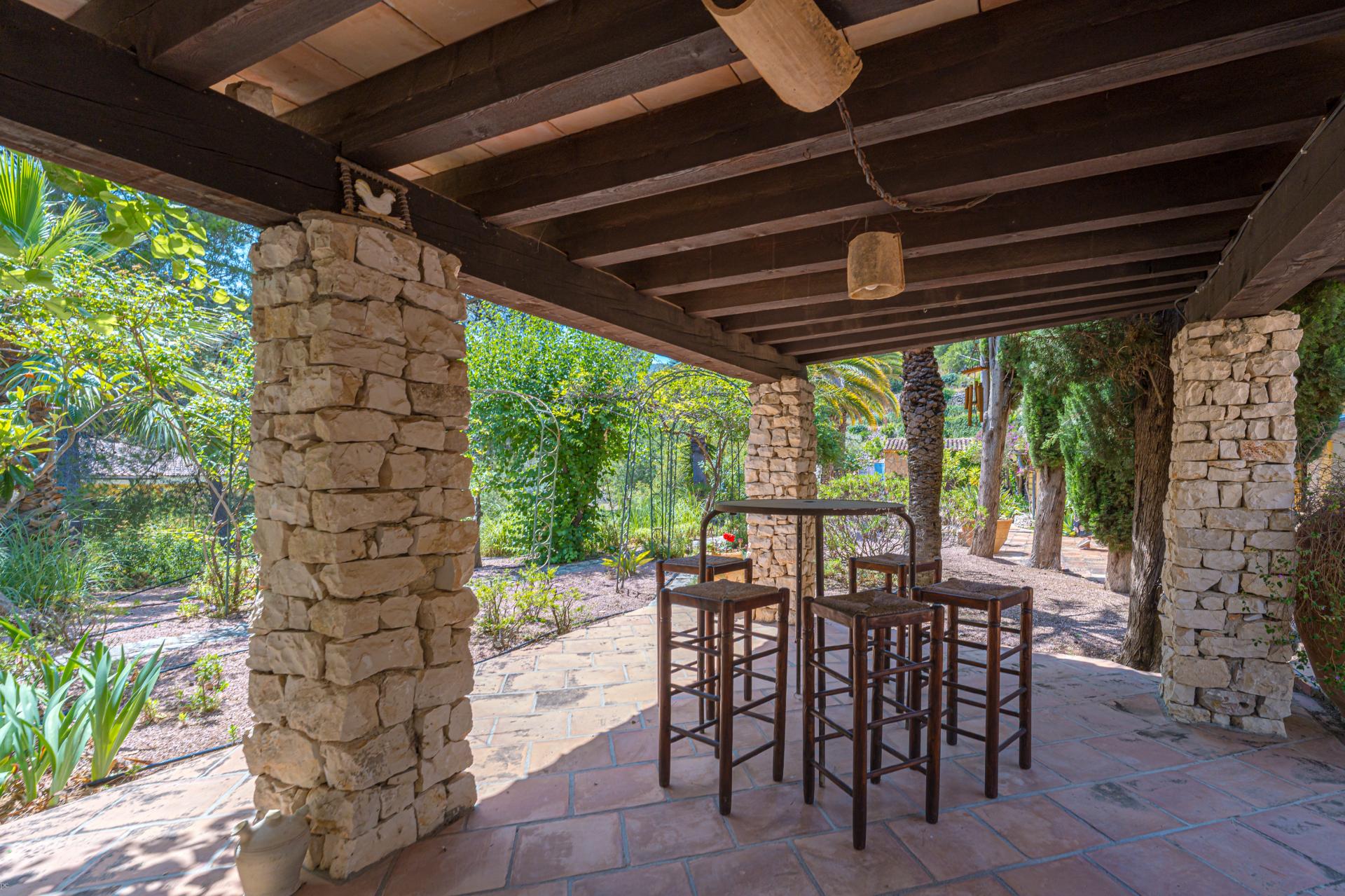 The main house is a grand yet welcoming villa, brimming with rustic elegance and classic warmth. Terracotta tiles underfoot and timber-beamed ceilings speak to its heritage, while modern comforts are woven subtly throughout. The eight bedroom suites, each with their own bathrooms and quiet seating areas or balconies, are designed for privacy and peace. Shared spaces are expansive, yet soulful—lounges for storytelling, dining areas that stretch into the garden, and a beautiful indoor bar for winter evenings by candlelight. The guest finca, just a short stroll away, offers four further ensuite bedrooms, rustic lounges, and its own bar and pergola terrace—an ideal setting for long lunches, private stays, or memorable family events. And yet, the true magic lies in the moments between: a carved bench under a fig tree, a morning coffee on a shaded veranda, the quiet hush of dusk as birds settle in the trees. This is a home that reveals itself slowly and rewards those who linger.