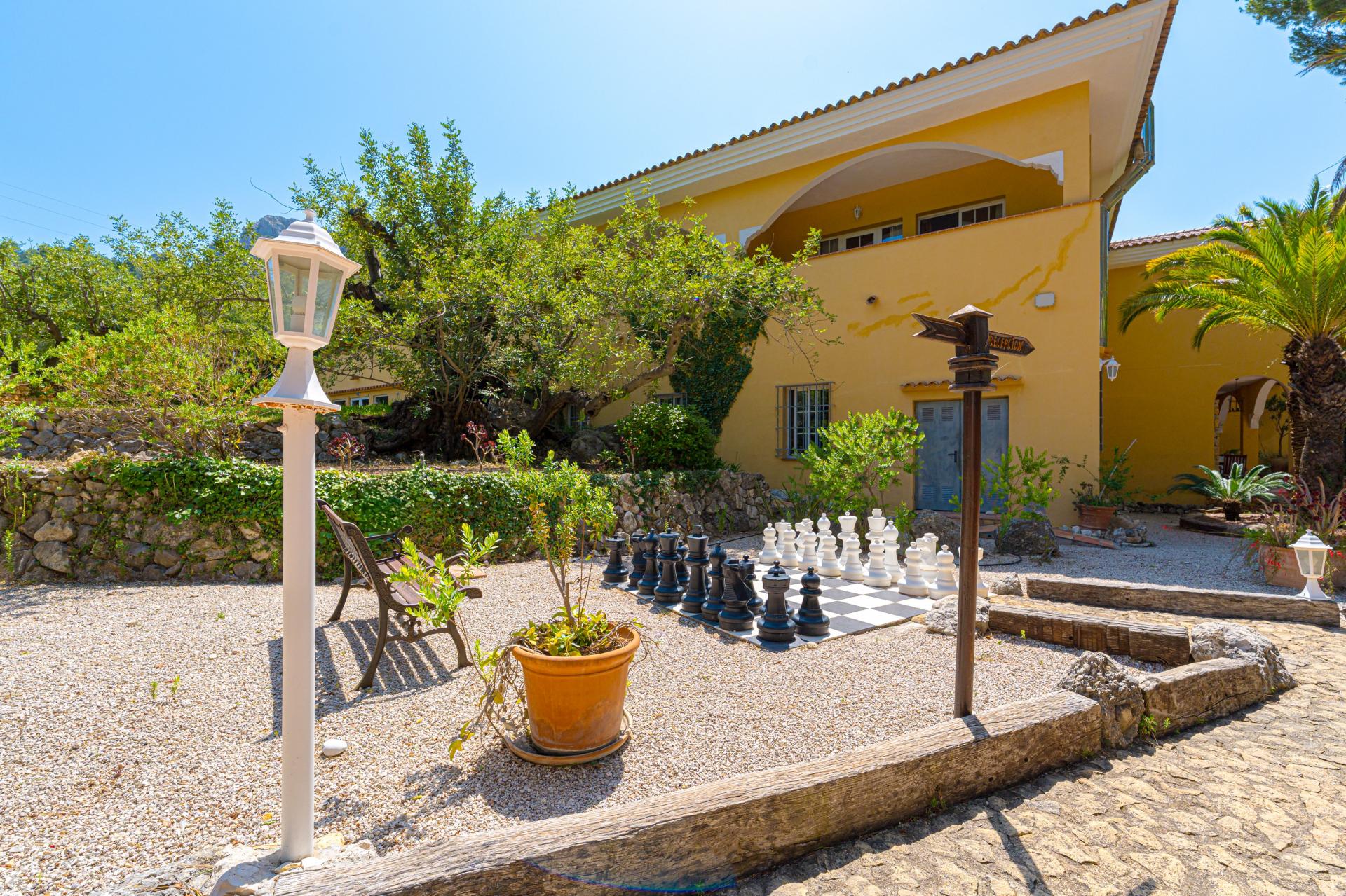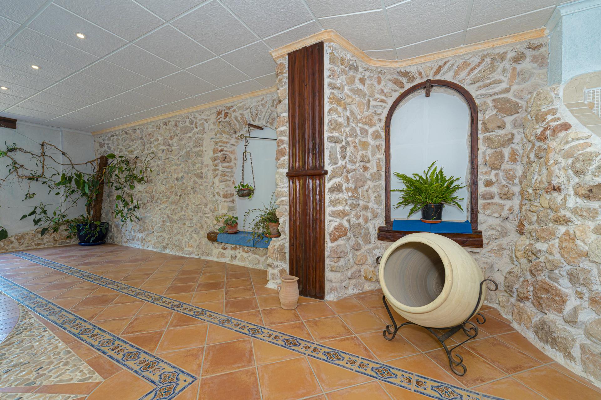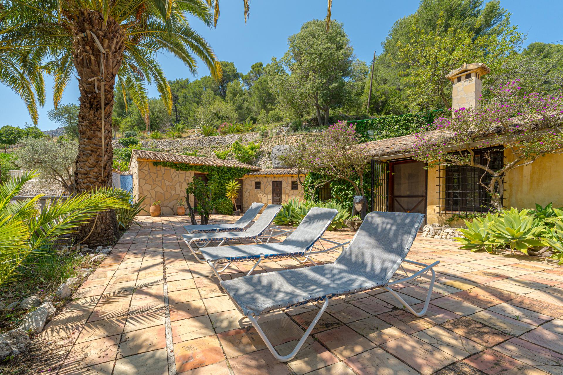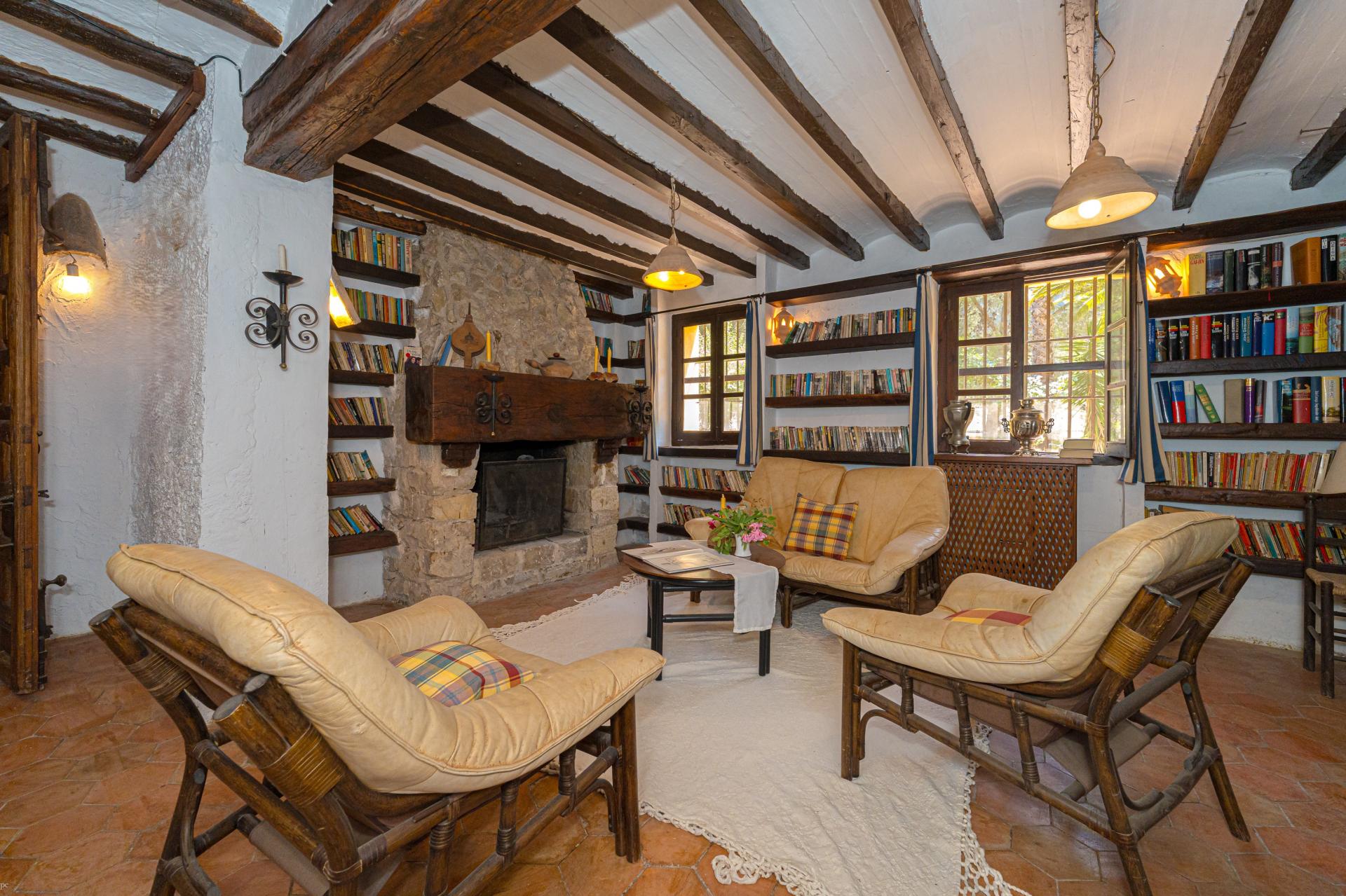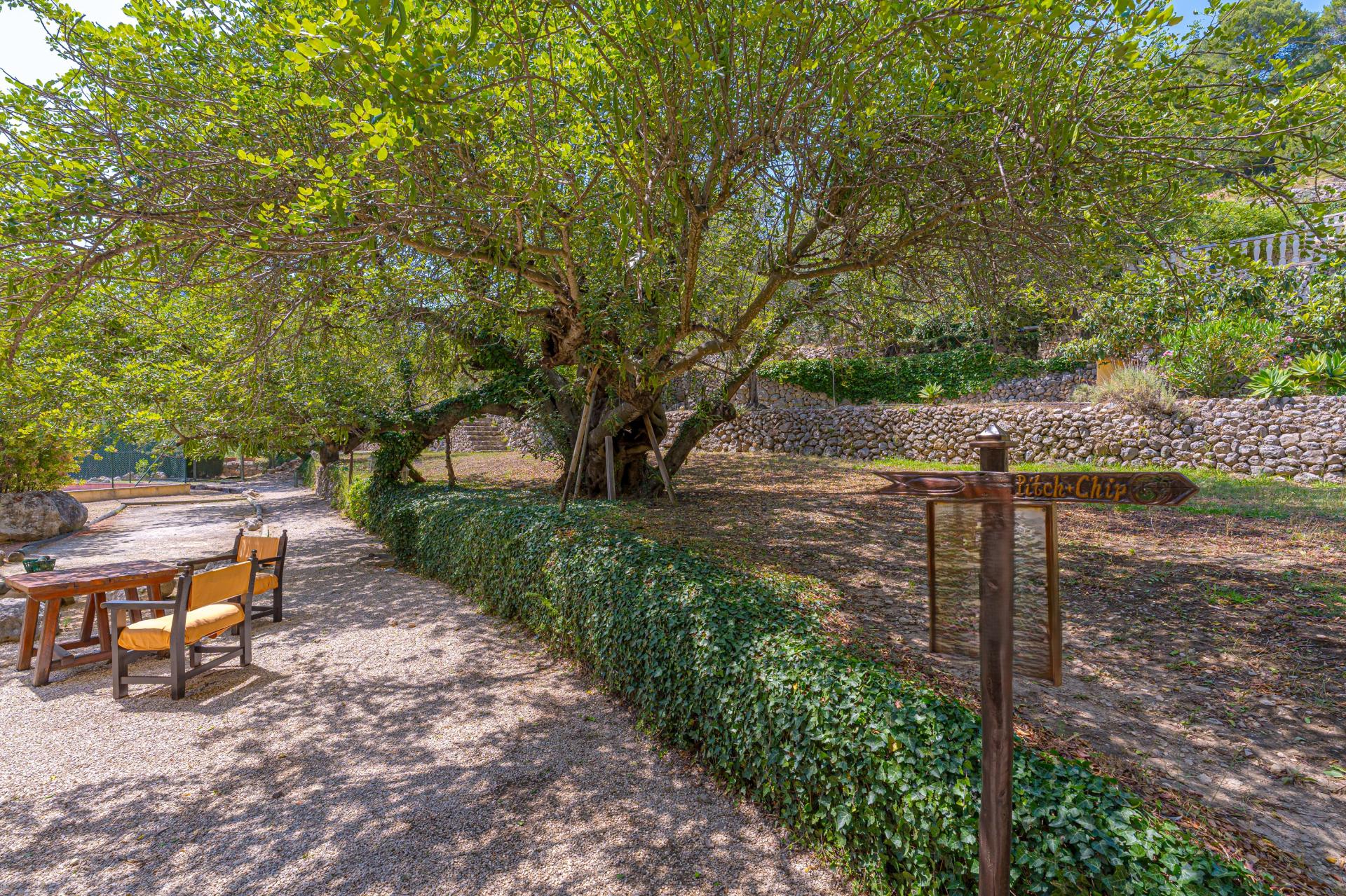 The main house is a grand yet welcoming villa, brimming with rustic elegance and classic warmth. Terracotta tiles underfoot and timber-beamed ceilings speak to its heritage, while modern comforts are woven subtly throughout. The eight bedroom suites, each with their own bathrooms and quiet seating areas or balconies, are designed for privacy and peace. Shared spaces are expansive, yet soulful—lounges for storytelling, dining areas that stretch into the garden, and a beautiful indoor bar for winter evenings by candlelight. The guest finca, just a short stroll away, offers four further ensuite bedrooms, rustic lounges, and its own bar and pergola terrace—an ideal setting for long lunches, private stays, or memorable family events. And yet, the true magic lies in the moments between: a carved bench under a fig tree, a morning coffee on a shaded veranda, the quiet hush of dusk as birds settle in the trees. This is a home that reveals itself slowly and rewards those who linger.
