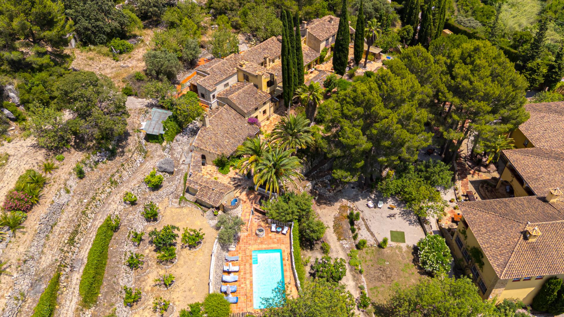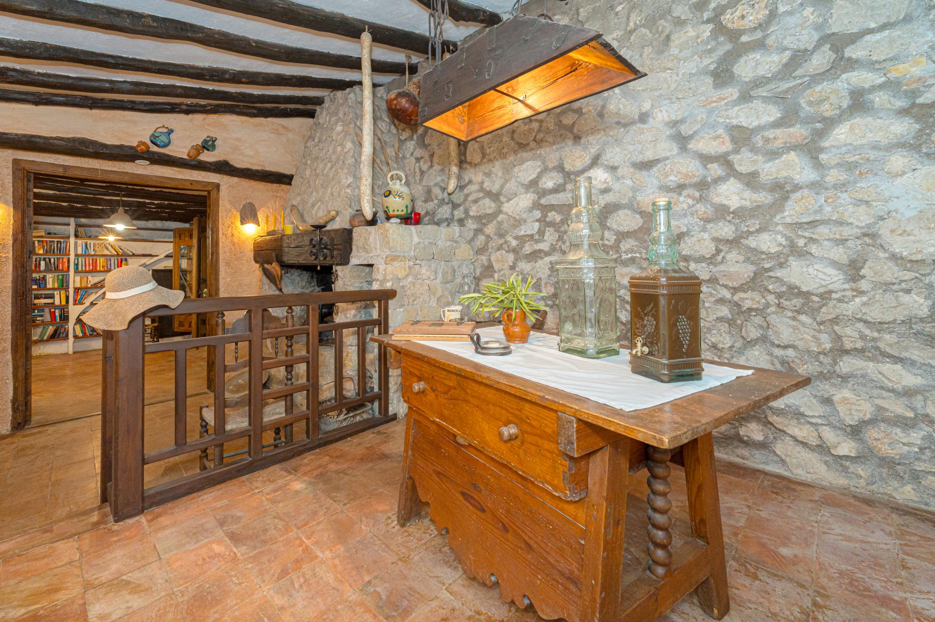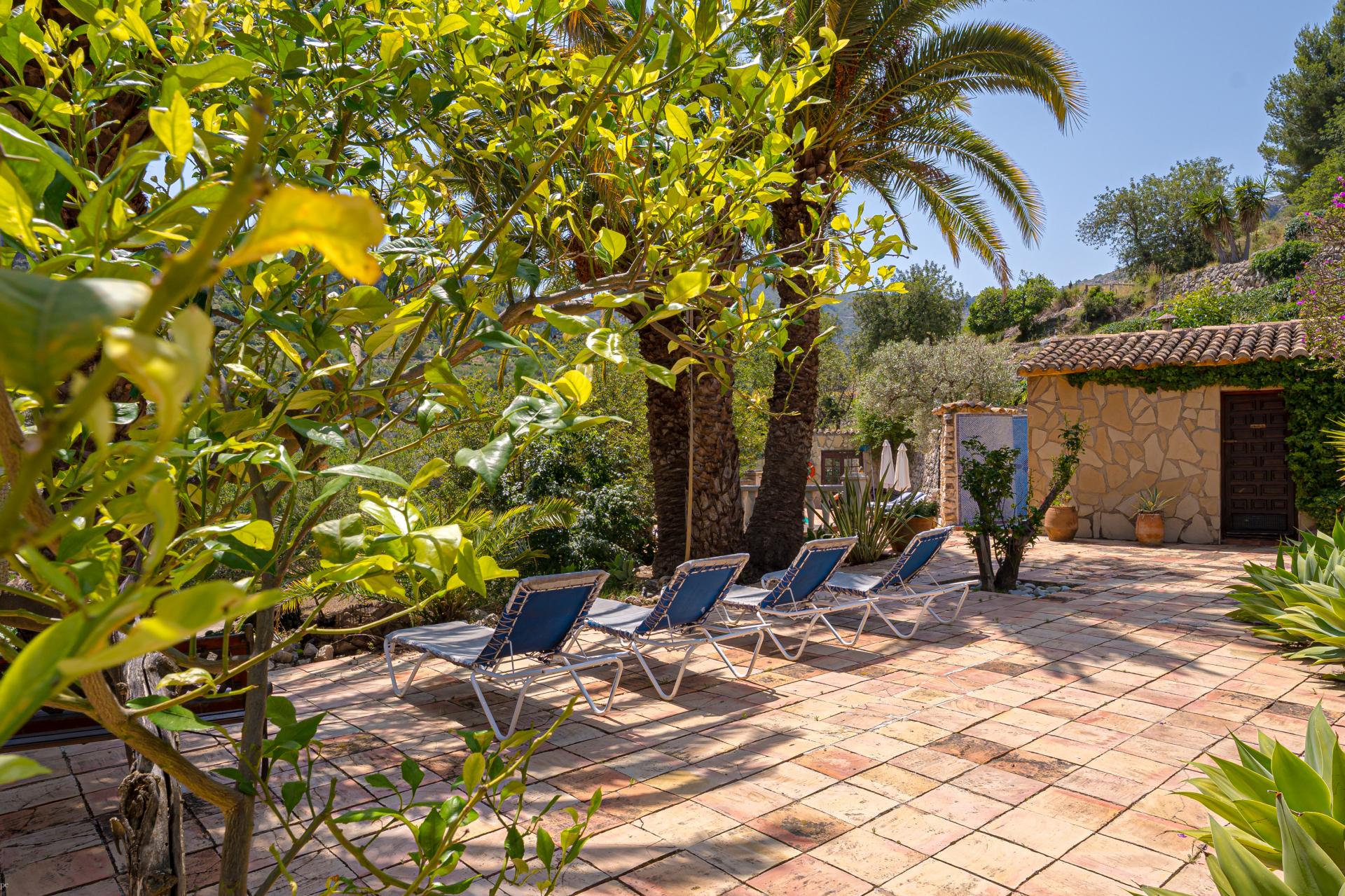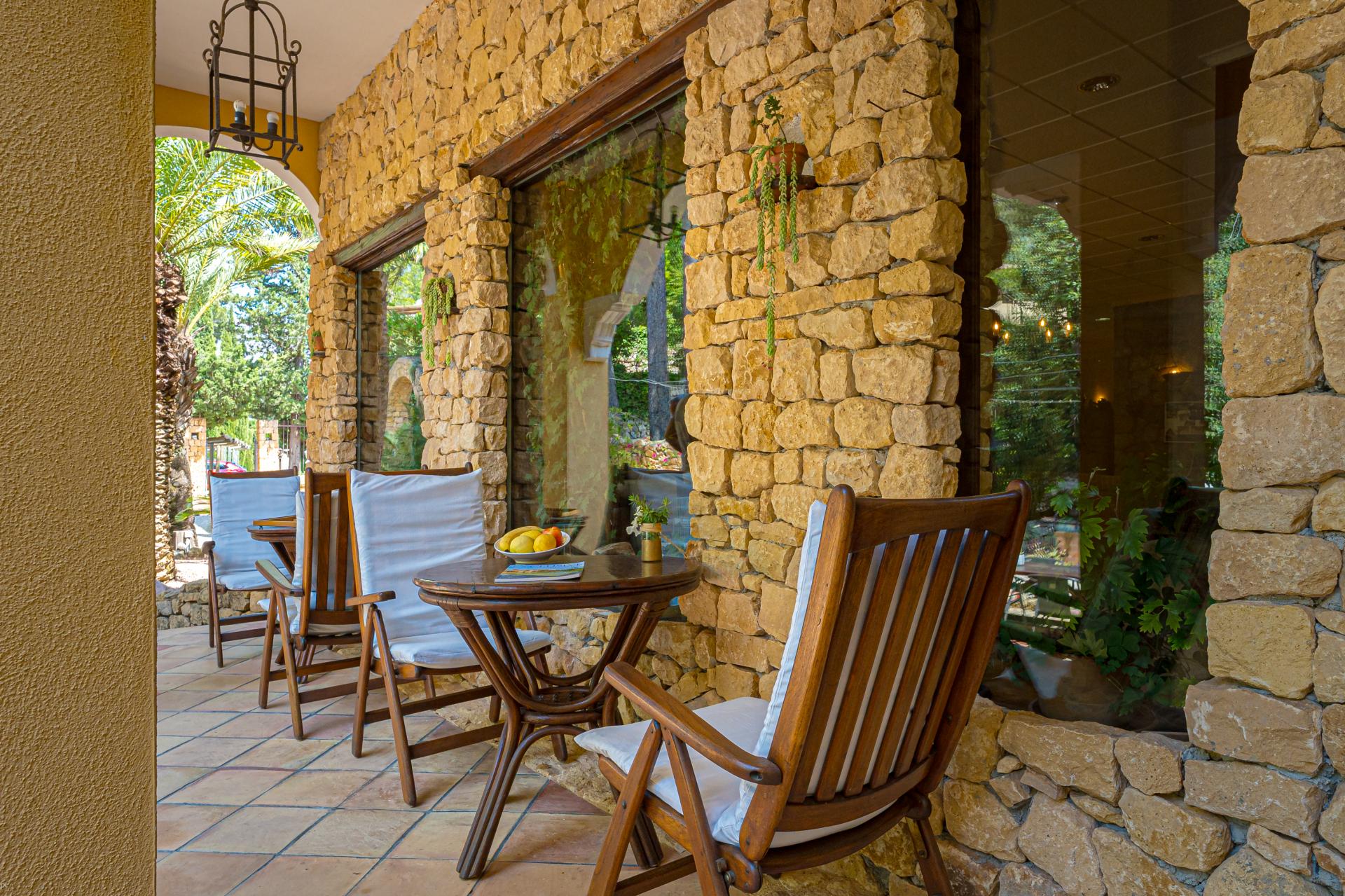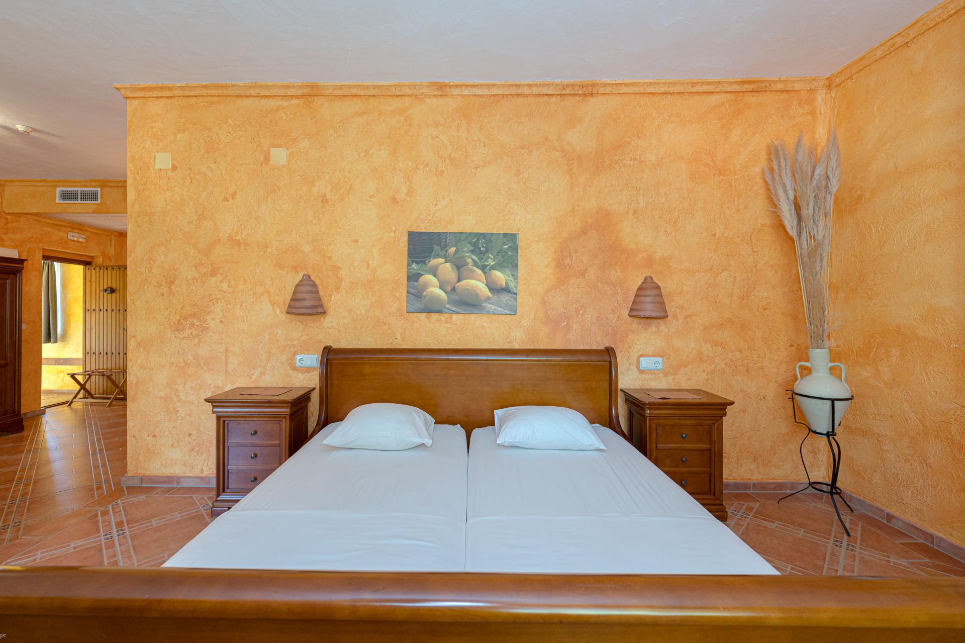 The main house is a grand yet welcoming villa, brimming with rustic elegance and classic warmth. Terracotta tiles underfoot and timber-beamed ceilings speak to its heritage, while modern comforts are woven subtly throughout. The eight bedroom suites, each with their own bathrooms and quiet seating areas or balconies, are designed for privacy and peace. Shared spaces are expansive, yet soulful—lounges for storytelling, dining areas that stretch into the garden, and a beautiful indoor bar for winter evenings by candlelight. The guest finca, just a short stroll away, offers four further ensuite bedrooms, rustic lounges, and its own bar and pergola terrace—an ideal setting for long lunches, private stays, or memorable family events. And yet, the true magic lies in the moments between: a carved bench under a fig tree, a morning coffee on a shaded veranda, the quiet hush of dusk as birds settle in the trees. This is a home that reveals itself slowly and rewards those who linger.