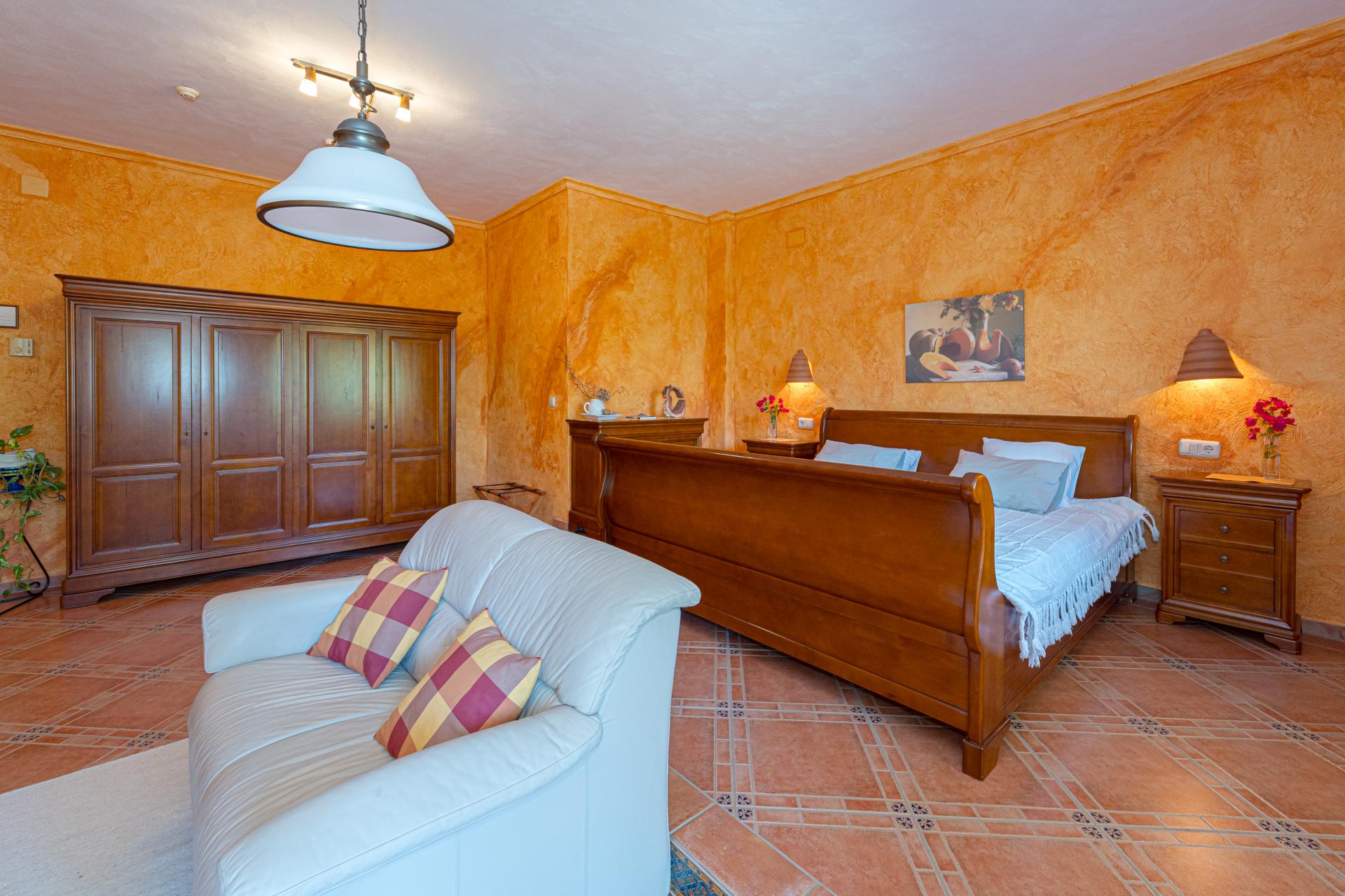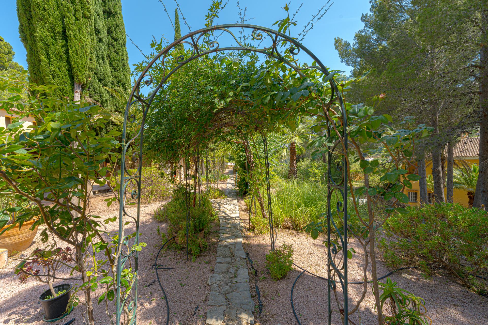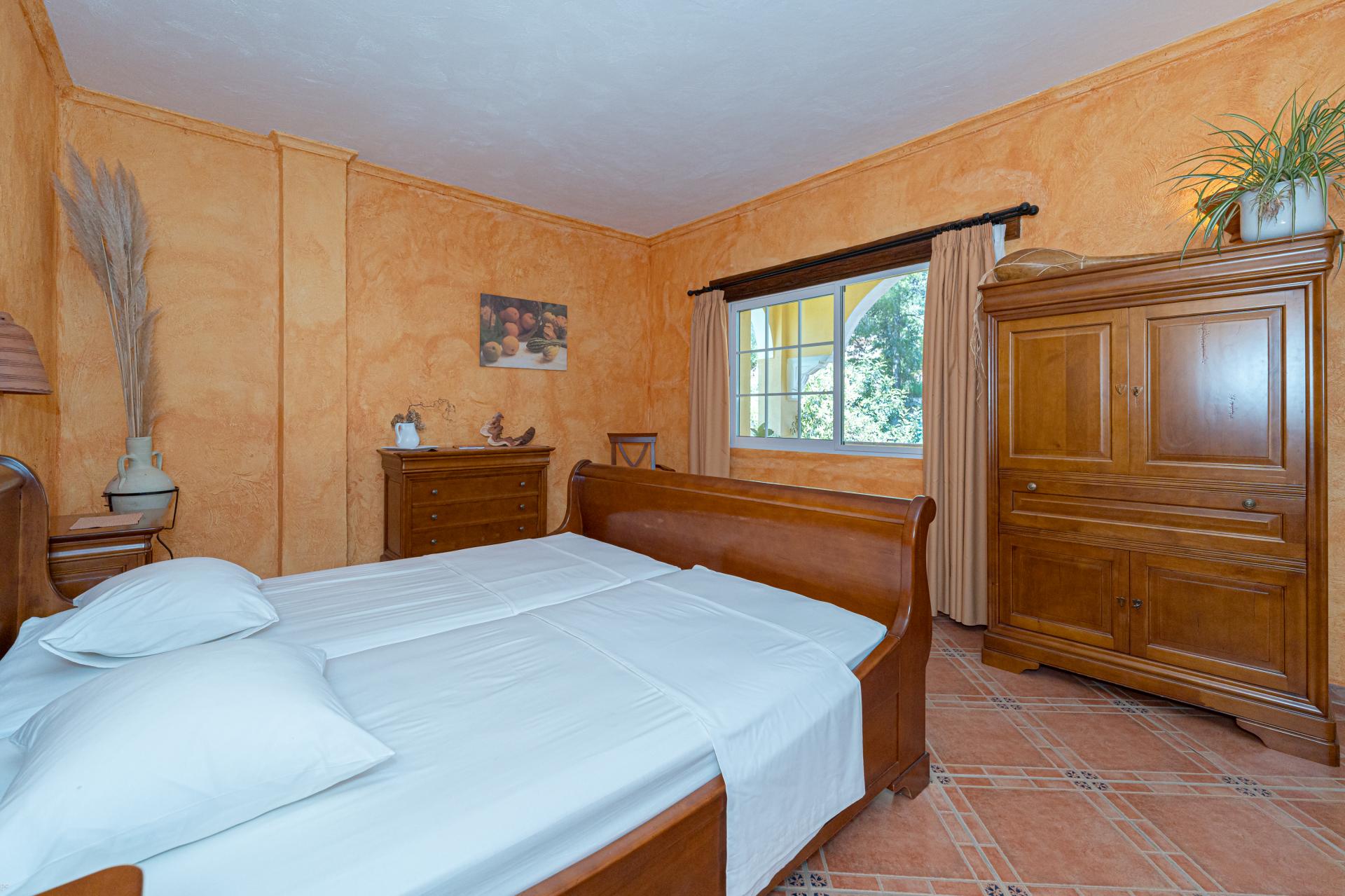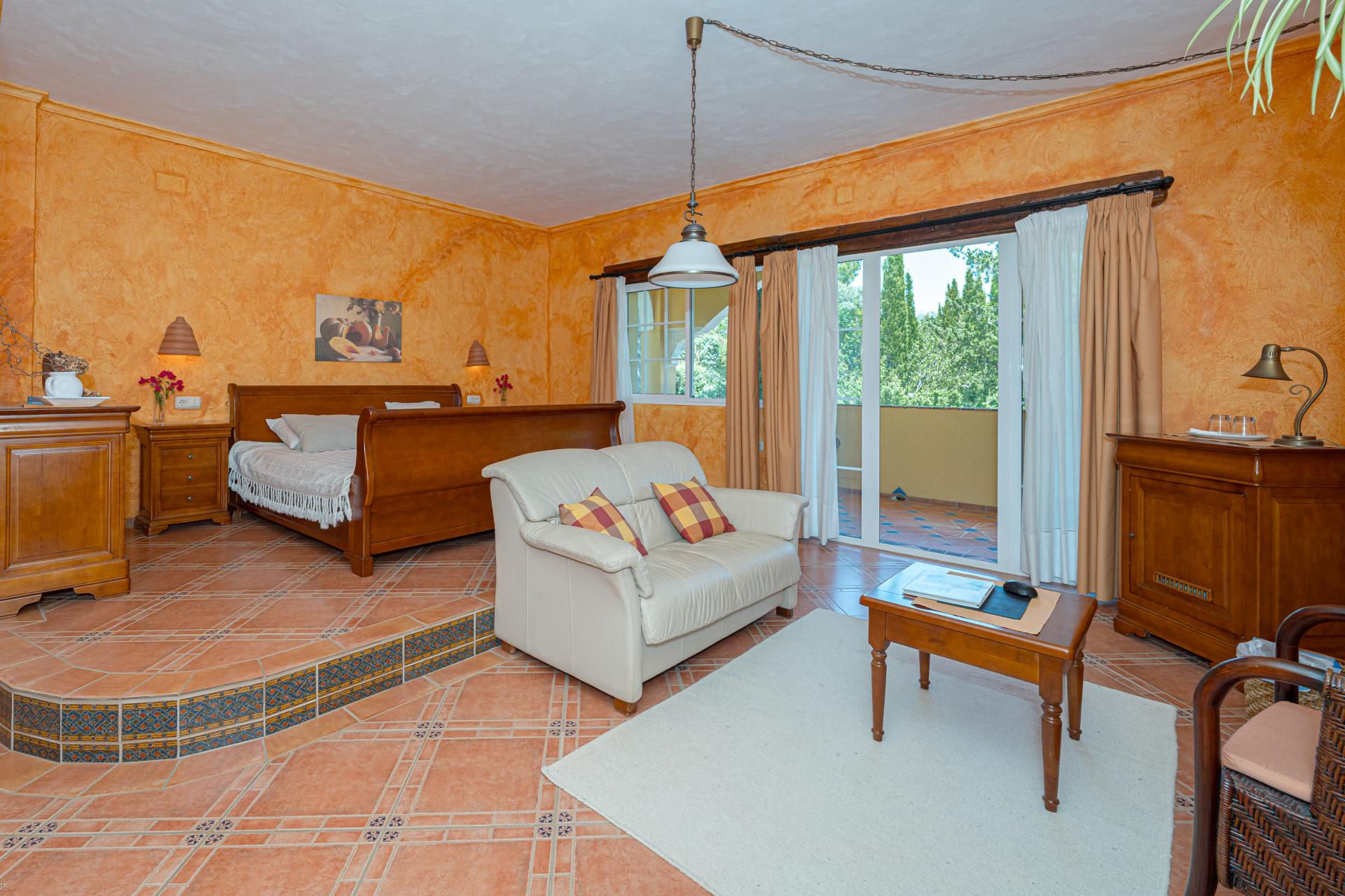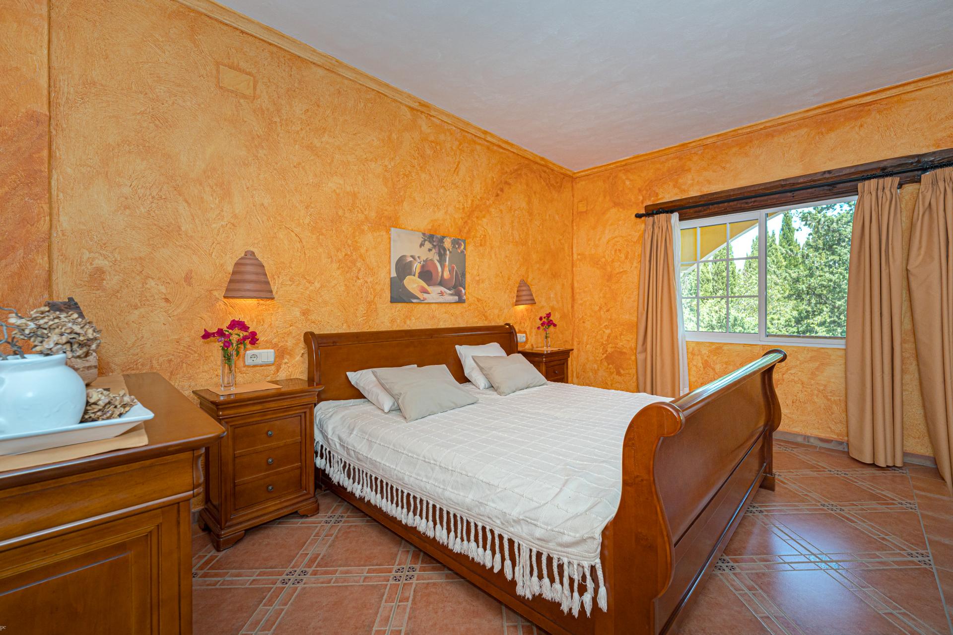 The main house is a grand yet welcoming villa, brimming with rustic elegance and classic warmth. Terracotta tiles underfoot and timber-beamed ceilings speak to its heritage, while modern comforts are woven subtly throughout. The eight bedroom suites, each with their own bathrooms and quiet seating areas or balconies, are designed for privacy and peace. Shared spaces are expansive, yet soulful—lounges for storytelling, dining areas that stretch into the garden, and a beautiful indoor bar for winter evenings by candlelight. The guest finca, just a short stroll away, offers four further ensuite bedrooms, rustic lounges, and its own bar and pergola terrace—an ideal setting for long lunches, private stays, or memorable family events. And yet, the true magic lies in the moments between: a carved bench under a fig tree, a morning coffee on a shaded veranda, the quiet hush of dusk as birds settle in the trees. This is a home that reveals itself slowly and rewards those who linger.