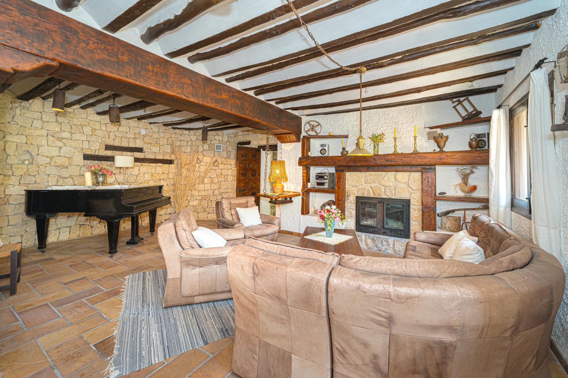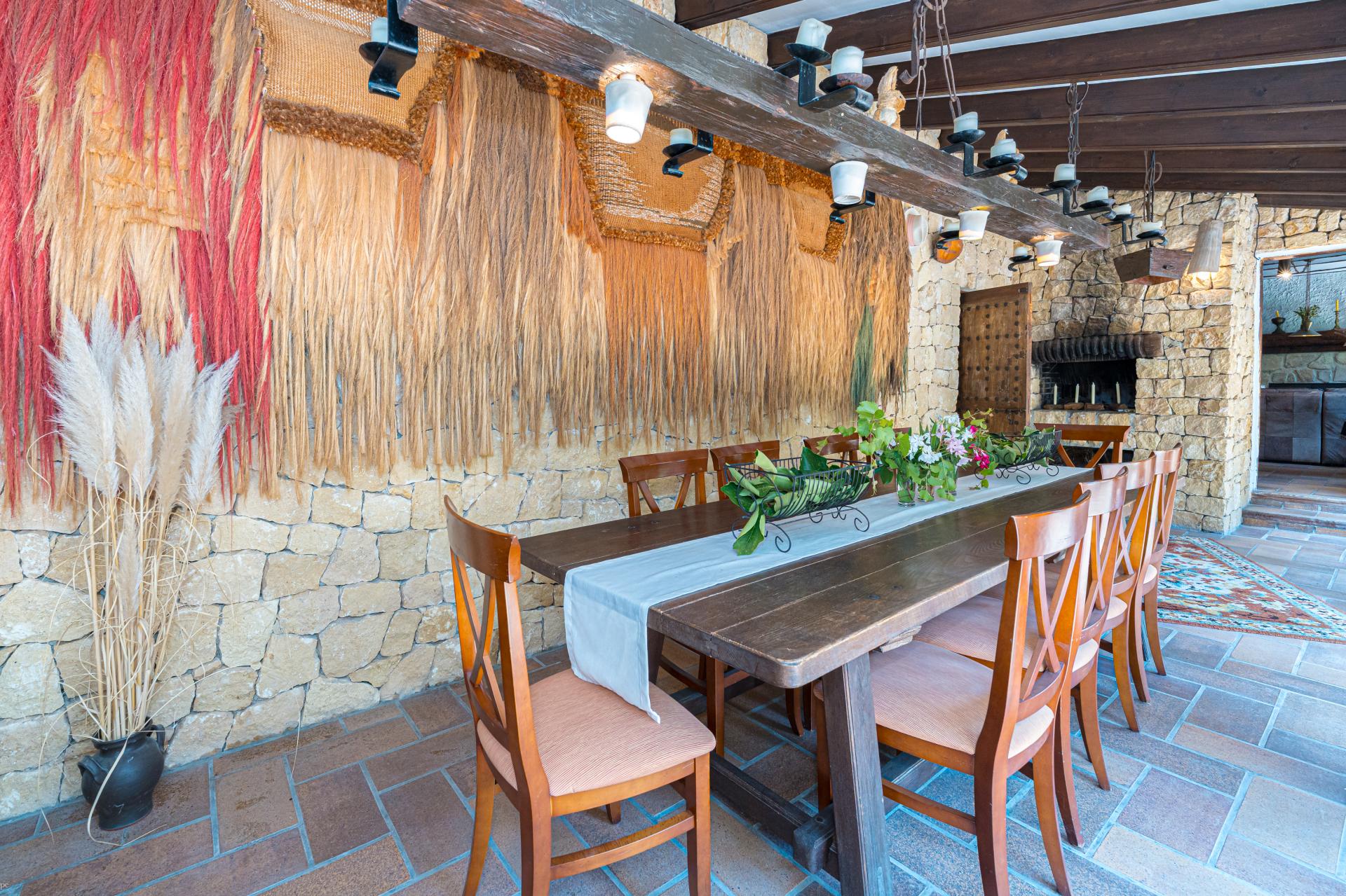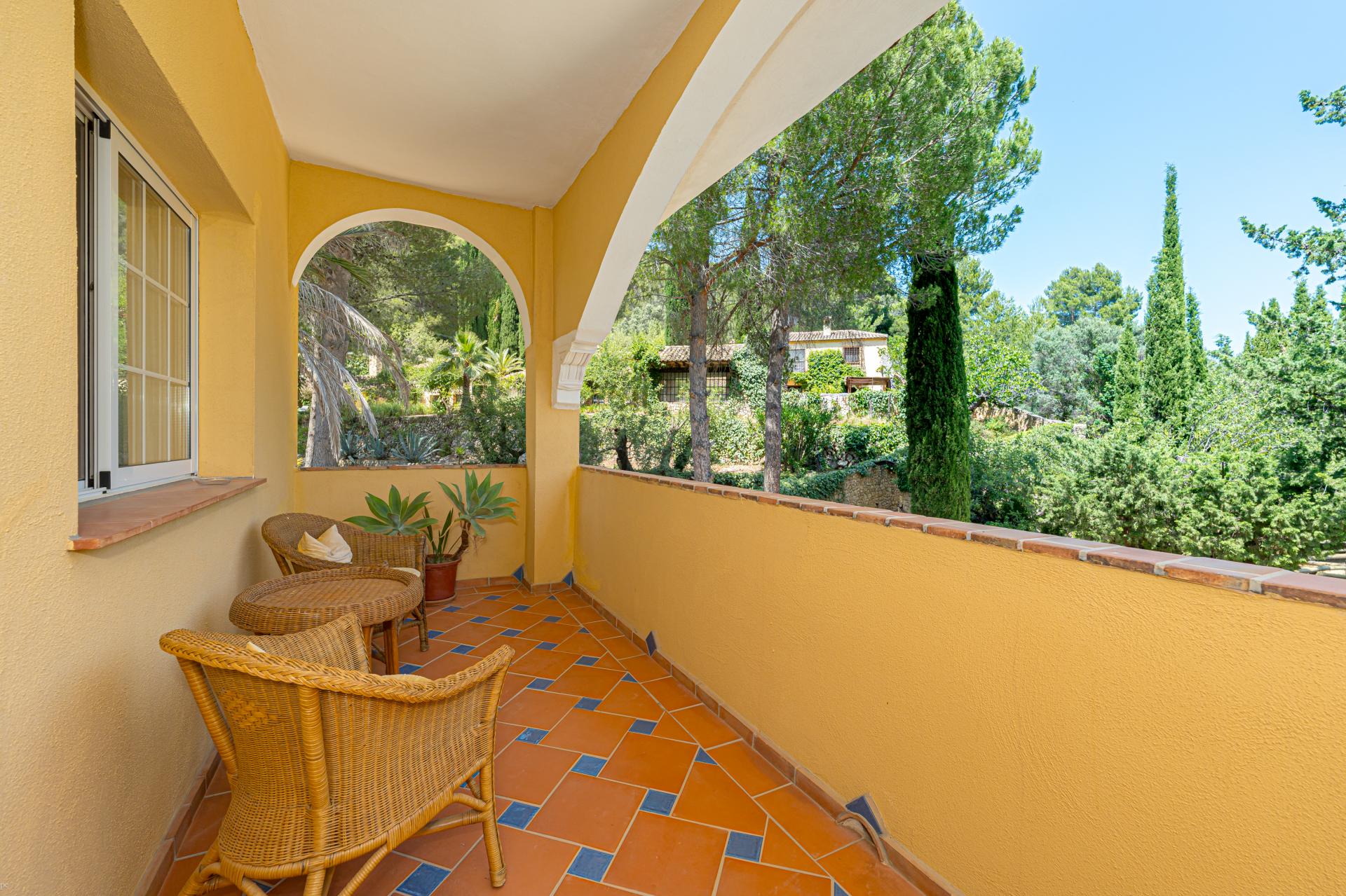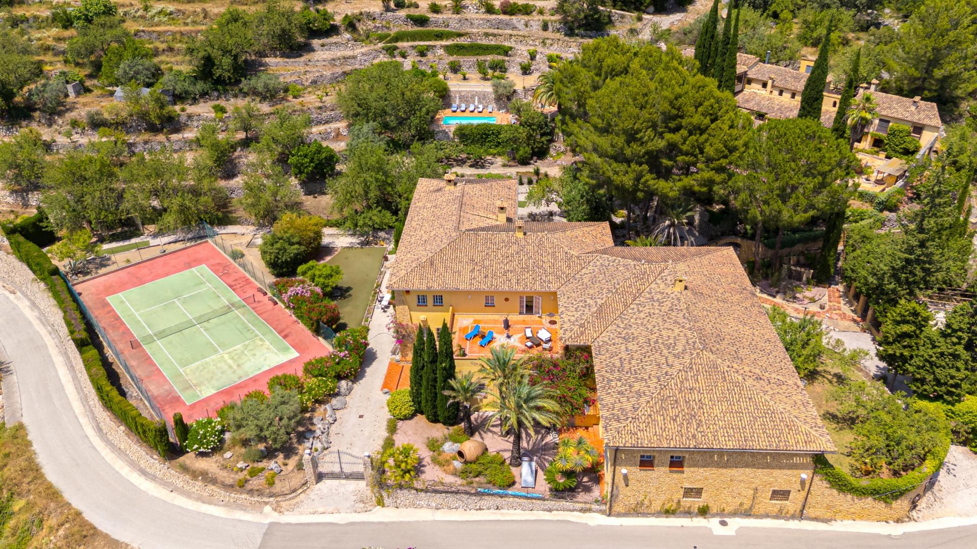 The main house is a grand yet welcoming villa, brimming with rustic elegance and classic warmth. Terracotta tiles underfoot and timber-beamed ceilings speak to its heritage, while modern comforts are woven subtly throughout. The eight bedroom suites, each with their own bathrooms and quiet seating areas or balconies, are designed for privacy and peace. Shared spaces are expansive, yet soulful—lounges for storytelling, dining areas that stretch into the garden, and a beautiful indoor bar for winter evenings by candlelight. The guest finca, just a short stroll away, offers four further ensuite bedrooms, rustic lounges, and its own bar and pergola terrace—an ideal setting for long lunches, private stays, or memorable family events. And yet, the true magic lies in the moments between: a carved bench under a fig tree, a morning coffee on a shaded veranda, the quiet hush of dusk as birds settle in the trees. This is a home that reveals itself slowly and rewards those who linger.