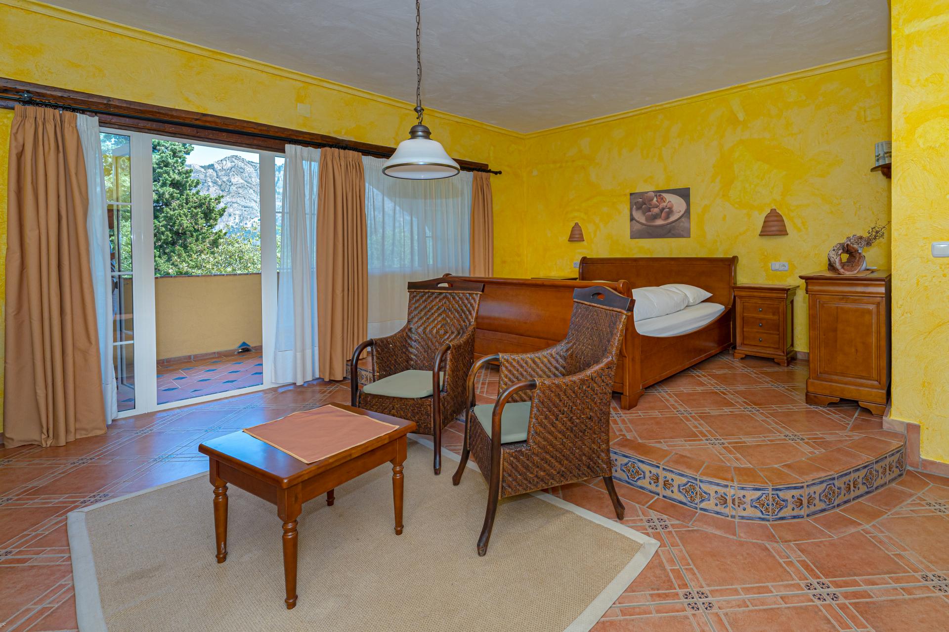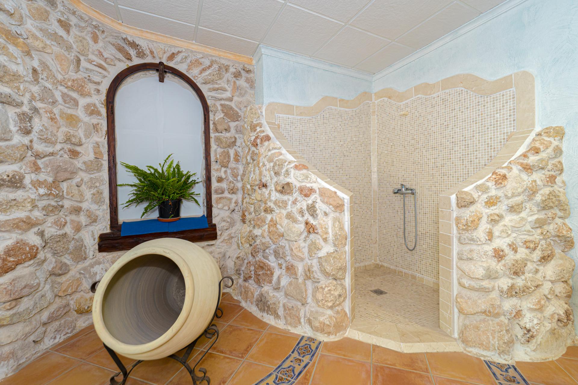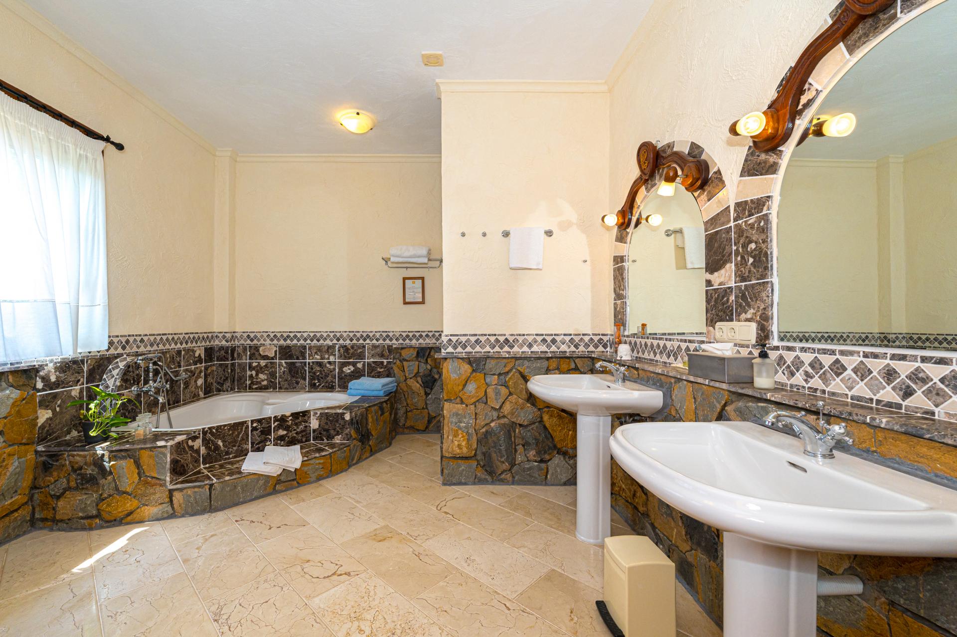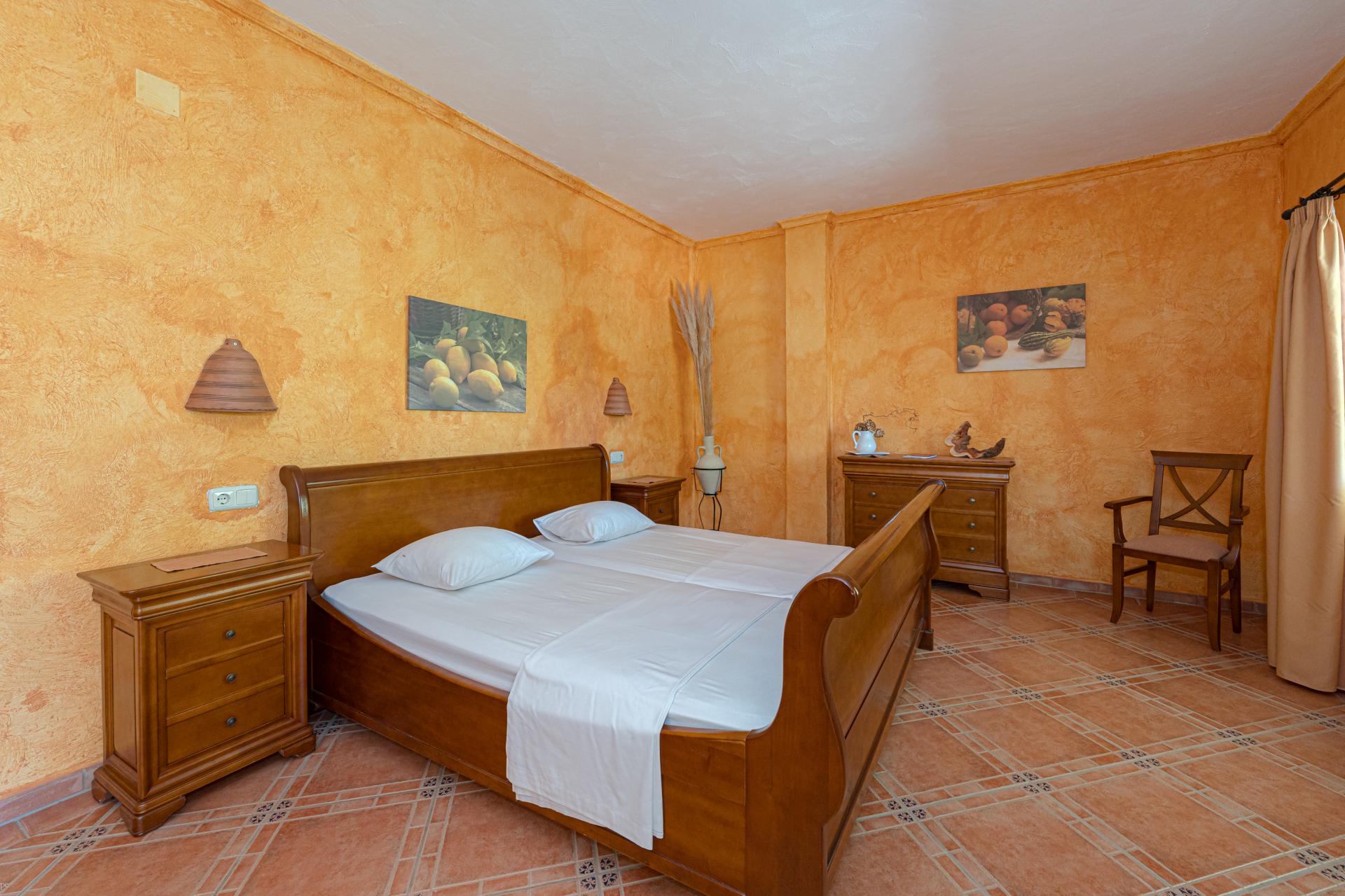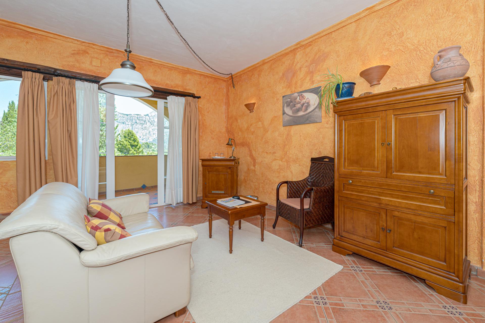 The main house is a grand yet welcoming villa, brimming with rustic elegance and classic warmth. Terracotta tiles underfoot and timber-beamed ceilings speak to its heritage, while modern comforts are woven subtly throughout. The eight bedroom suites, each with their own bathrooms and quiet seating areas or balconies, are designed for privacy and peace. Shared spaces are expansive, yet soulful—lounges for storytelling, dining areas that stretch into the garden, and a beautiful indoor bar for winter evenings by candlelight. The guest finca, just a short stroll away, offers four further ensuite bedrooms, rustic lounges, and its own bar and pergola terrace—an ideal setting for long lunches, private stays, or memorable family events. And yet, the true magic lies in the moments between: a carved bench under a fig tree, a morning coffee on a shaded veranda, the quiet hush of dusk as birds settle in the trees. This is a home that reveals itself slowly and rewards those who linger.