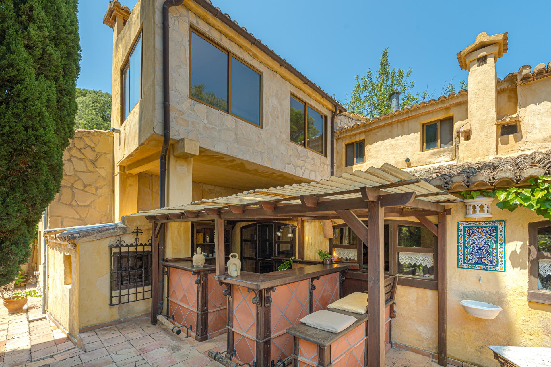 TO GATHER, TO CELEBRATE, TO LIVE FULLY Few homes offer the natural flow of space for entertaining that this one does. Life here moves seamlessly between indoors and out, formal and relaxed, public and private. The central courtyard, shaded by towering palms and encircled by stone arcades, becomes the heart of every gathering—whether it’s a spontaneous aperitif or a candlelit wedding banquet. The outdoor bar and built-in BBQ make hosting a joy, while the garden seating areas—dappled with light, bordered by flowers—offer space for conversation, games, or simply basking in the stillness of the day. Inside, the bar and lounge area invite laughter and music on cooler evenings, while smaller nooks and alcoves provide space for reflection or retreat.