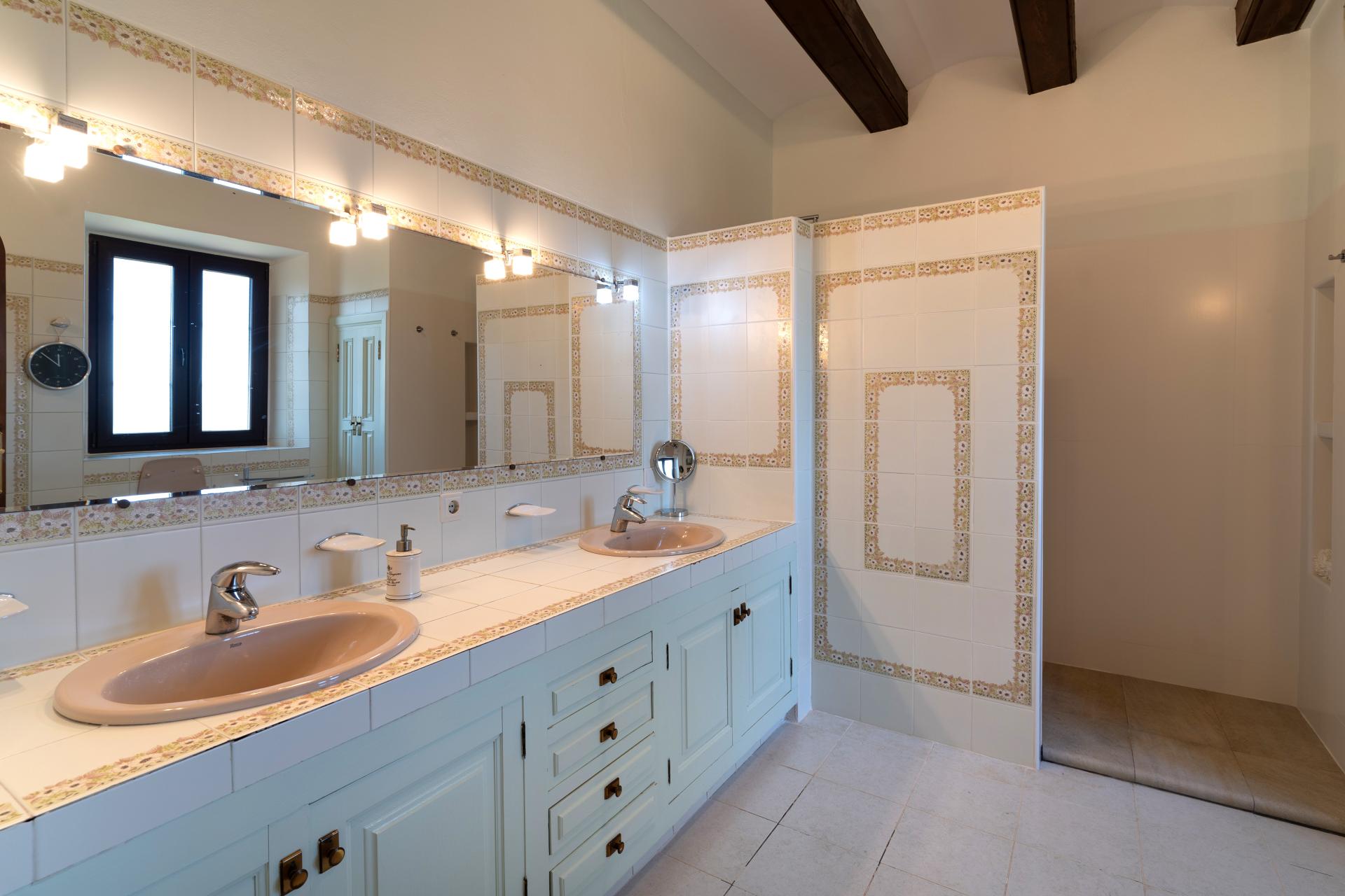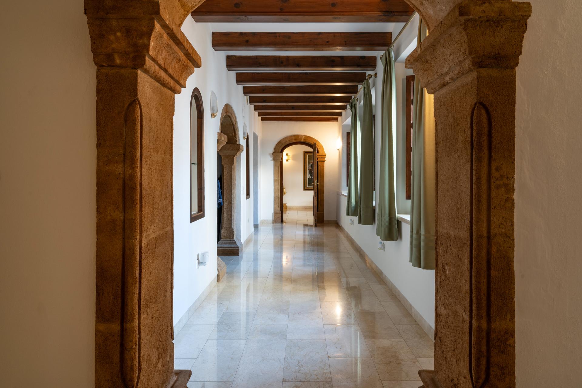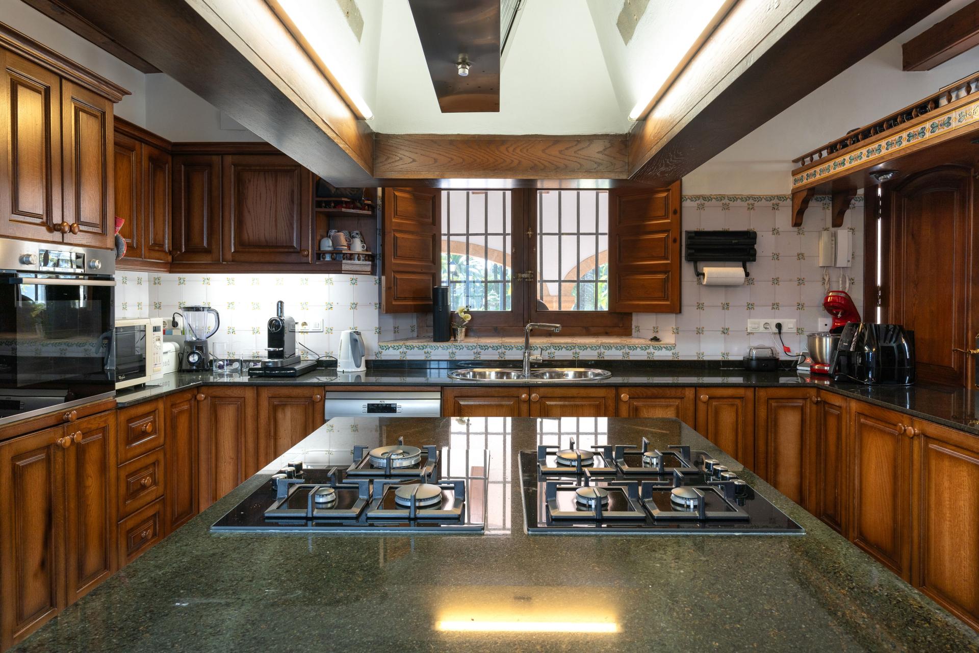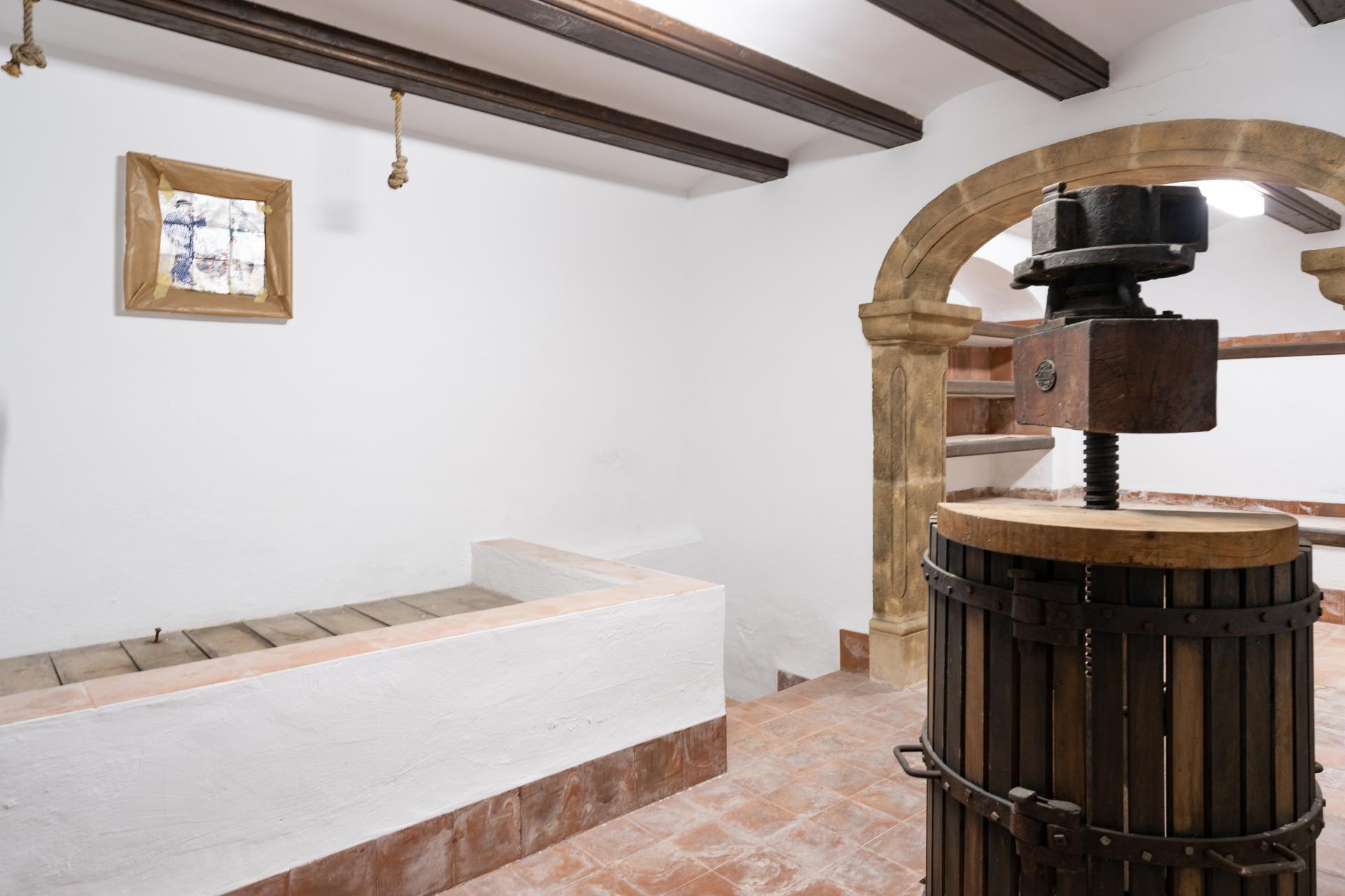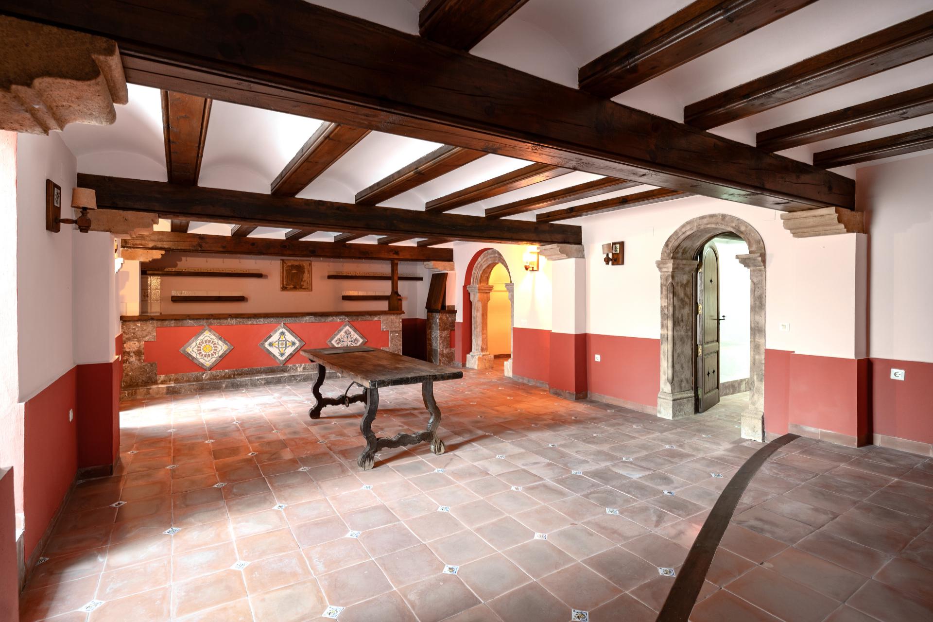 Interior Layout With over 1,000m² of living space, the villa offers generous proportions and exceptional flow. The main residence features 13 spacious bedrooms and several formal and informal living rooms, each accented by soaring beamed ceilings, hand-crafted woodwork, and intricate stone detailing. A grand dining room flows seamlessly into the living area, where a statement fireplace anchors the room. The kitchen, traditionally styled yet fully equipped, features a large central island and charming tilework. The wine bodega, situated in a genuine basement, adds an exclusive and functional dimension to the home’s entertaining potential.