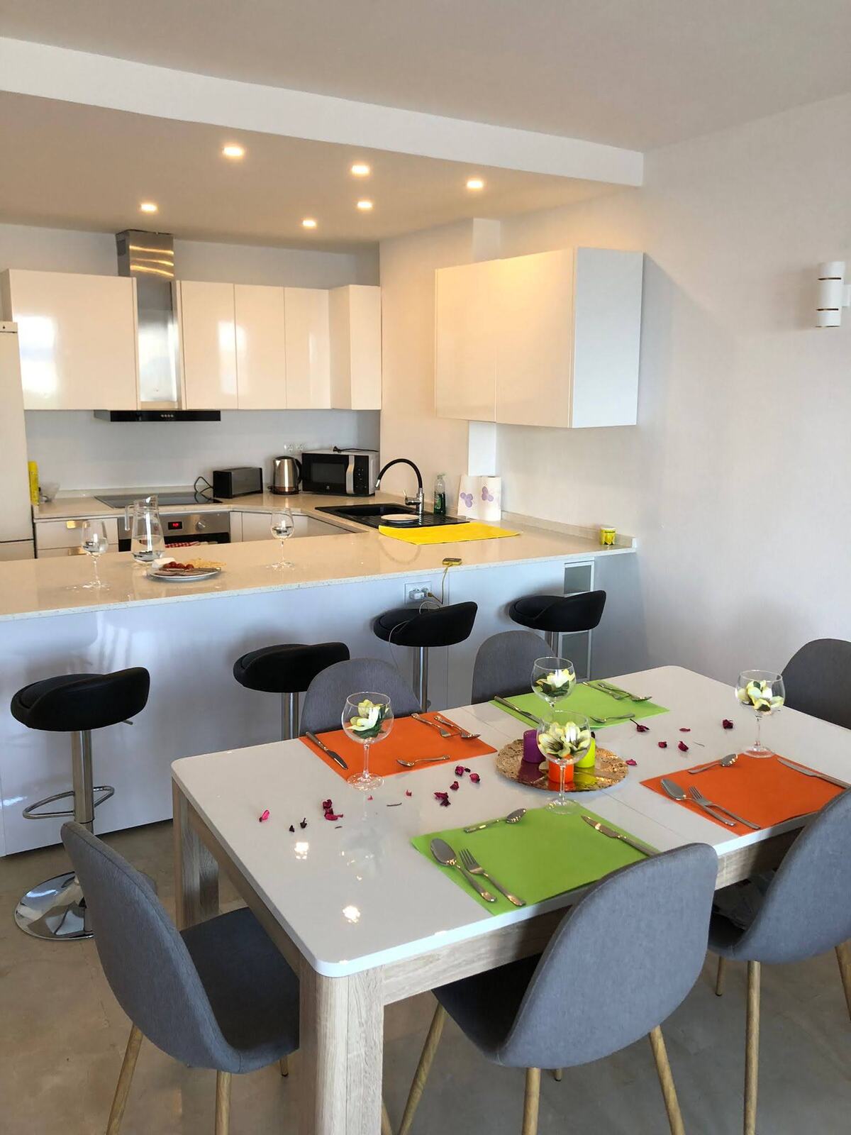 - Refurbished open-plan kitchen with sleek modern cabinetry and dining space