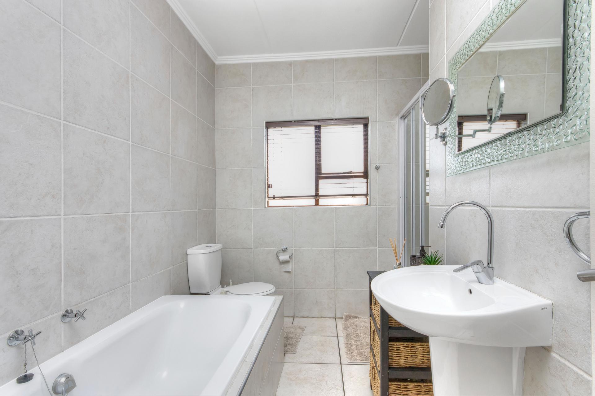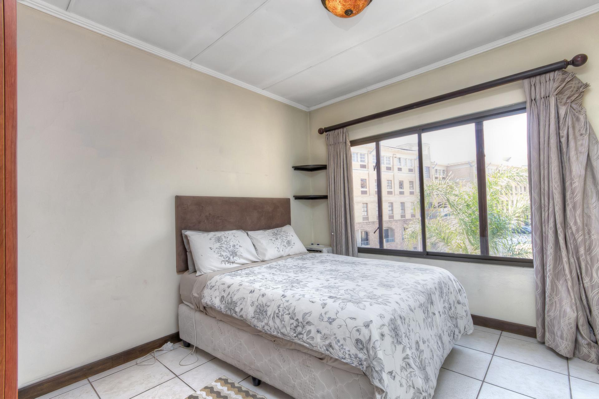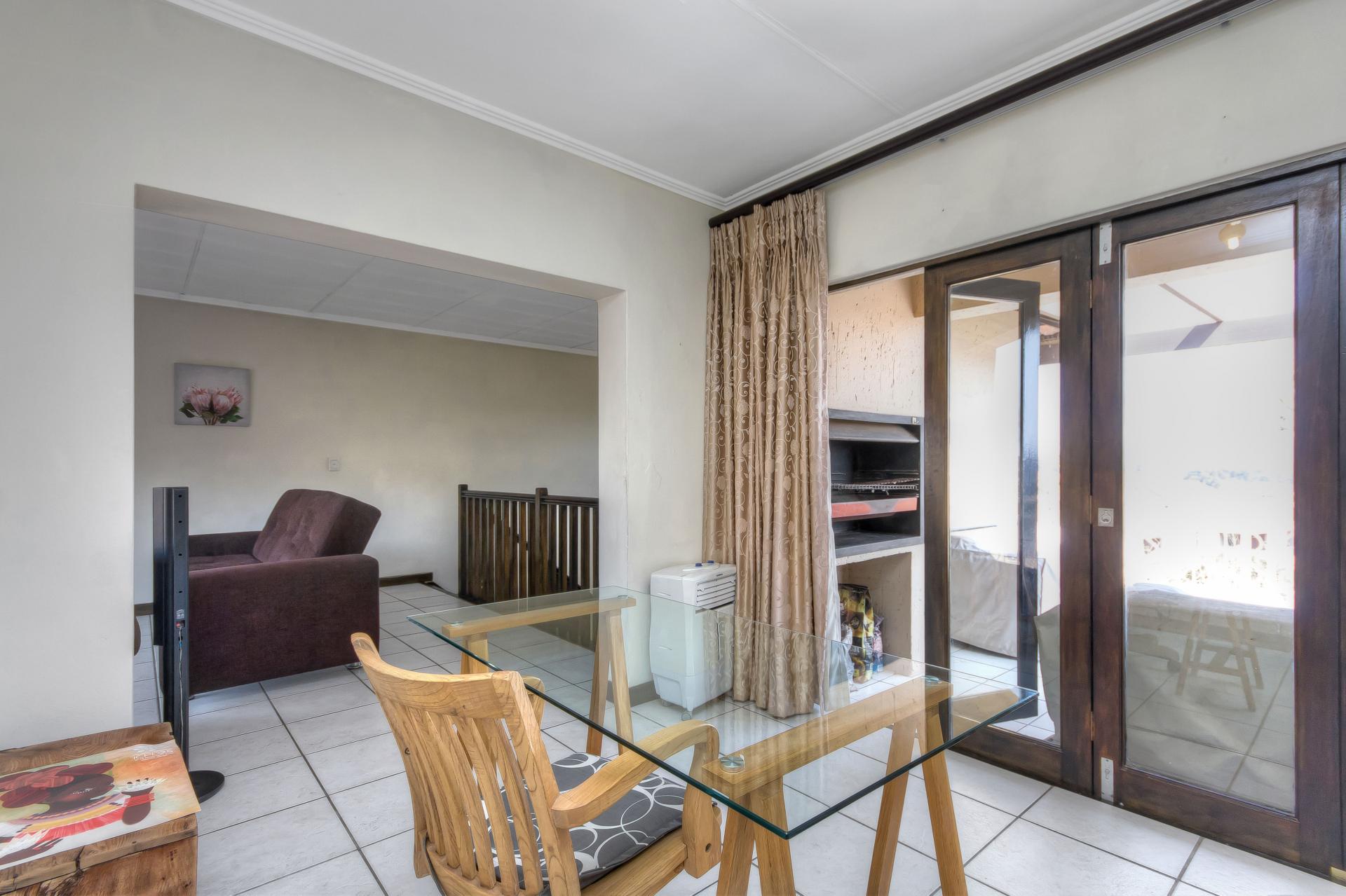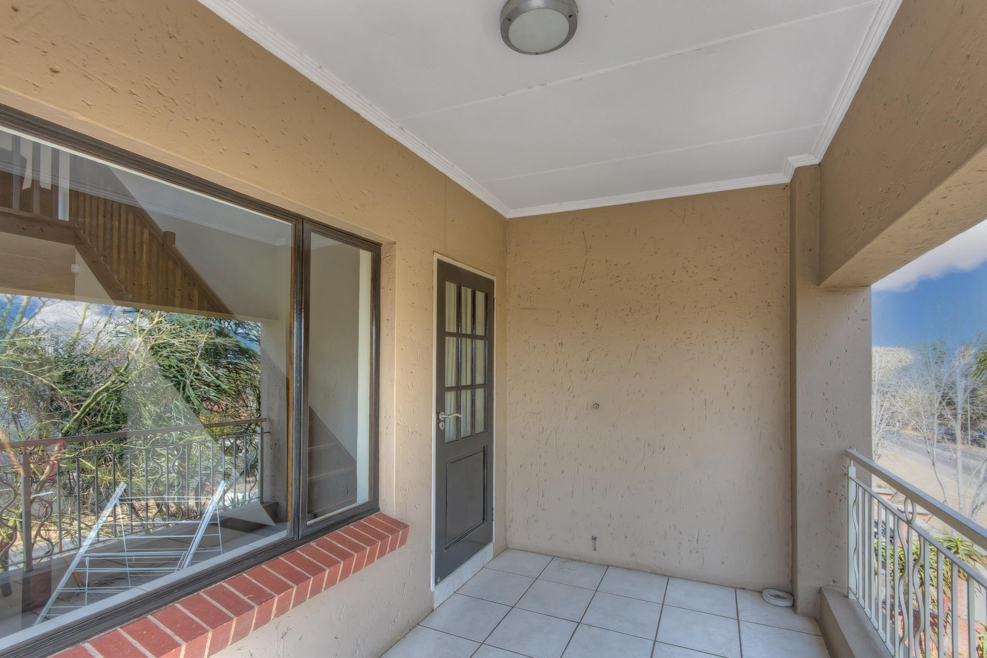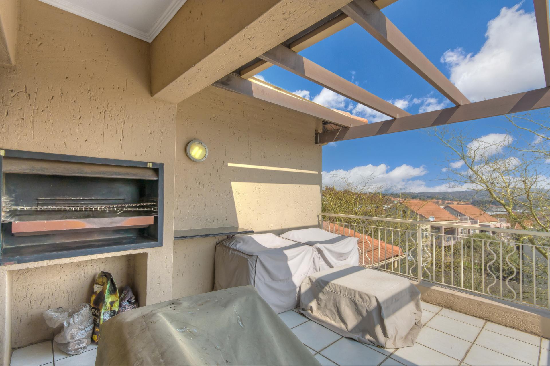 The two tiled well-sized bedrooms offer built-in cupboards and are separated by a long passage area that has a linen cupboard for extra packing space. The bathroom is a masterpiece, beautifully tiled from floor to ceiling with an ultra-modern bath, basin, toilet, and a walk-in shower. As you walk up the stairs you are greeted by a spacious lounge area that allows more space for furniture and an additional space for an office/studio facing the second bigger balcony. The balcony comes with a braai area and a large entertainment space big enough to fit outdoor furniture. The loft area also provides a cloakroom with a toilet set and shower facility.