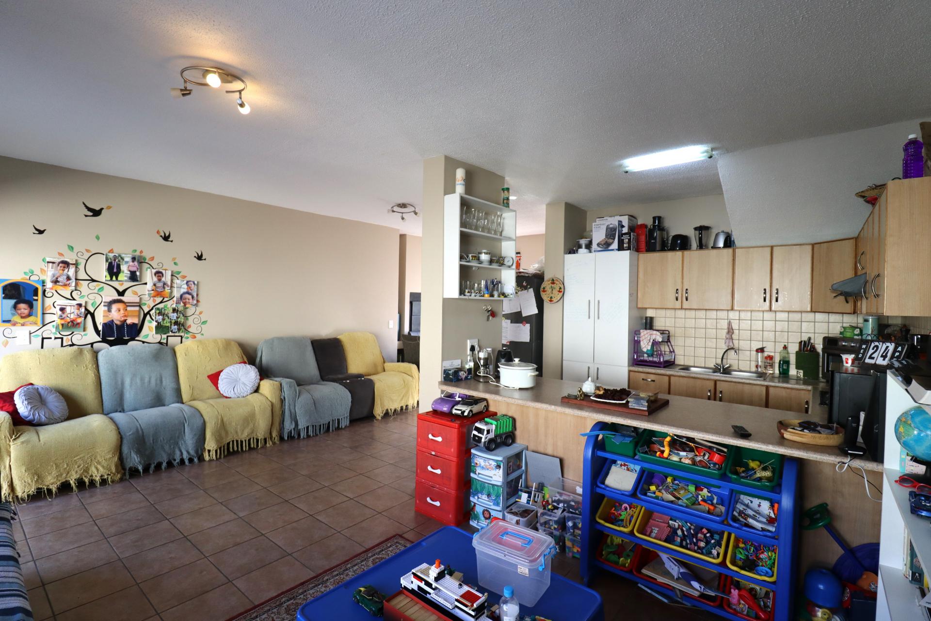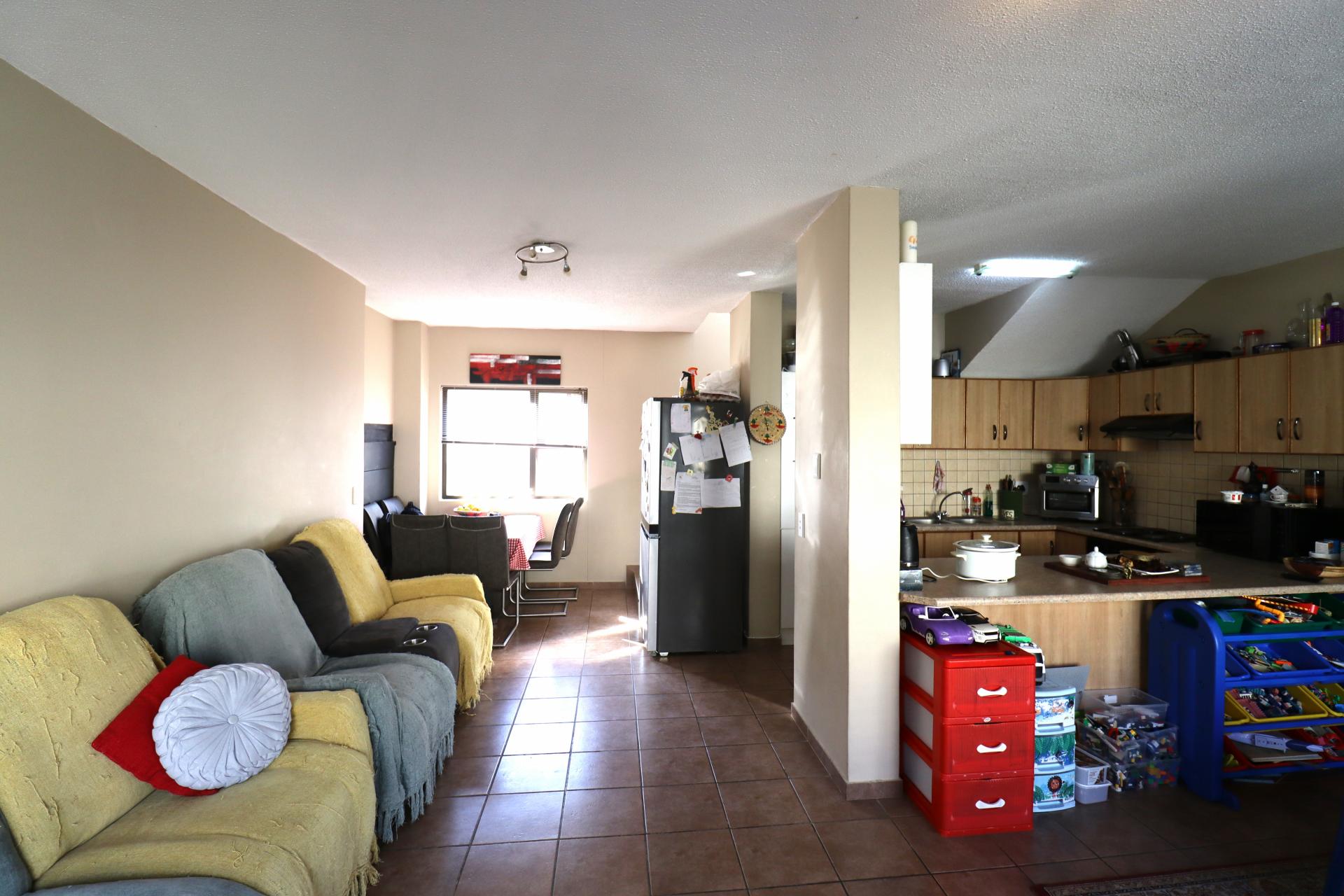 The bright open-plan living area opens onto a balcony. The open kitchen forms part of the living area with a breakfast counter and space for a small dining table.