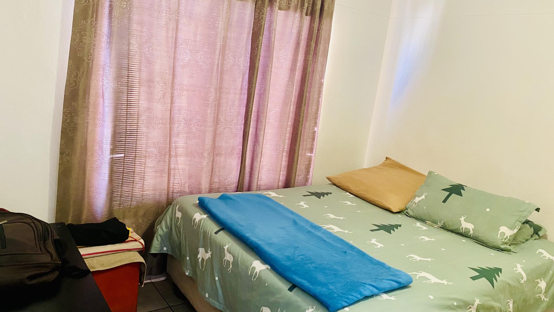 The flat features an open-plan living area with a fully fitted kitchen and a bathroom with a shower, toilet and washbasin. For added security, the front door has a security gate and burglar bars are installed on the aluminum windows. The flat also comes with a shade net carport and is located in a secure complex with a guardhouse, boundary walls and an electric fence.