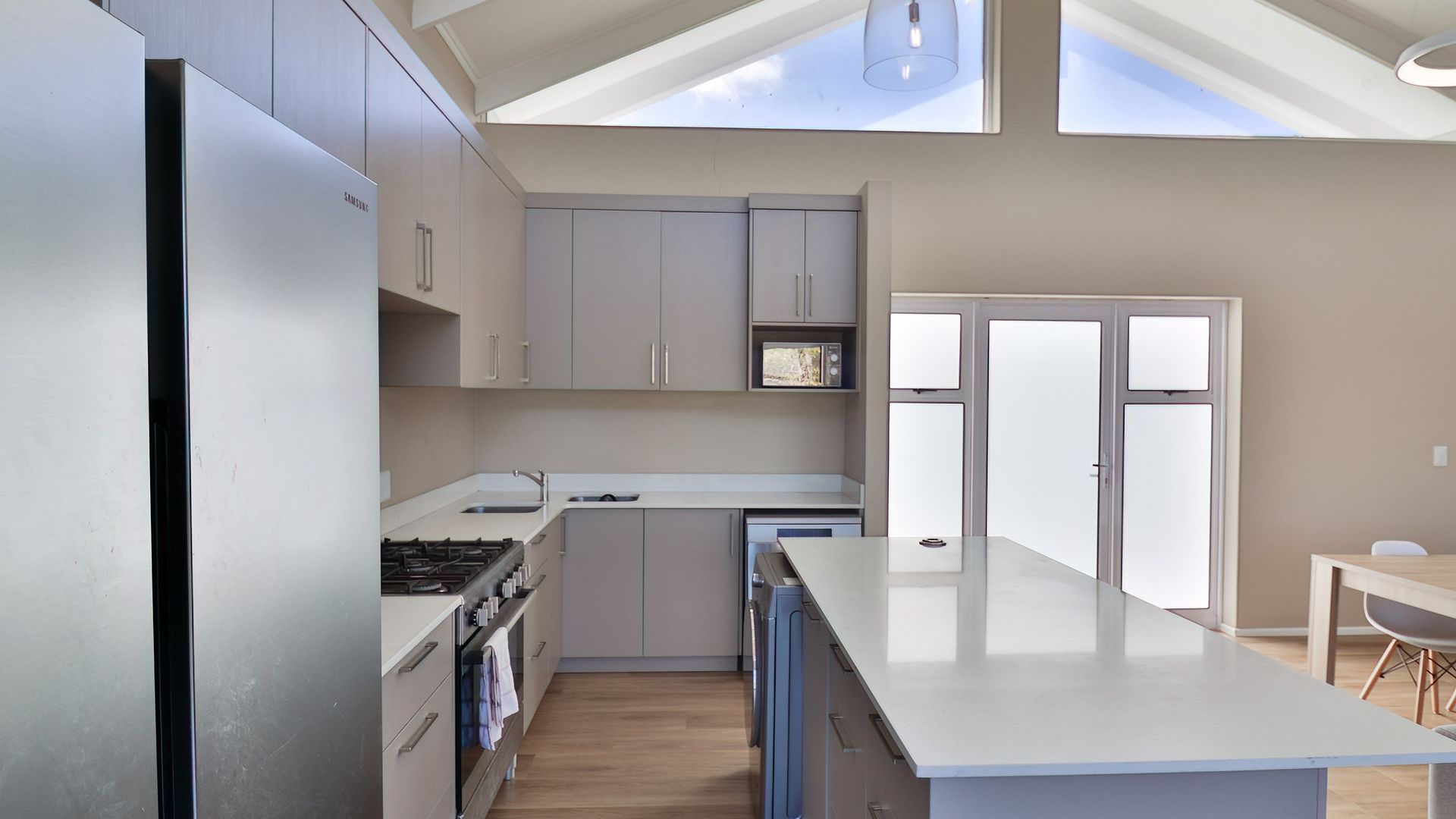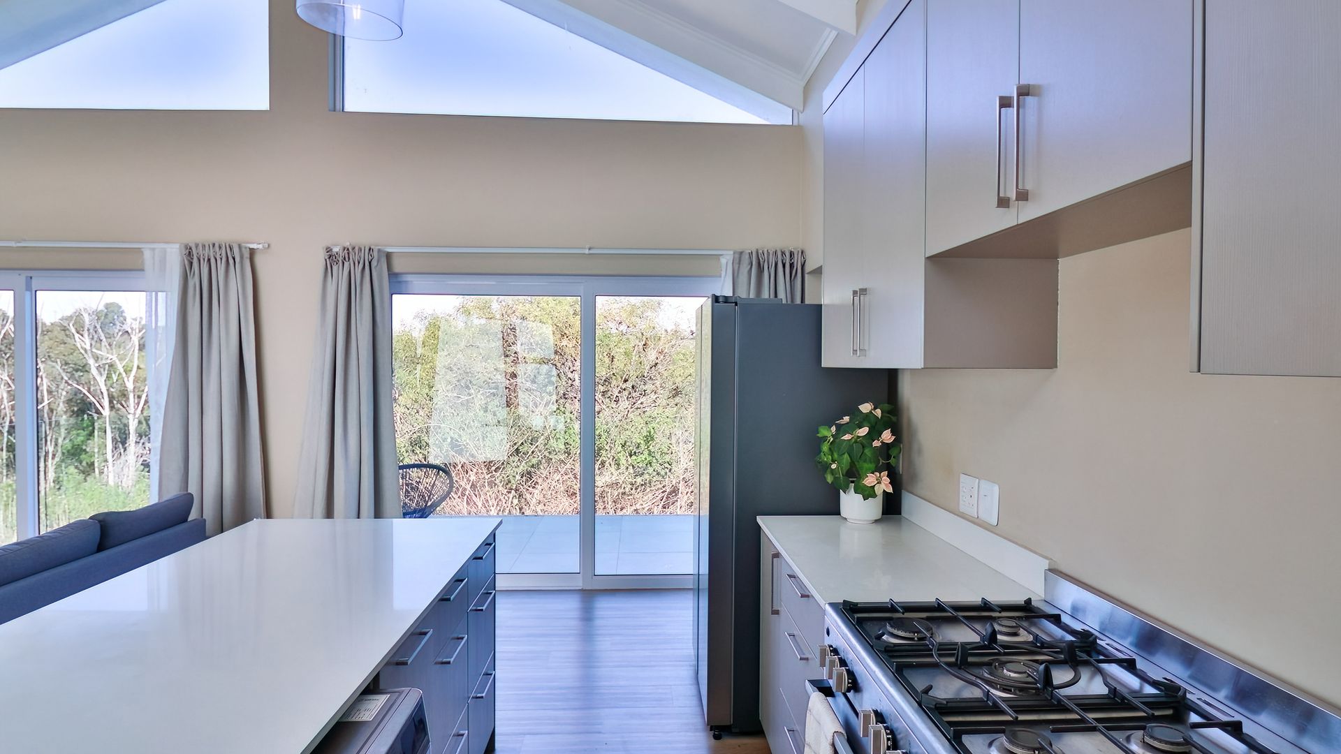 This hidden haven boasts an open-plan design, seamlessly integrating the modern kitchen, dining area, and well-appointed living room with high ceilings and windows that flood the space with natural light. The kitchen is a chef's delight, ready for your personal touch.