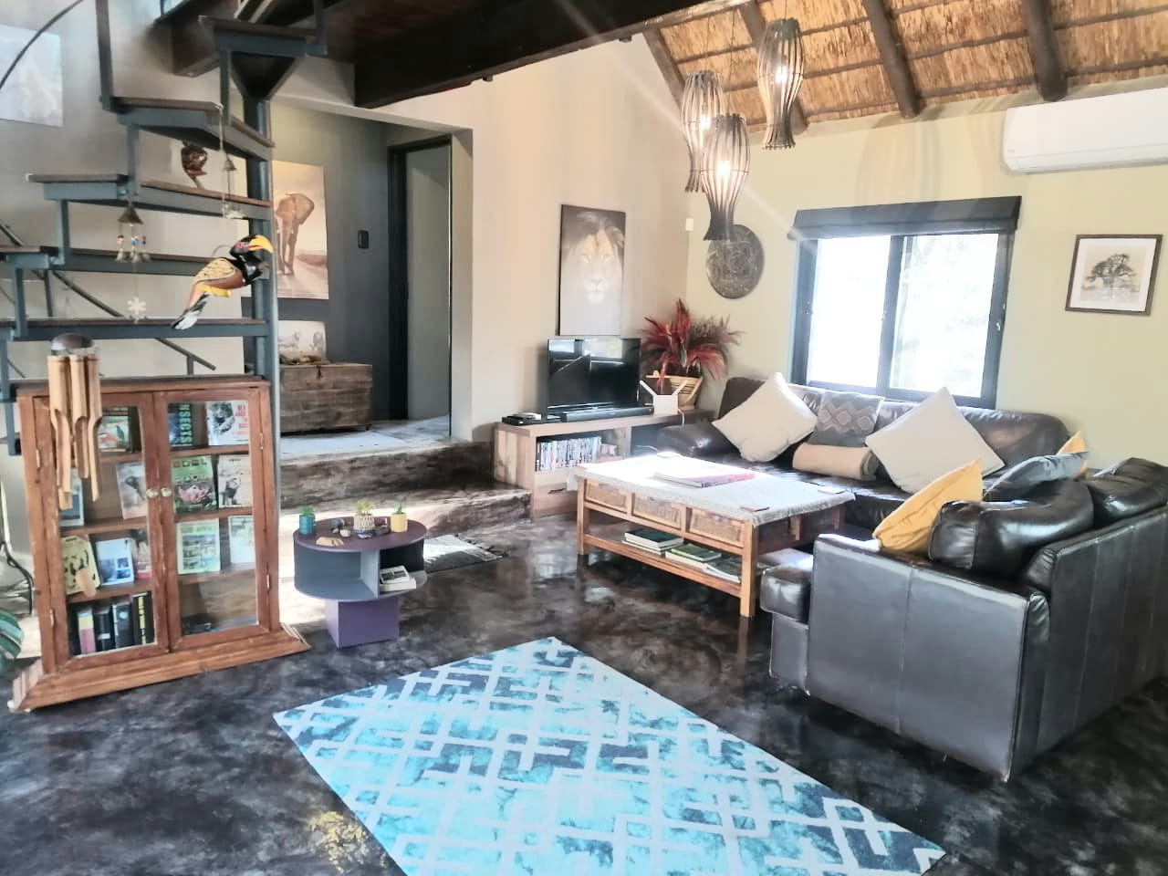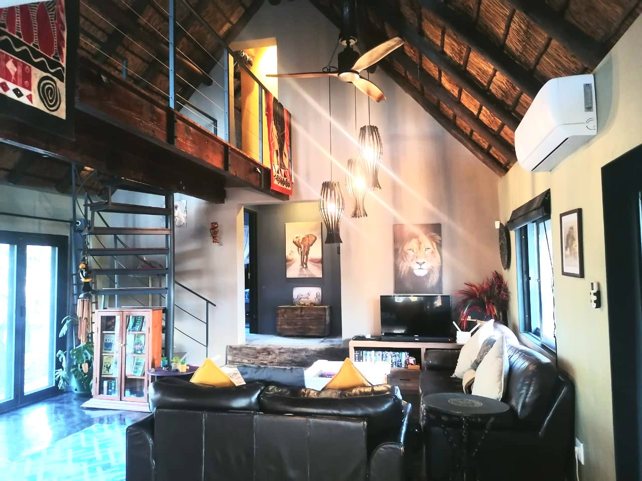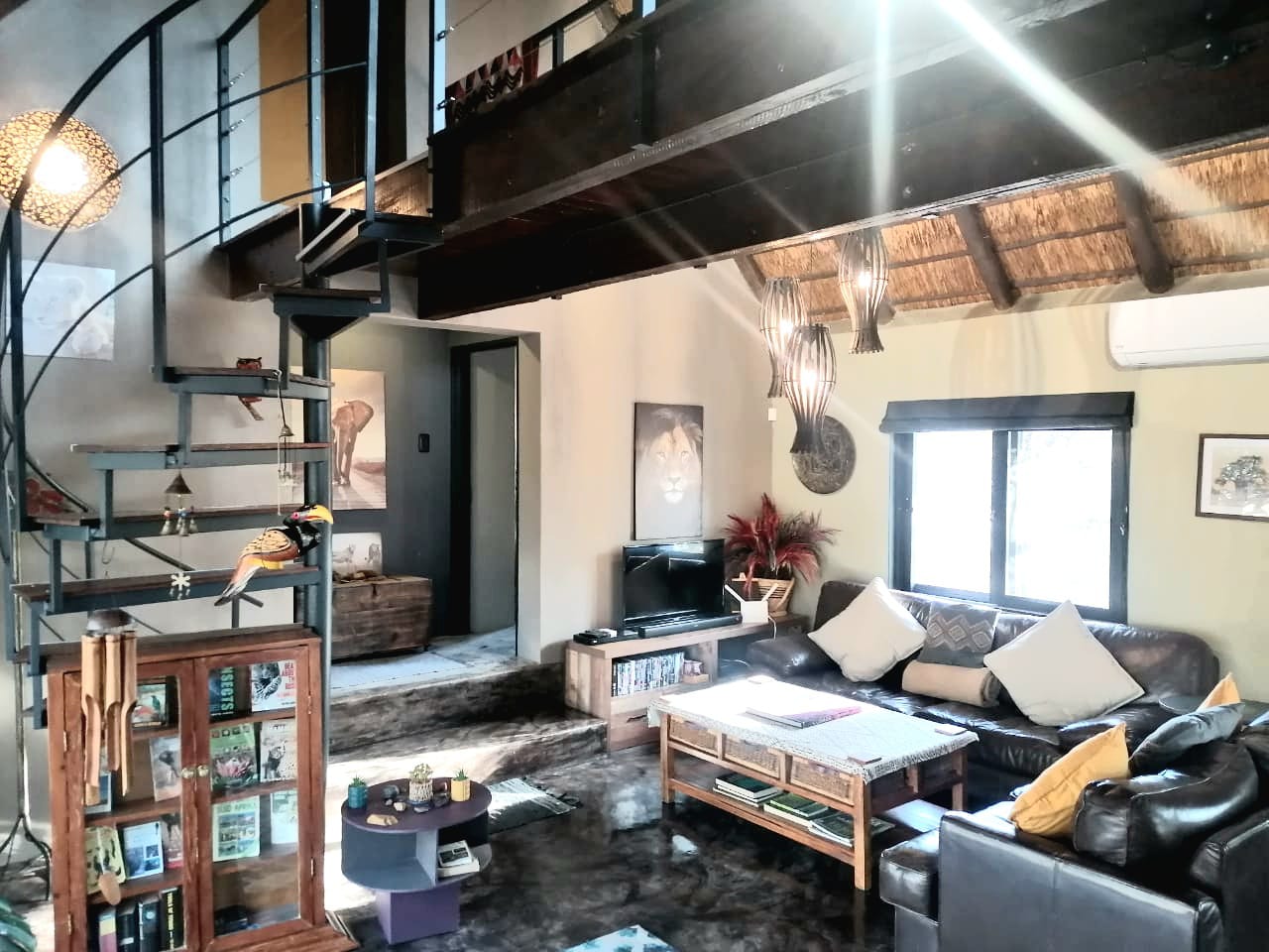 A beautiful, designed steel staircase leads to the upper level - a romantic main bedroom complete with built-in cupboards, air-conditioning, a roof fan, and a private balcony where the sounds of birdsong and distant lion roars create a truly magical atmosphere. It's like living among the treetops.