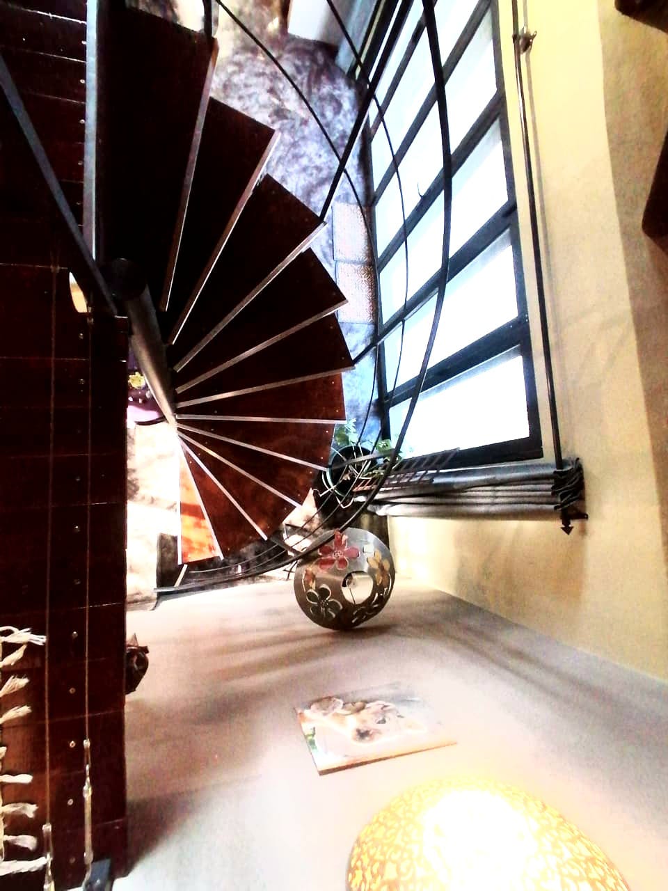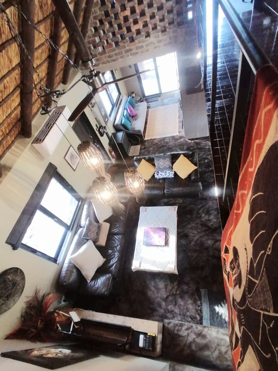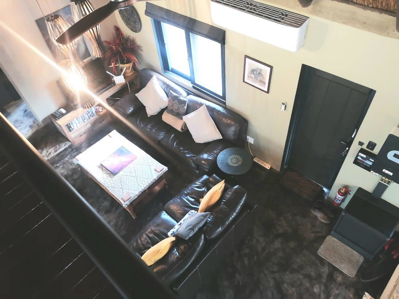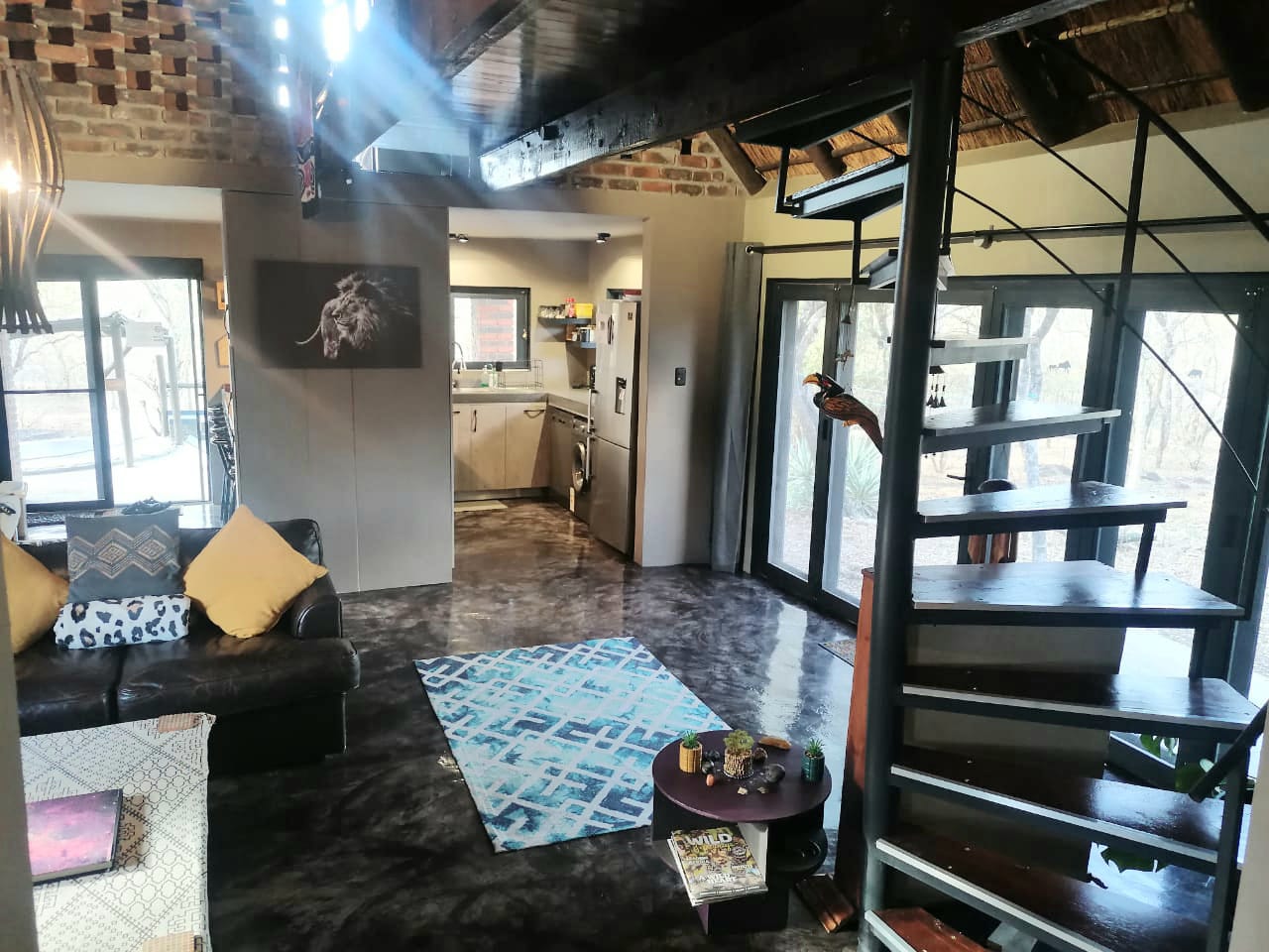 A beautiful, designed steel staircase leads to the upper level - a romantic main bedroom complete with built-in cupboards, air-conditioning, a roof fan, and a private balcony where the sounds of birdsong and distant lion roars create a truly magical atmosphere. It's like living among the treetops.