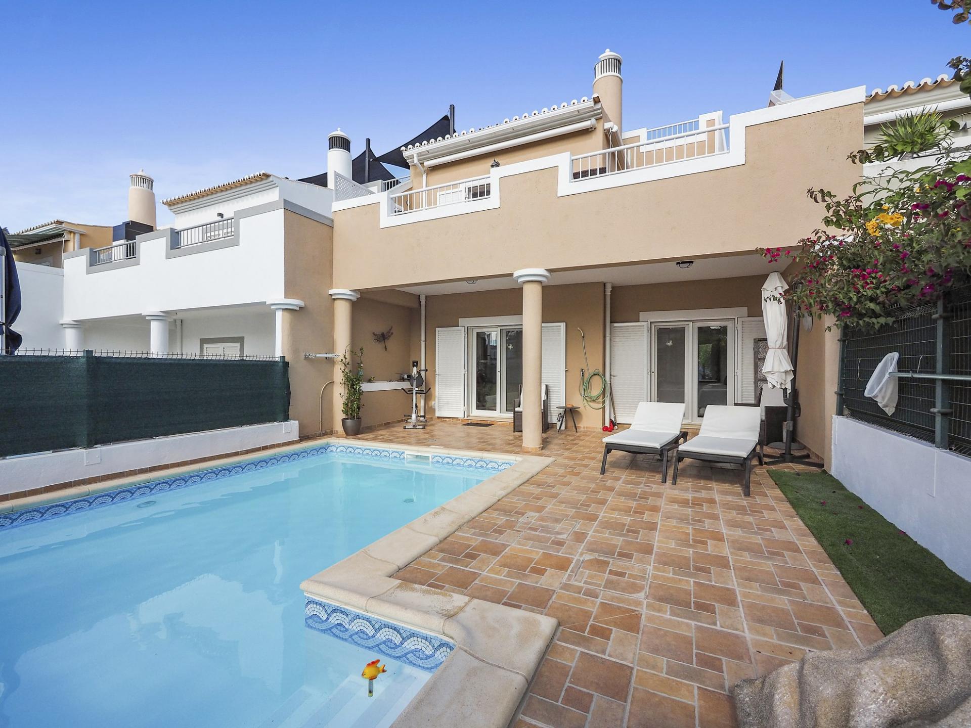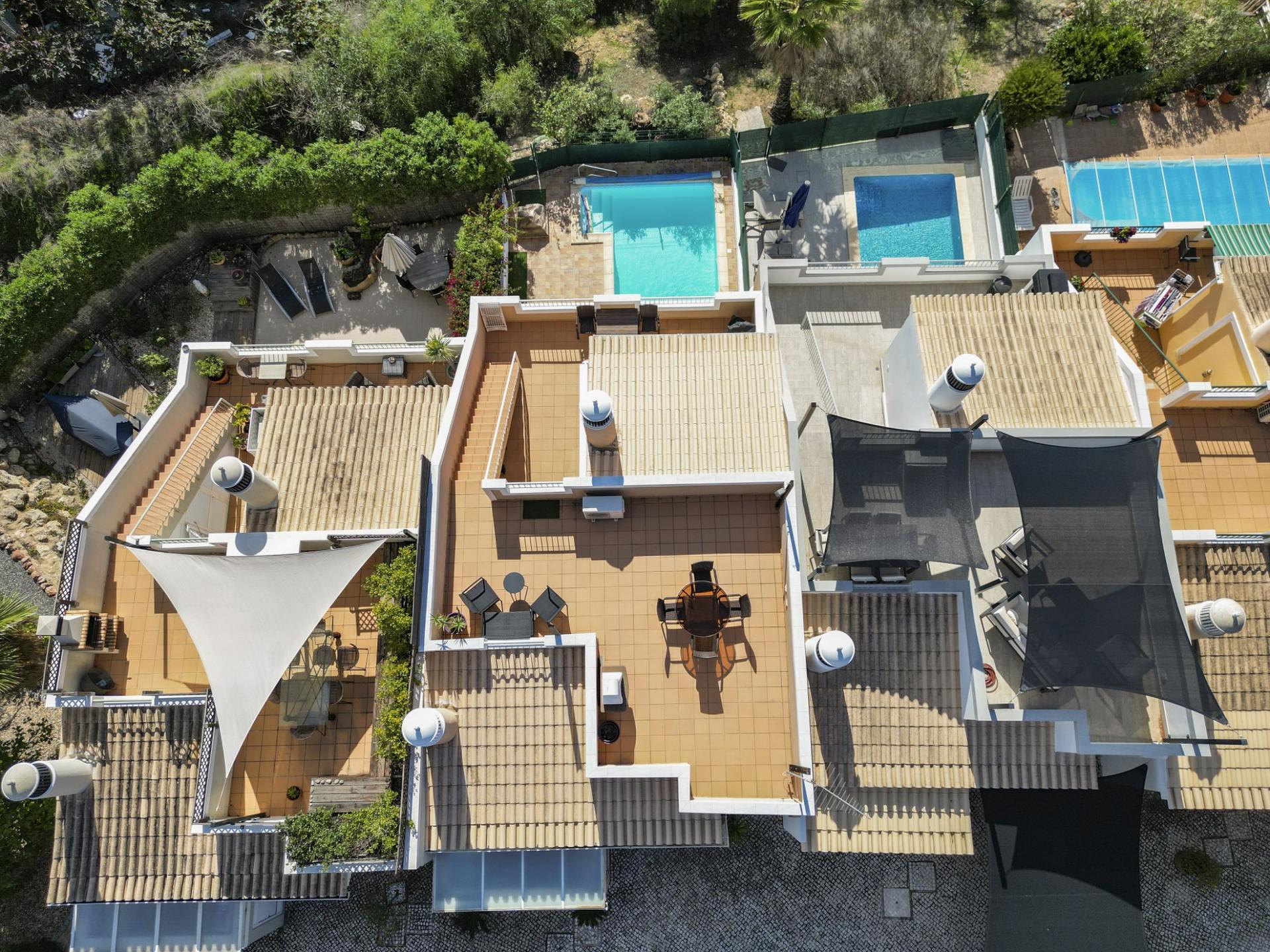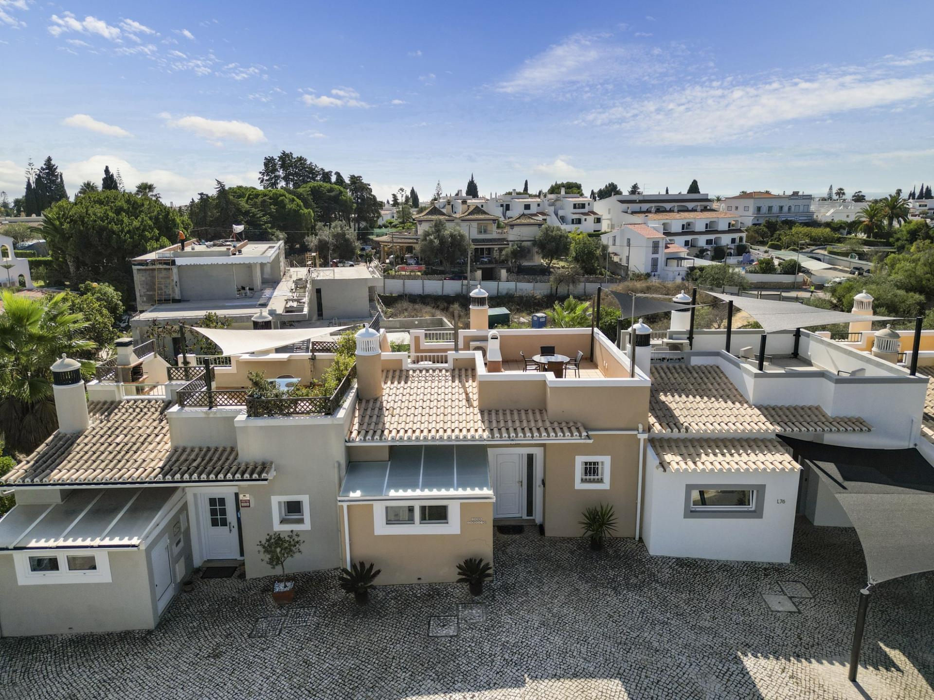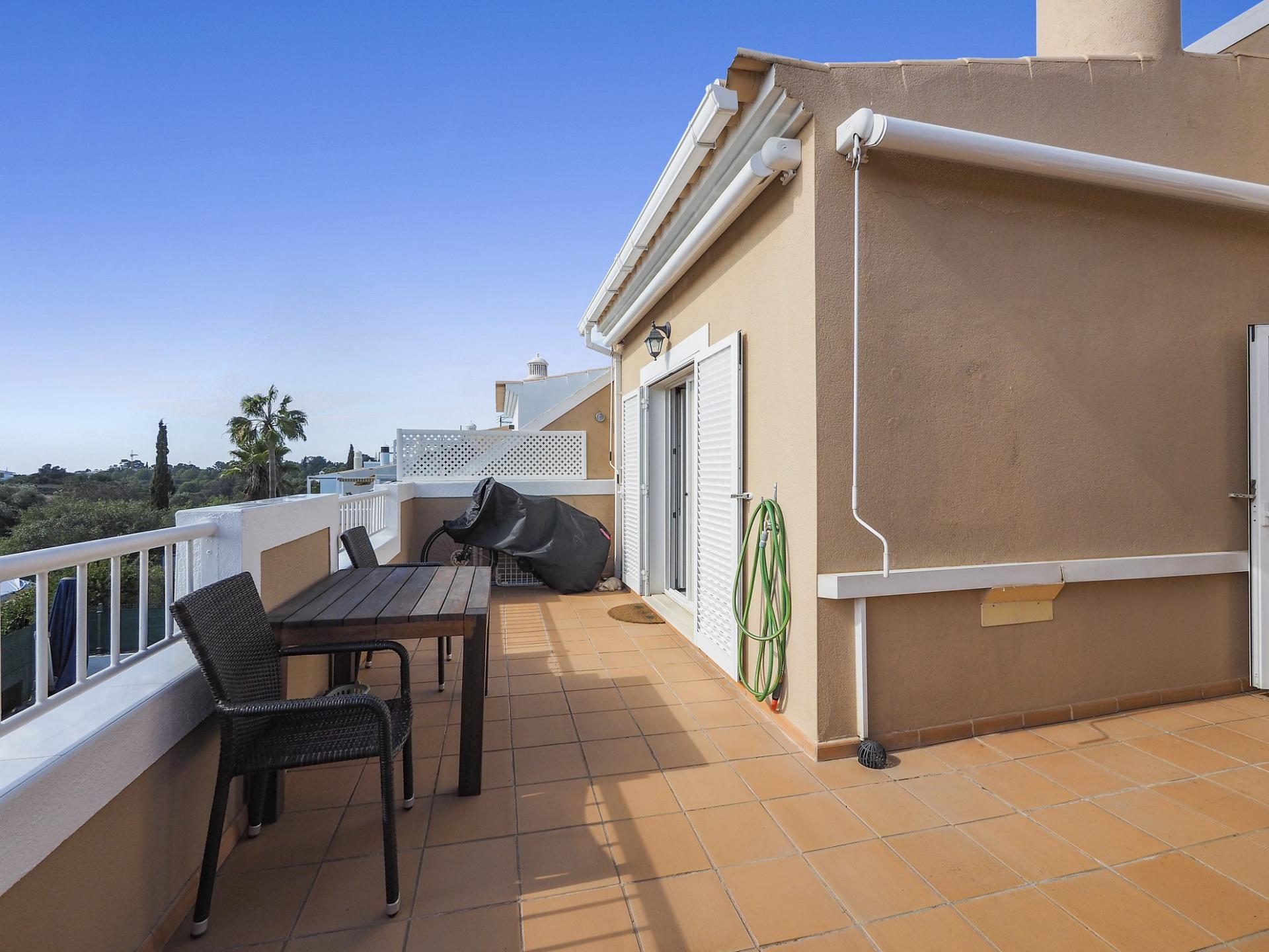 Die Eingangsebene des 2-Schlafzimmer Reihenhauses besteht aus der Eingangshalle, einem Duschbadezimmer und der erst kürzlich renovierten und mit neuen Küchengeräten voll ausgestatteten Einbauküche mit angrenzendem Wirtschaftsraum und einer praktischen Durchreiche ins Esszimmer sowie in das offen gestaltete Wohnzimmer mit Klimaanlage und Kamin. Vom Wohn-/ Essbereich aus besteht über raumhohe Türen Zugang auf die einen Meerblick bietende Terrasse. Von hier aus führen Treppen auf die Dachterrasse mit dem Einbaugrill und dem Außenessbereich, das alles wiederum verbunden mit einem wunderschönen Blick auf den Atlantik sowie rückseitig auf den Vale de Milho Golfplatz. Im Untergeschoß führt ein Korridor zu einem abschließbaren Abstellraum und zu den beiden Doppelzimmern. Beide Schlafzimmer verfügen über ein eigenes Badezimmer, Einbauschränke, eine Klimaanlage und Deckenventilatoren. Über Fenstertüren besteht außerdem Zugang auf die Poolterrasse, einen kleinen Gartenbereich sowie zum eigenen Pool.