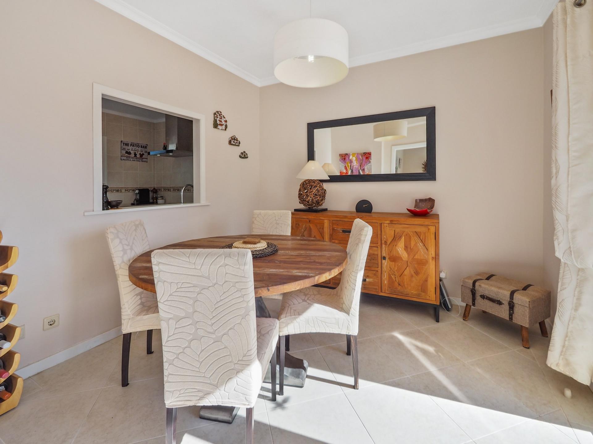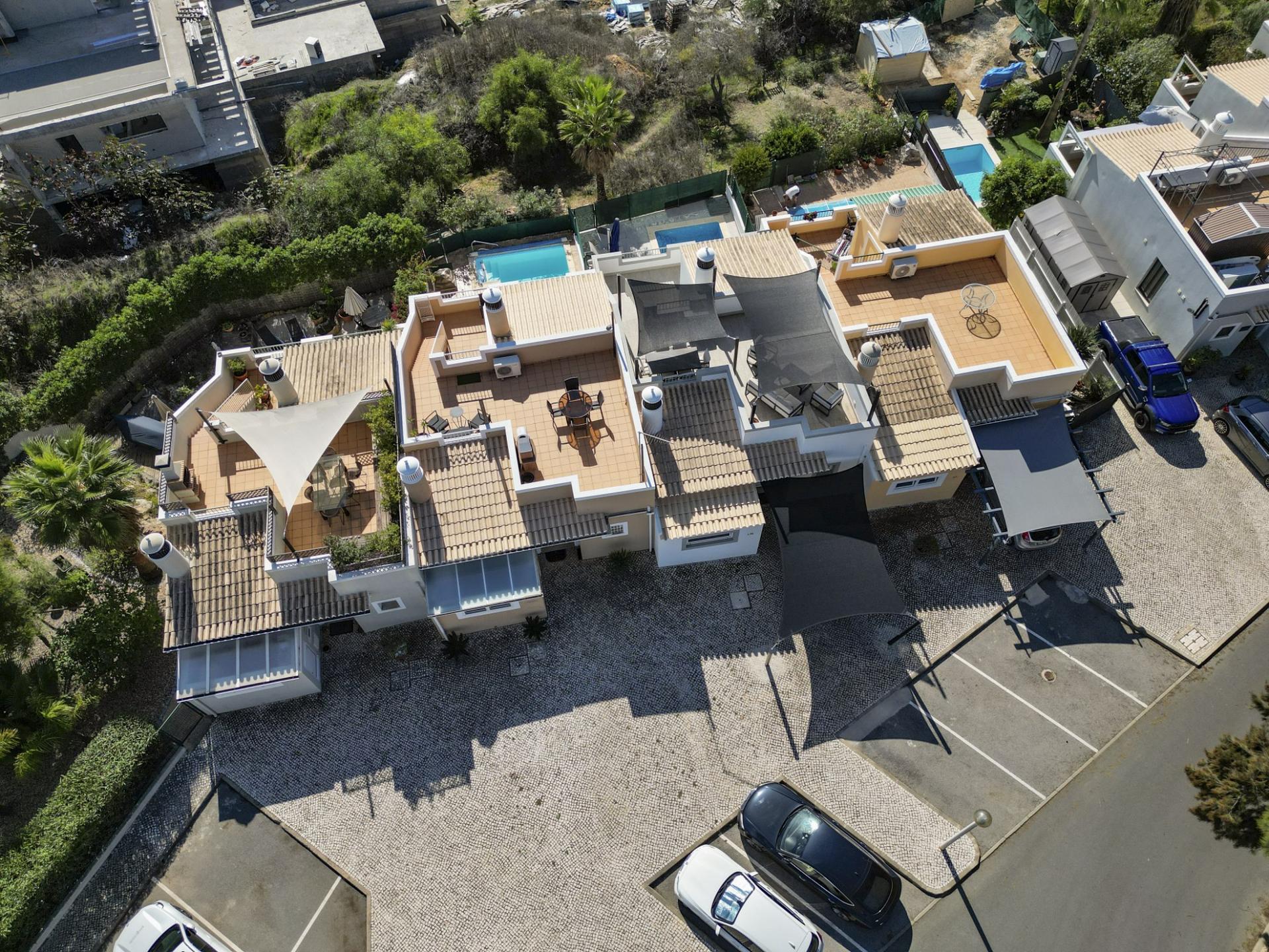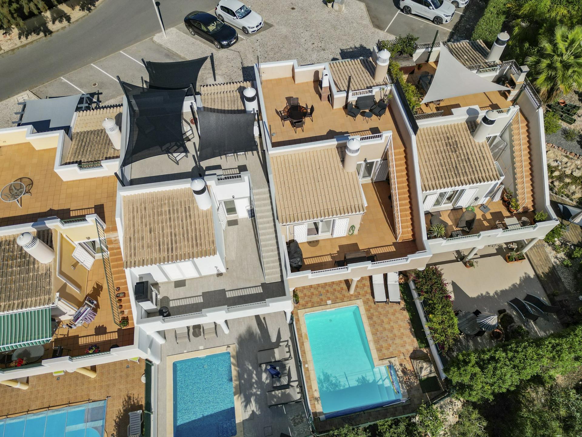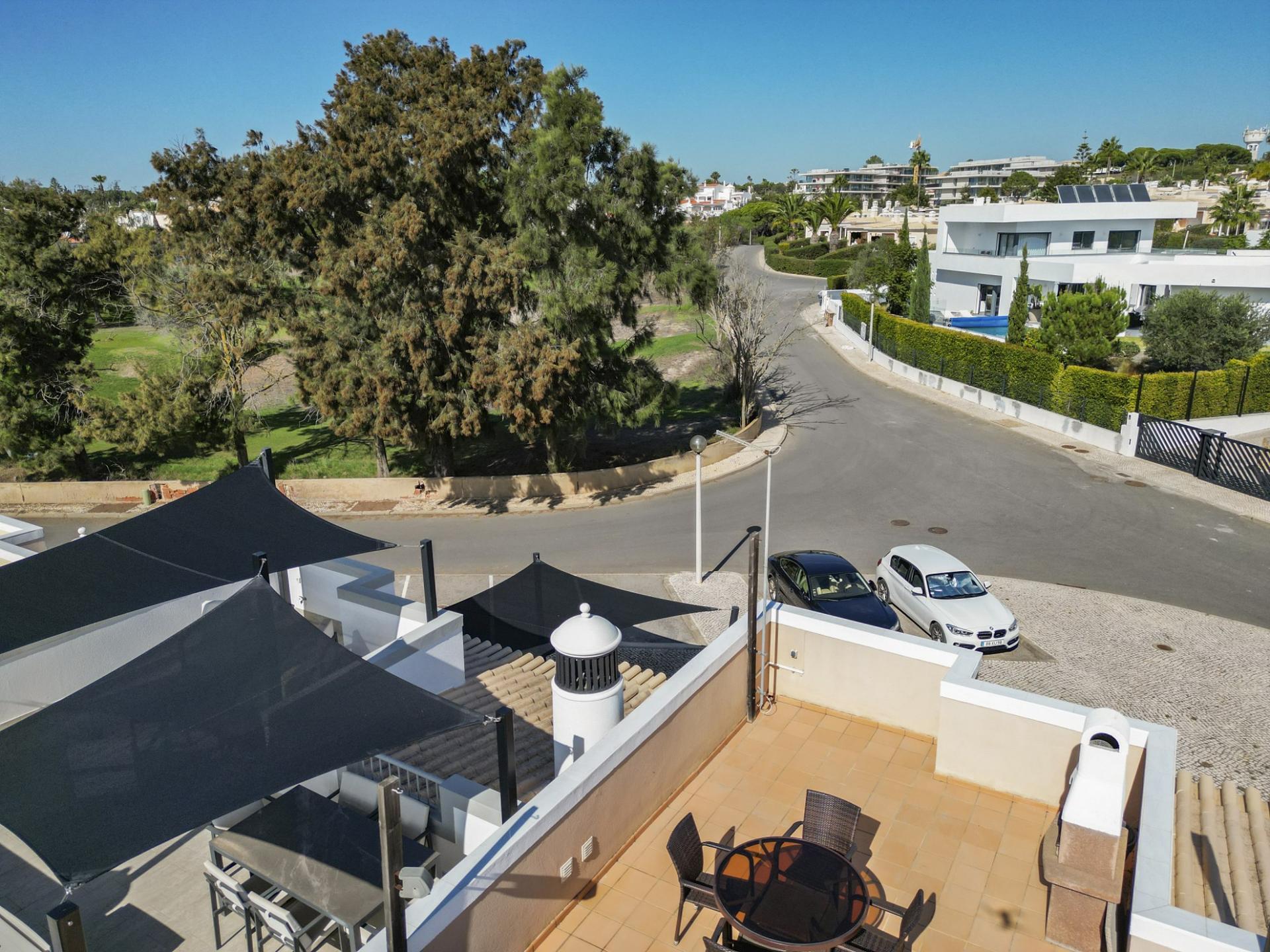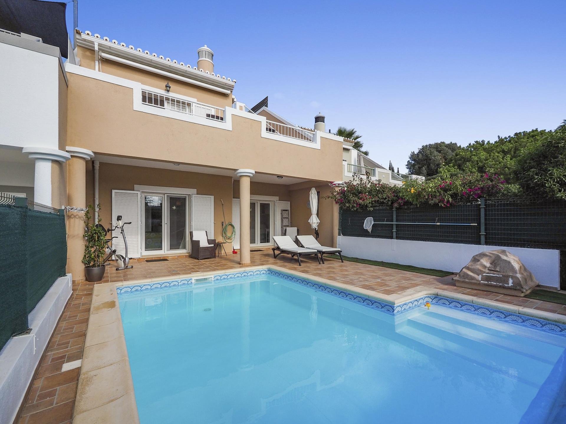 Die Eingangsebene des 2-Schlafzimmer Reihenhauses besteht aus der Eingangshalle, einem Duschbadezimmer und der erst kürzlich renovierten und mit neuen Küchengeräten voll ausgestatteten Einbauküche mit angrenzendem Wirtschaftsraum und einer praktischen Durchreiche ins Esszimmer sowie in das offen gestaltete Wohnzimmer mit Klimaanlage und Kamin. Vom Wohn-/ Essbereich aus besteht über raumhohe Türen Zugang auf die einen Meerblick bietende Terrasse. Von hier aus führen Treppen auf die Dachterrasse mit dem Einbaugrill und dem Außenessbereich, das alles wiederum verbunden mit einem wunderschönen Blick auf den Atlantik sowie rückseitig auf den Vale de Milho Golfplatz. Im Untergeschoß führt ein Korridor zu einem abschließbaren Abstellraum und zu den beiden Doppelzimmern. Beide Schlafzimmer verfügen über ein eigenes Badezimmer, Einbauschränke, eine Klimaanlage und Deckenventilatoren. Über Fenstertüren besteht außerdem Zugang auf die Poolterrasse, einen kleinen Gartenbereich sowie zum eigenen Pool.