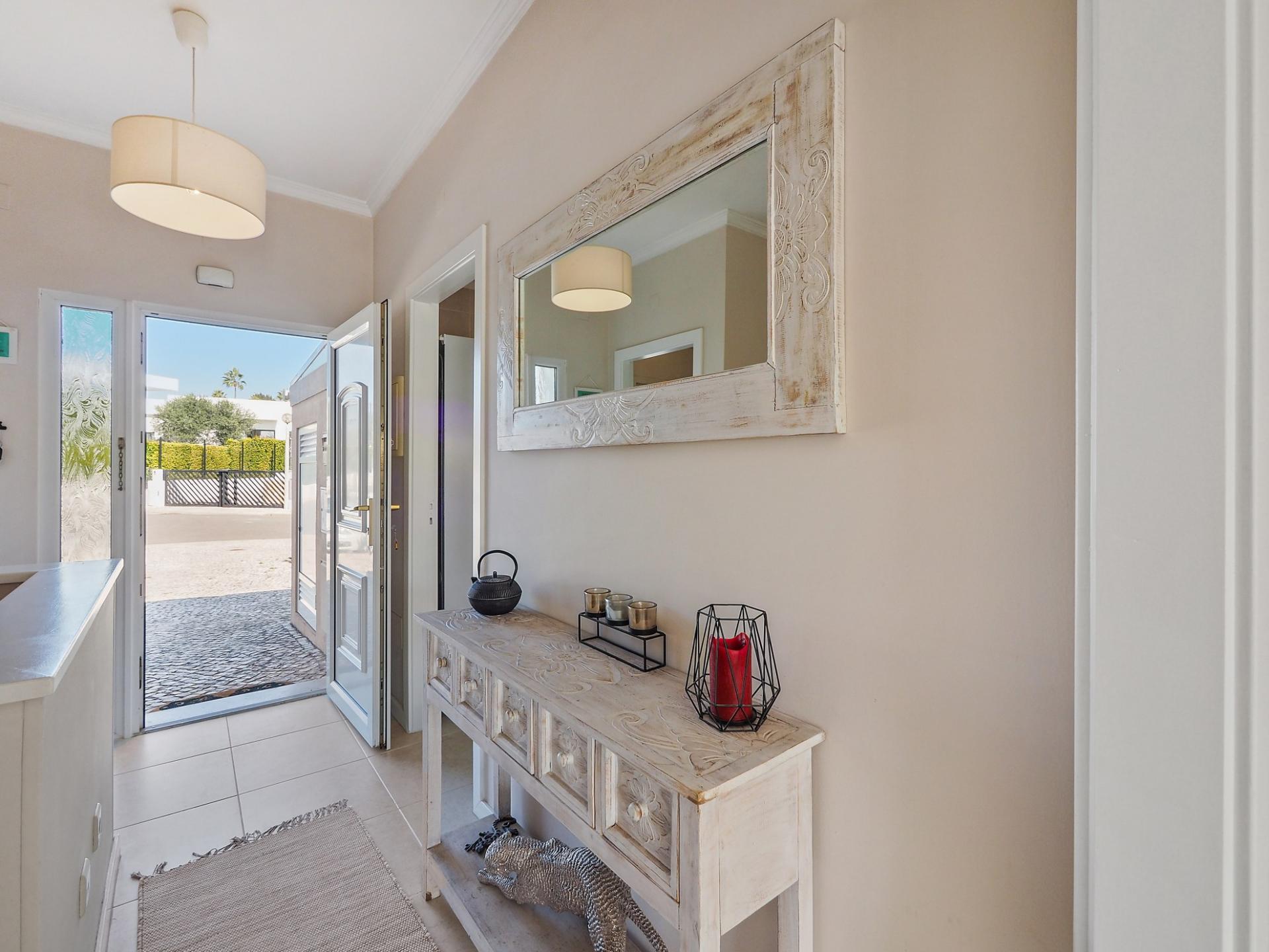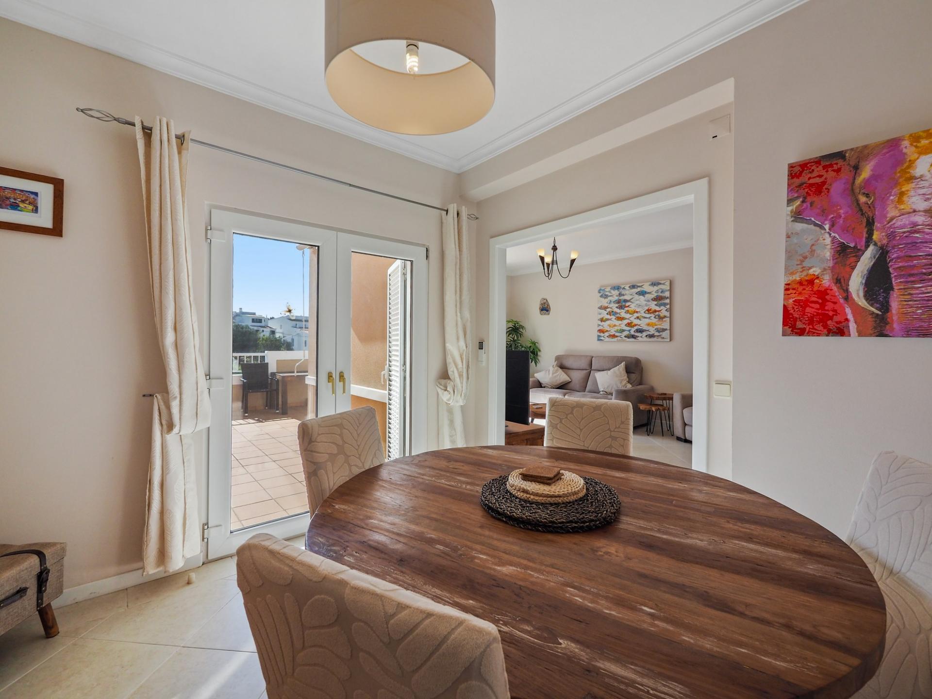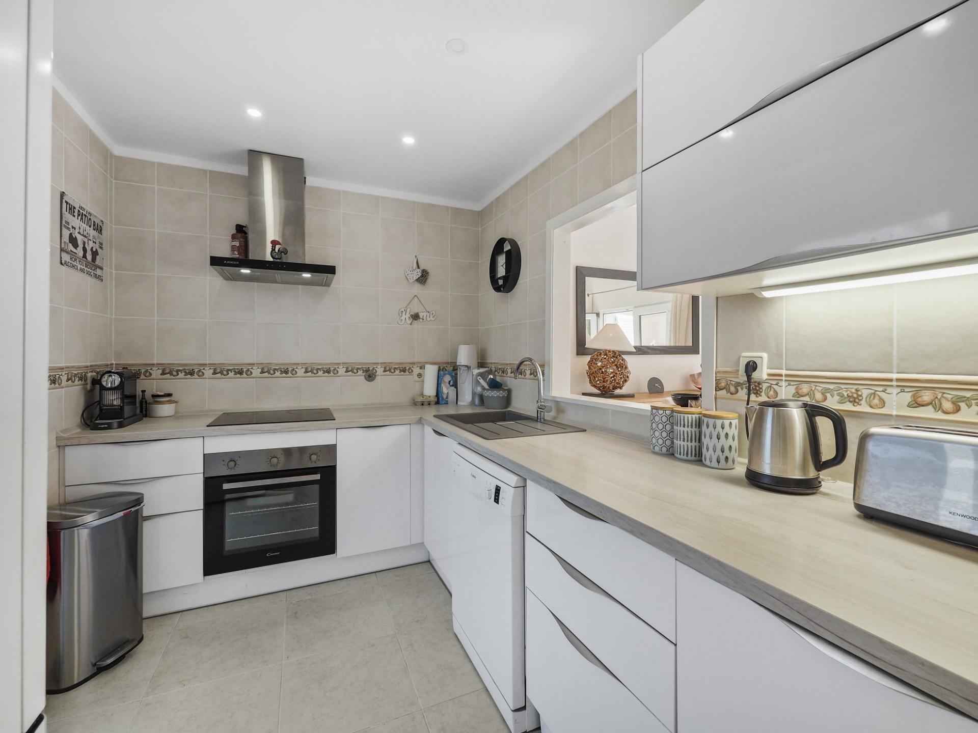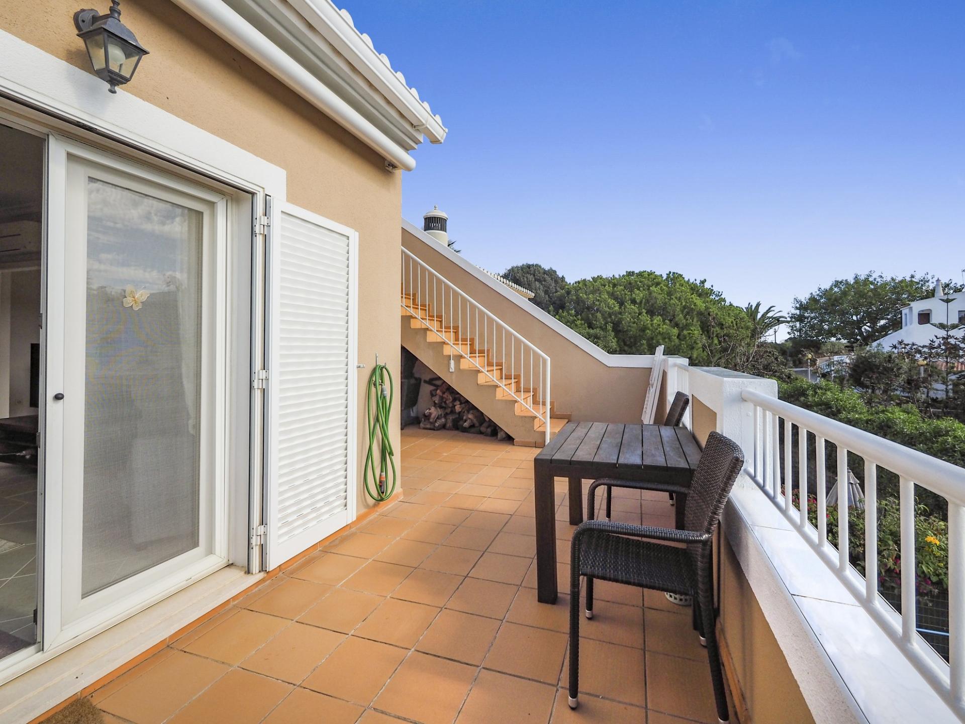 Die Eingangsebene des 2-Schlafzimmer Reihenhauses besteht aus der Eingangshalle, einem Duschbadezimmer und der erst kürzlich renovierten und mit neuen Küchengeräten voll ausgestatteten Einbauküche mit angrenzendem Wirtschaftsraum und einer praktischen Durchreiche ins Esszimmer sowie in das offen gestaltete Wohnzimmer mit Klimaanlage und Kamin. Vom Wohn-/ Essbereich aus besteht über raumhohe Türen Zugang auf die einen Meerblick bietende Terrasse. Von hier aus führen Treppen auf die Dachterrasse mit dem Einbaugrill und dem Außenessbereich, das alles wiederum verbunden mit einem wunderschönen Blick auf den Atlantik sowie rückseitig auf den Vale de Milho Golfplatz. Im Untergeschoß führt ein Korridor zu einem abschließbaren Abstellraum und zu den beiden Doppelzimmern. Beide Schlafzimmer verfügen über ein eigenes Badezimmer, Einbauschränke, eine Klimaanlage und Deckenventilatoren. Über Fenstertüren besteht außerdem Zugang auf die Poolterrasse, einen kleinen Gartenbereich sowie zum eigenen Pool.