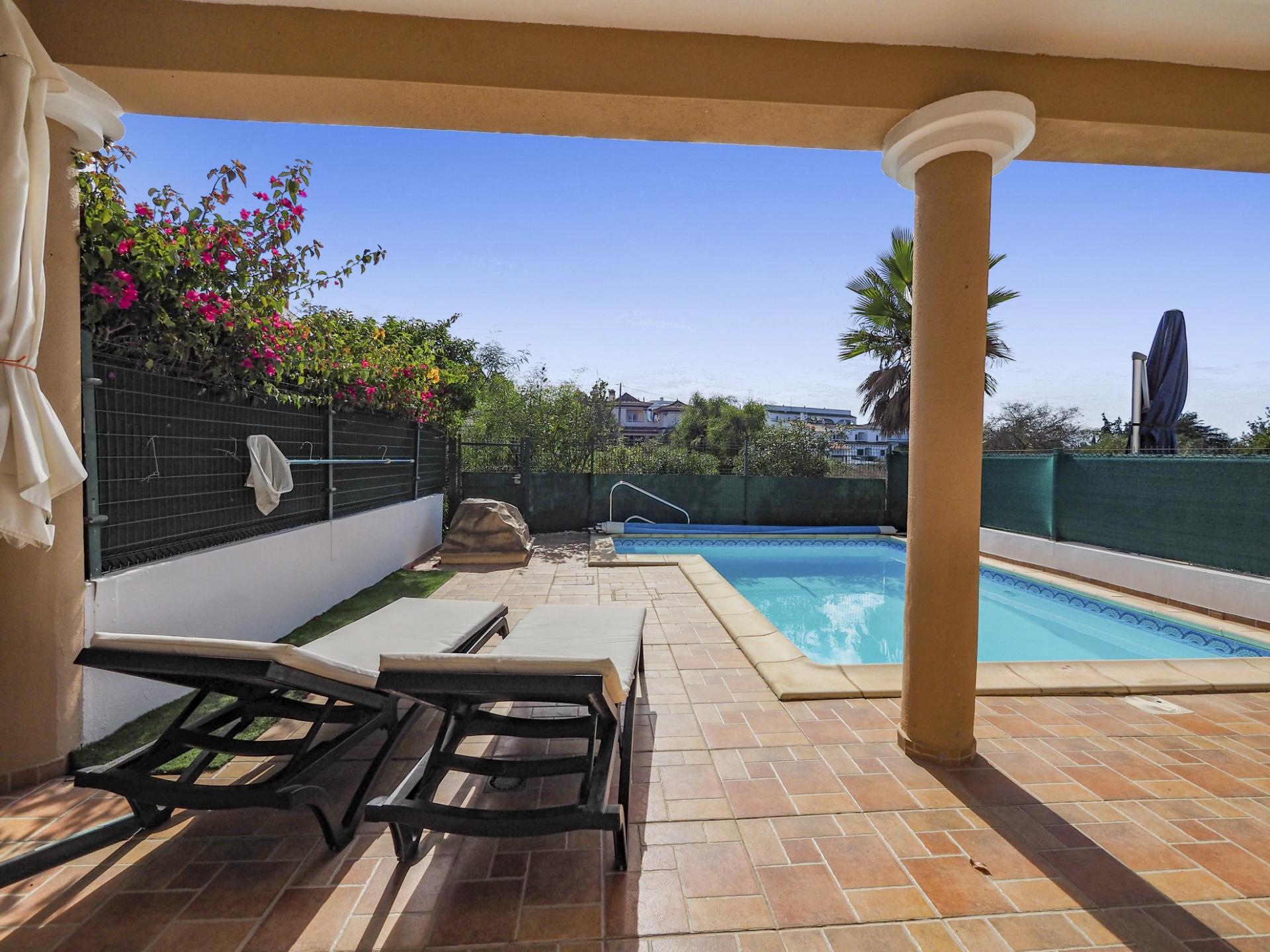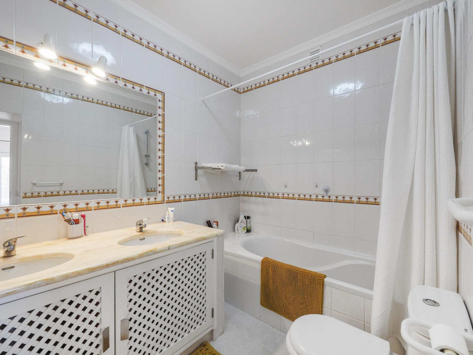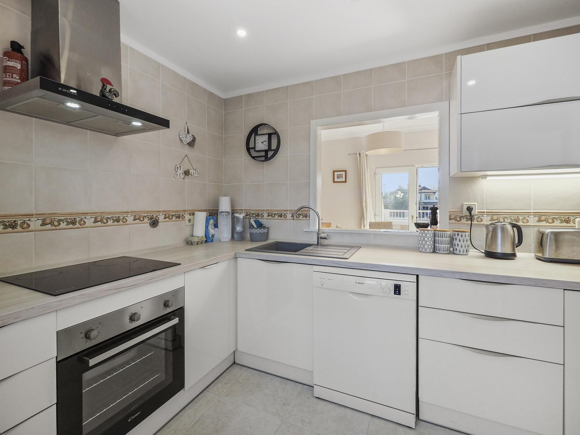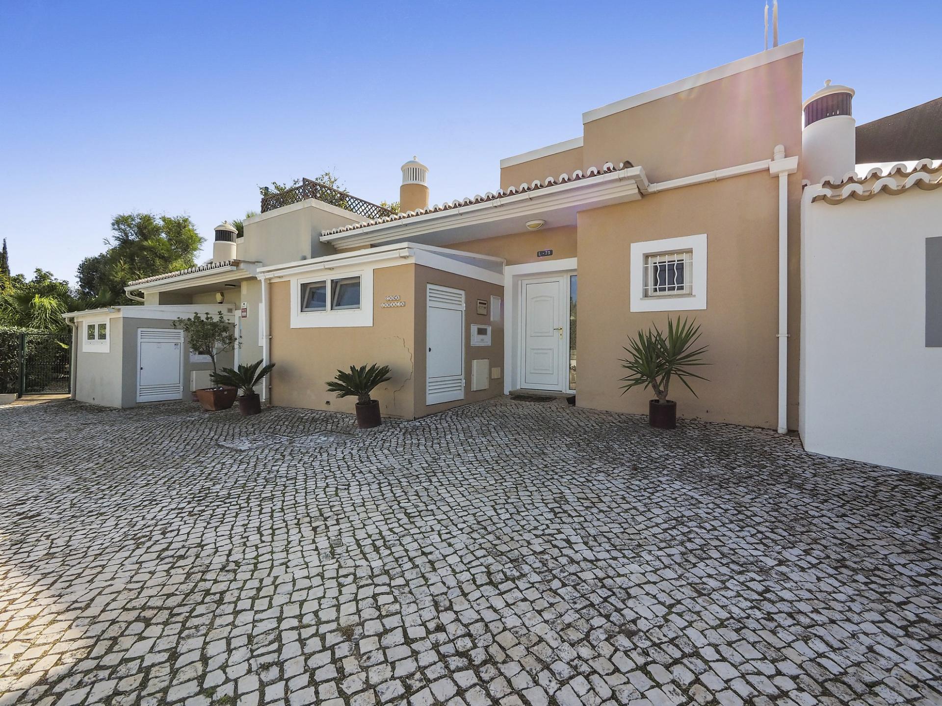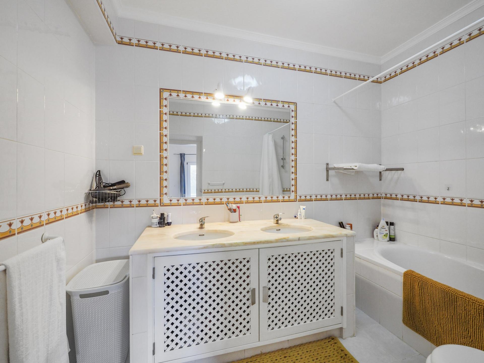 Die Eingangsebene des 2-Schlafzimmer Reihenhauses besteht aus der Eingangshalle, einem Duschbadezimmer und der erst kürzlich renovierten und mit neuen Küchengeräten voll ausgestatteten Einbauküche mit angrenzendem Wirtschaftsraum und einer praktischen Durchreiche ins Esszimmer sowie in das offen gestaltete Wohnzimmer mit Klimaanlage und Kamin. Vom Wohn-/ Essbereich aus besteht über raumhohe Türen Zugang auf die einen Meerblick bietende Terrasse. Von hier aus führen Treppen auf die Dachterrasse mit dem Einbaugrill und dem Außenessbereich, das alles wiederum verbunden mit einem wunderschönen Blick auf den Atlantik sowie rückseitig auf den Vale de Milho Golfplatz. Im Untergeschoß führt ein Korridor zu einem abschließbaren Abstellraum und zu den beiden Doppelzimmern. Beide Schlafzimmer verfügen über ein eigenes Badezimmer, Einbauschränke, eine Klimaanlage und Deckenventilatoren. Über Fenstertüren besteht außerdem Zugang auf die Poolterrasse, einen kleinen Gartenbereich sowie zum eigenen Pool.