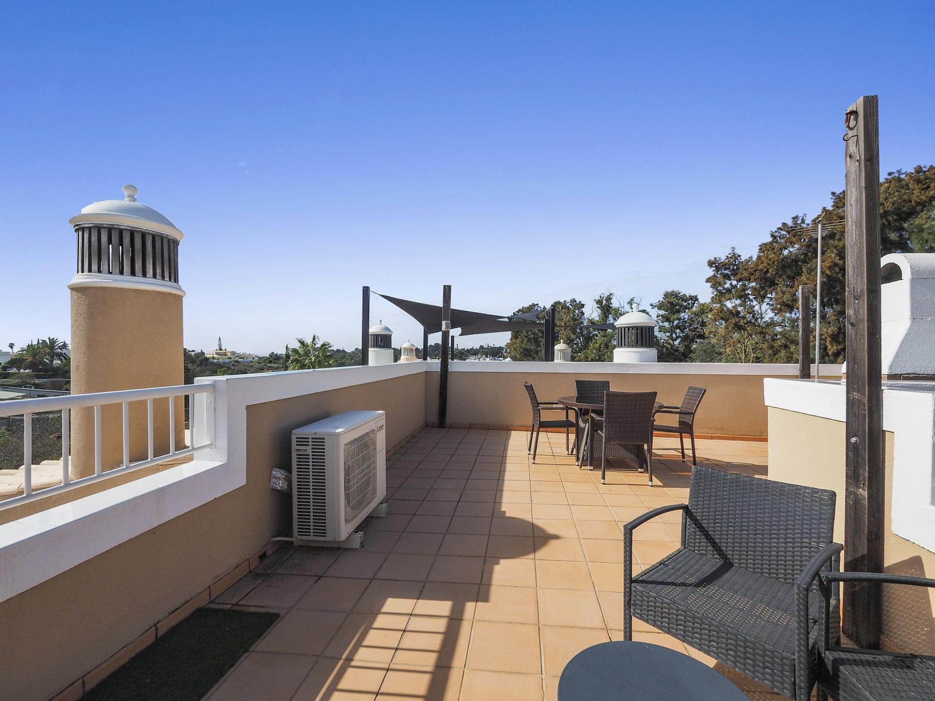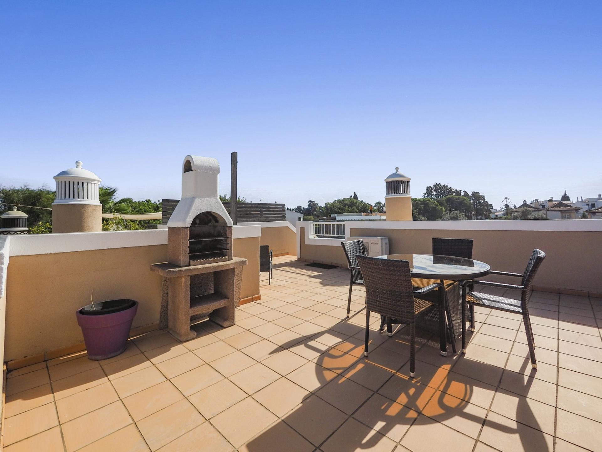 A sala de estar dá acesso a dois terraços, um deles no último andar com barbecue, zona de refeições e vista mar.