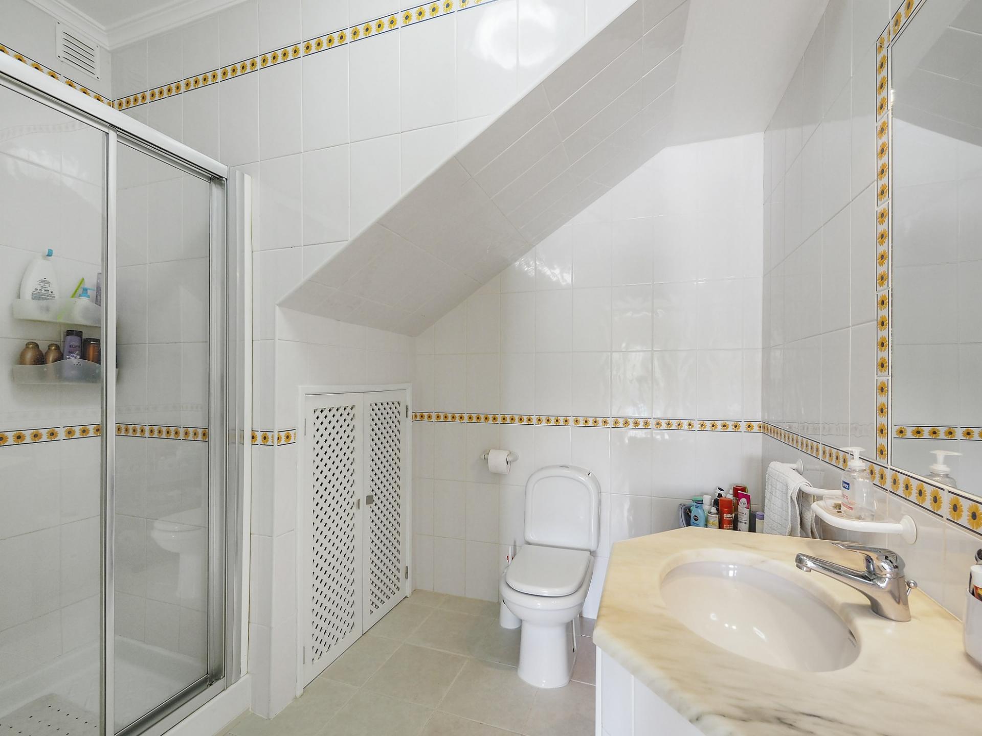 No piso abaixo encontram-se ampla arrecadação e 2 quartos, ambos com casas de banho privativas e roupeiros. Pelos quartos é possível aceder ao terraço parcialmente coberto.