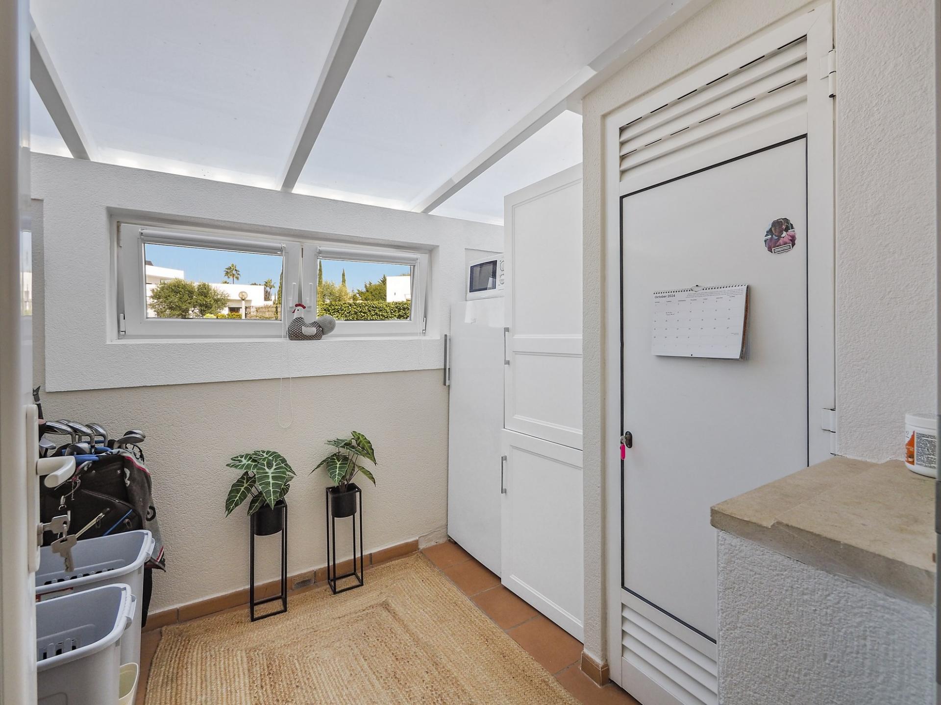 The entrance level of the 2-bedroom townhouse comprises the entrance hall, a shower bathroom and the recently refurbished fully fitted (new appliances) kitchen with an adjoining utility/ laundry room and a convenient hatch through to the dining room and the open-plan lounge with air conditioning and log burning fire. From the lounge/ dining area full height doors lead onto the terrace offering already some sea views; stairs lead up to the roof terrace with a built-in BBQ, the outside dining area and even enhanced views of the ocean and with golf views to the rear. On the lower level a hallway leads to a large lockable storage room and to the 2 double bedrooms, both en-suite and equipped with fitted wardrobes, air conditioning and ceiling fans.