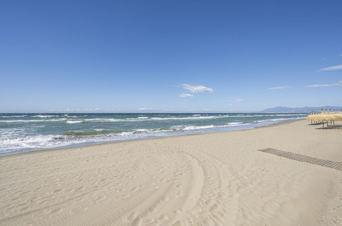 Rare frontline beach villa in Marbella featuring direct beach access, breathtaking sea views, spacious living areas, refurbished kitchen, large terrace, landscaped garden, pool, BBQ area, garage, covered parking, and a private rooftop terrace with panoramic coastline views including Morocco and Gibraltar.