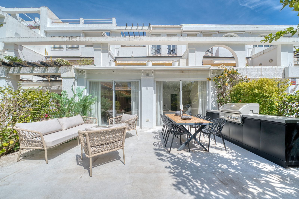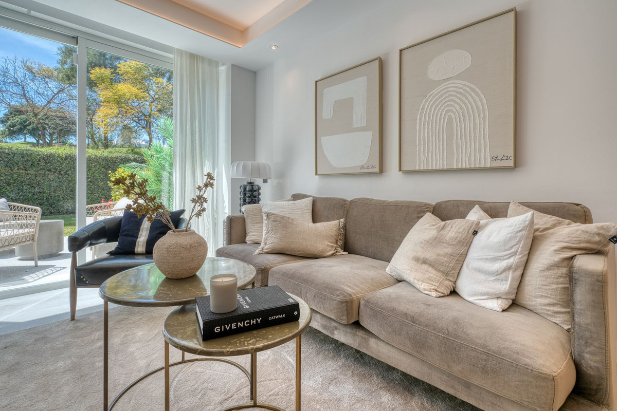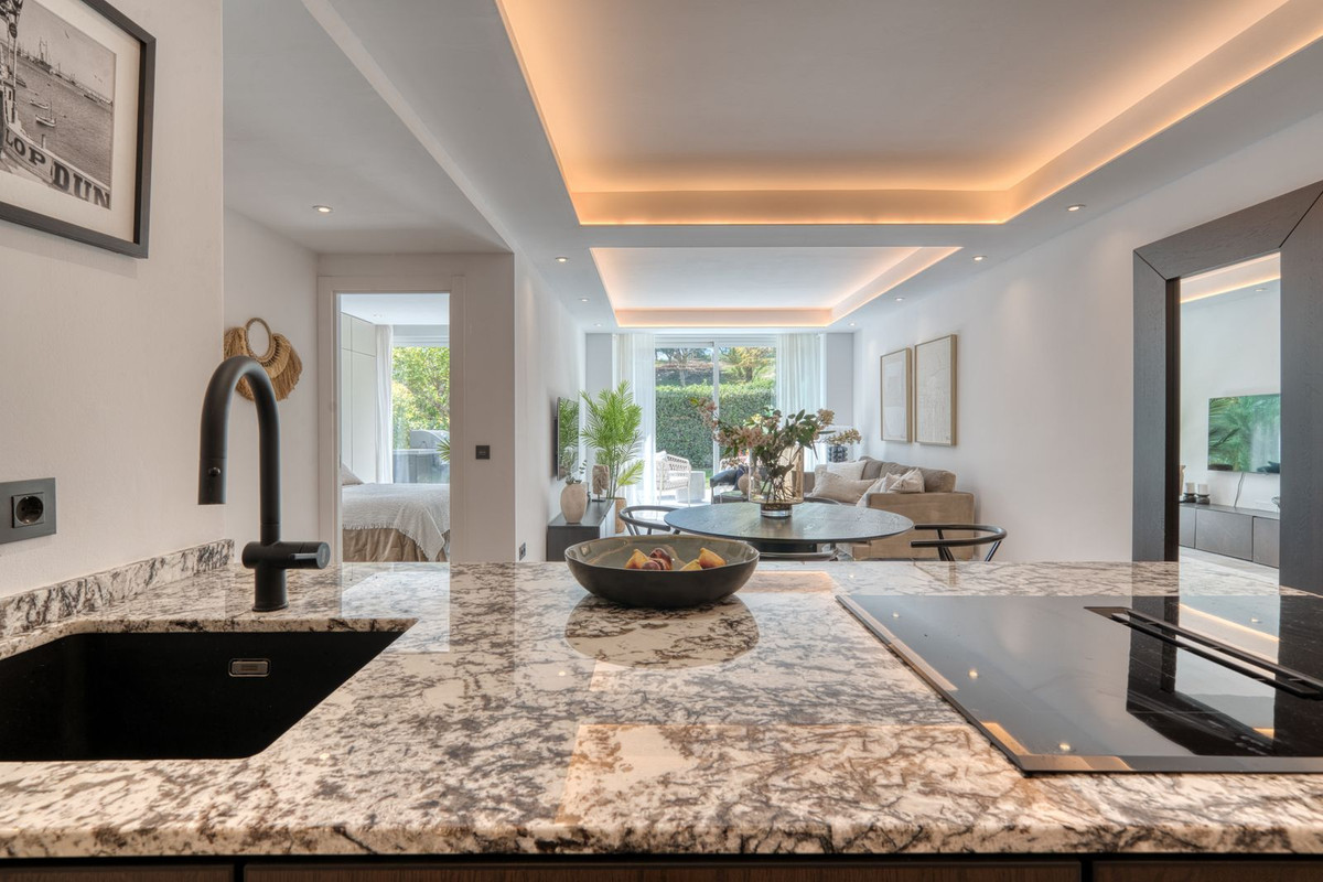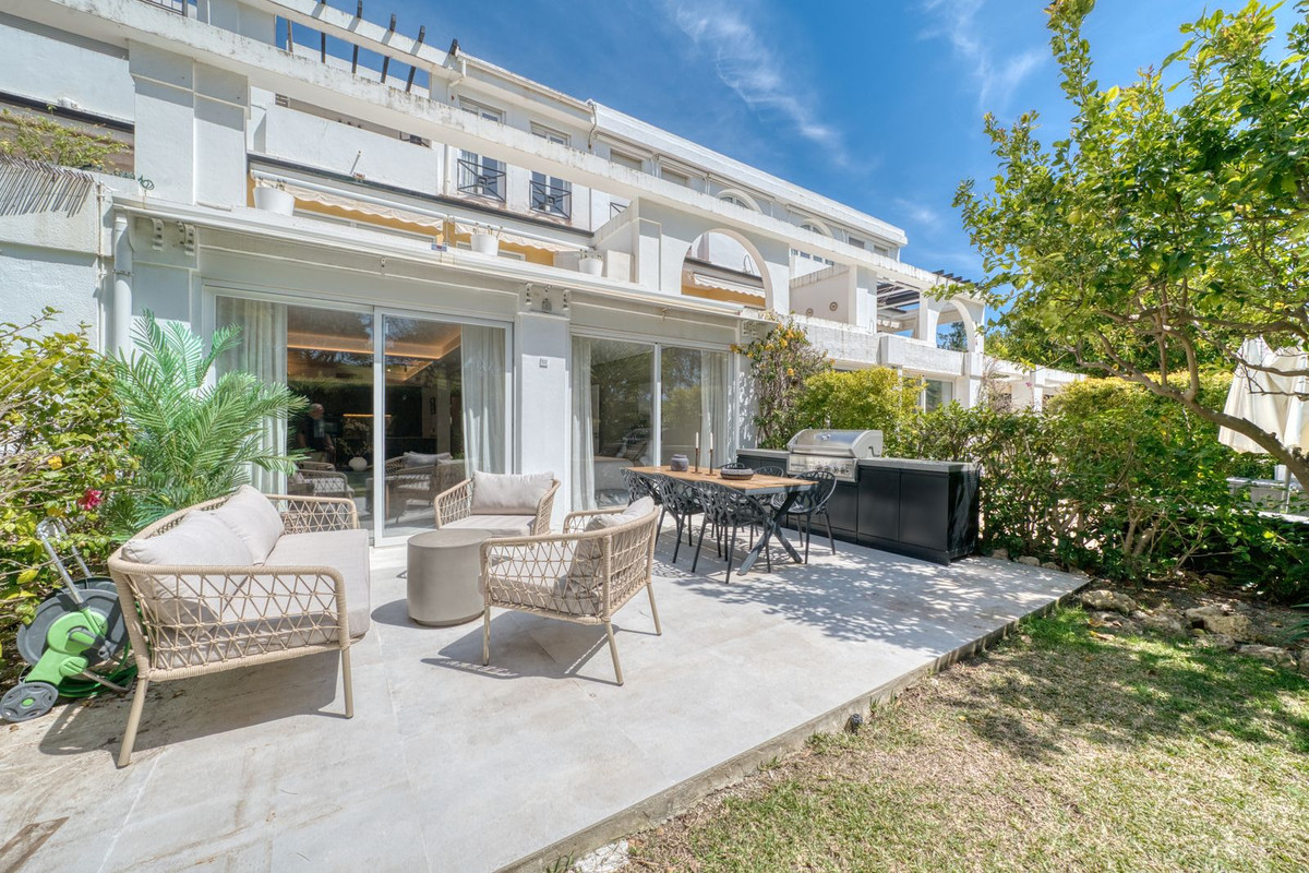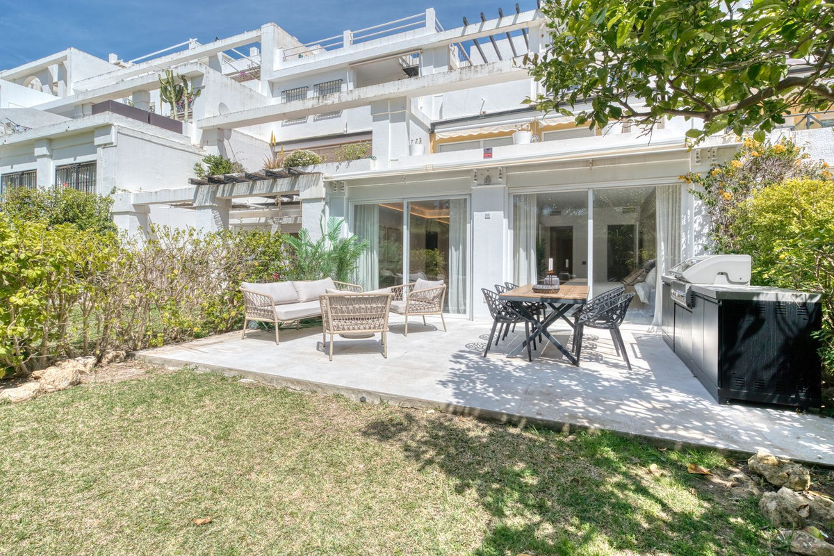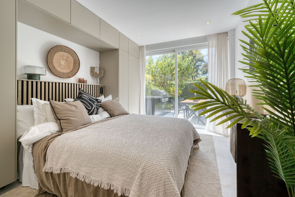 Beautifully renovated luxury garden apartment located within one of the Costa del Sol’s most sought-after private communities, fully renovated by the current owners to a very high standard, blending modern luxury with clean Scandinavian design. Inside, you are welcomed by a bright, open-plan living space that flows seamlessly into a sleek Siemens-fitted kitchen - designed with both form and function in mind. Underfloor heating and central air conditioning provide year-round comfort, while expansive windows that flood the apartment with natural light. The master suite is a private retreat, complete with built-in wardrobes and direct access to a large terrace that’s been purpose-built for outdoor living, with a full kitchen setup, complete with built-in grill, lounge and dining area. This is a terrace where you will want to spend every moment! An electric awning offers shade when needed, while security shutters and a full alarm system ensure peace of mind. Two additional double bedrooms share a spacious, modern bathroom, all finished to a superb standard. From your terrace, a private garden flows naturally towards the wonderful community swimming pool.