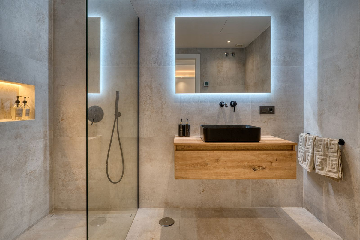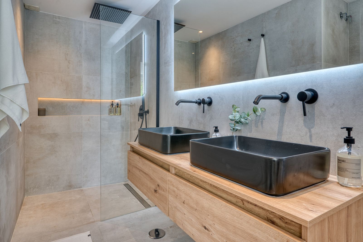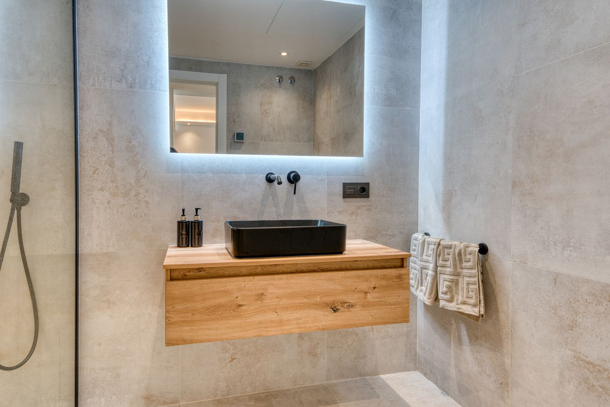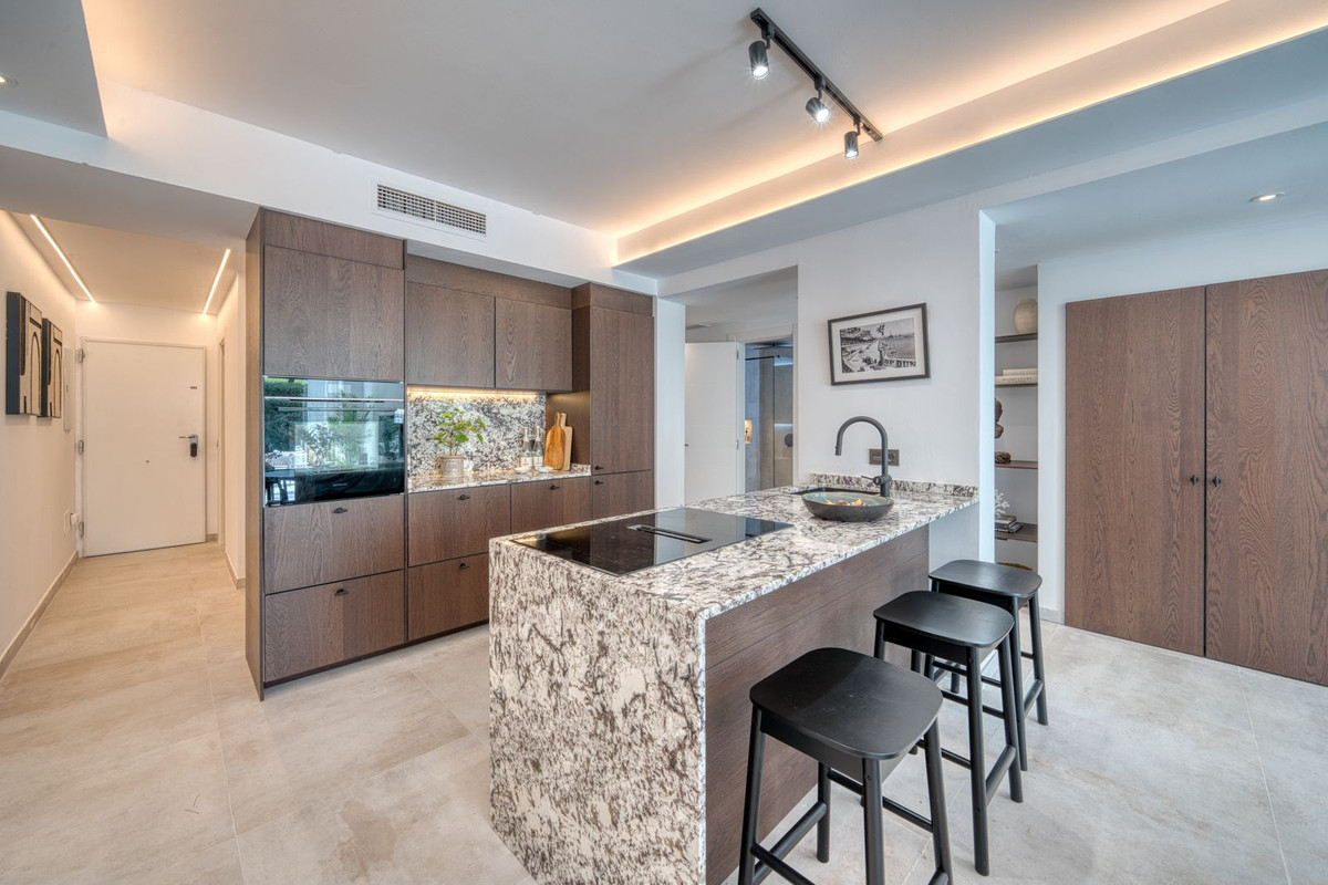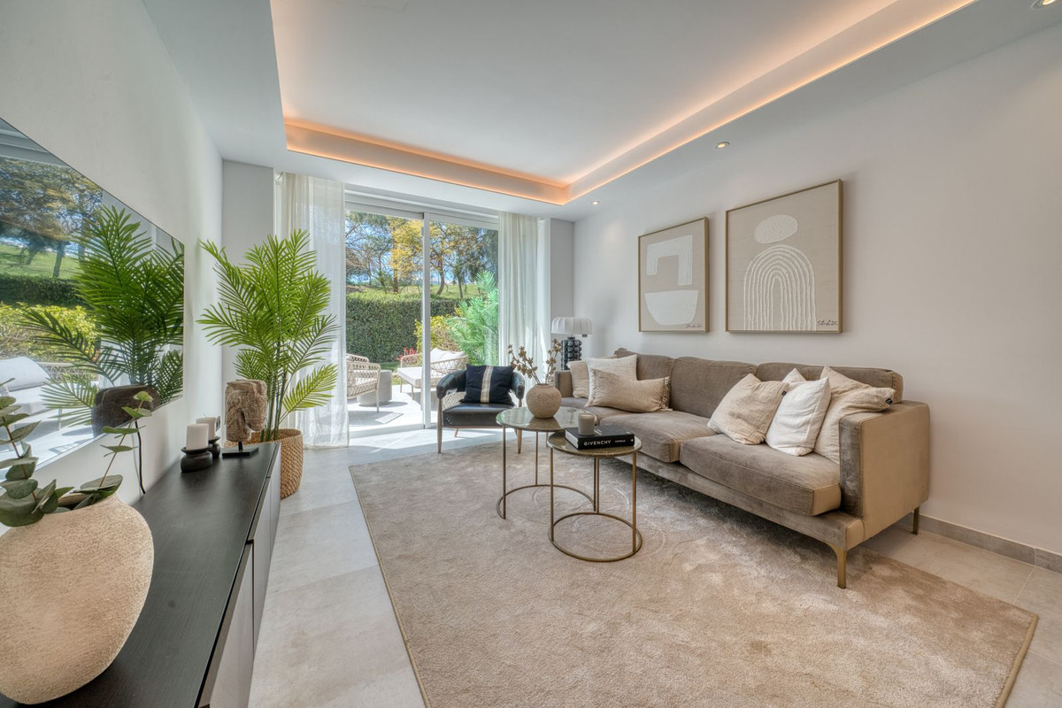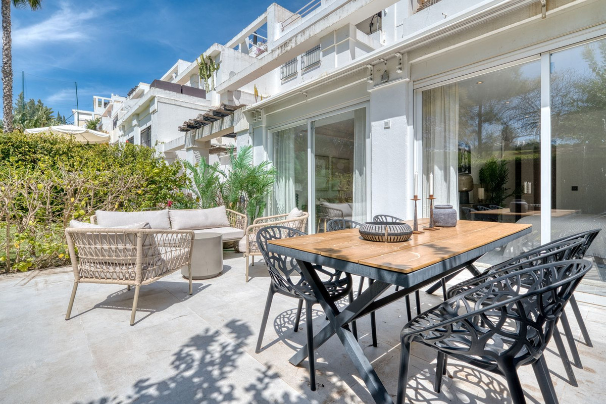 Beautifully renovated luxury garden apartment located within one of the Costa del Sol’s most sought-after private communities, fully renovated by the current owners to a very high standard, blending modern luxury with clean Scandinavian design. Inside, you are welcomed by a bright, open-plan living space that flows seamlessly into a sleek Siemens-fitted kitchen - designed with both form and function in mind. Underfloor heating and central air conditioning provide year-round comfort, while expansive windows that flood the apartment with natural light. The master suite is a private retreat, complete with built-in wardrobes and direct access to a large terrace that’s been purpose-built for outdoor living, with a full kitchen setup, complete with built-in grill, lounge and dining area. This is a terrace where you will want to spend every moment! An electric awning offers shade when needed, while security shutters and a full alarm system ensure peace of mind. Two additional double bedrooms share a spacious, modern bathroom, all finished to a superb standard. From your terrace, a private garden flows naturally towards the wonderful community swimming pool.