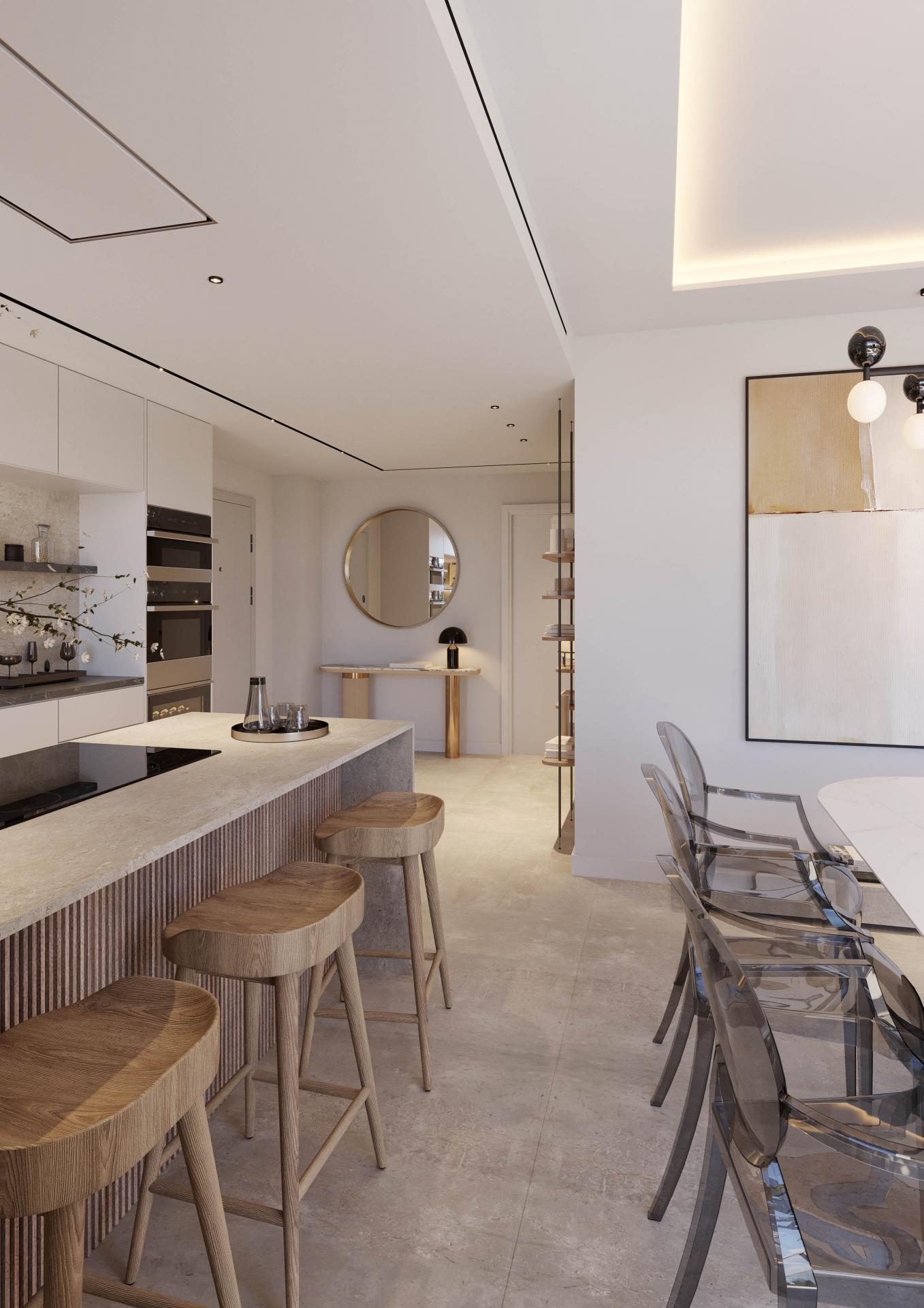 Ground-floor units feature wrap-around gardens with private pools, ideal for alfresco dining and entertaining. Penthouses offer solariums with rooftop pools and optional outdoor kitchens—perfect for Mediterranean evenings. The open-plan kitchens and lounge areas support a seamless flow for hosting and daily life.