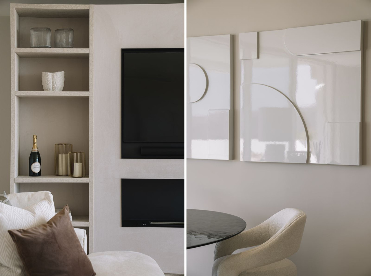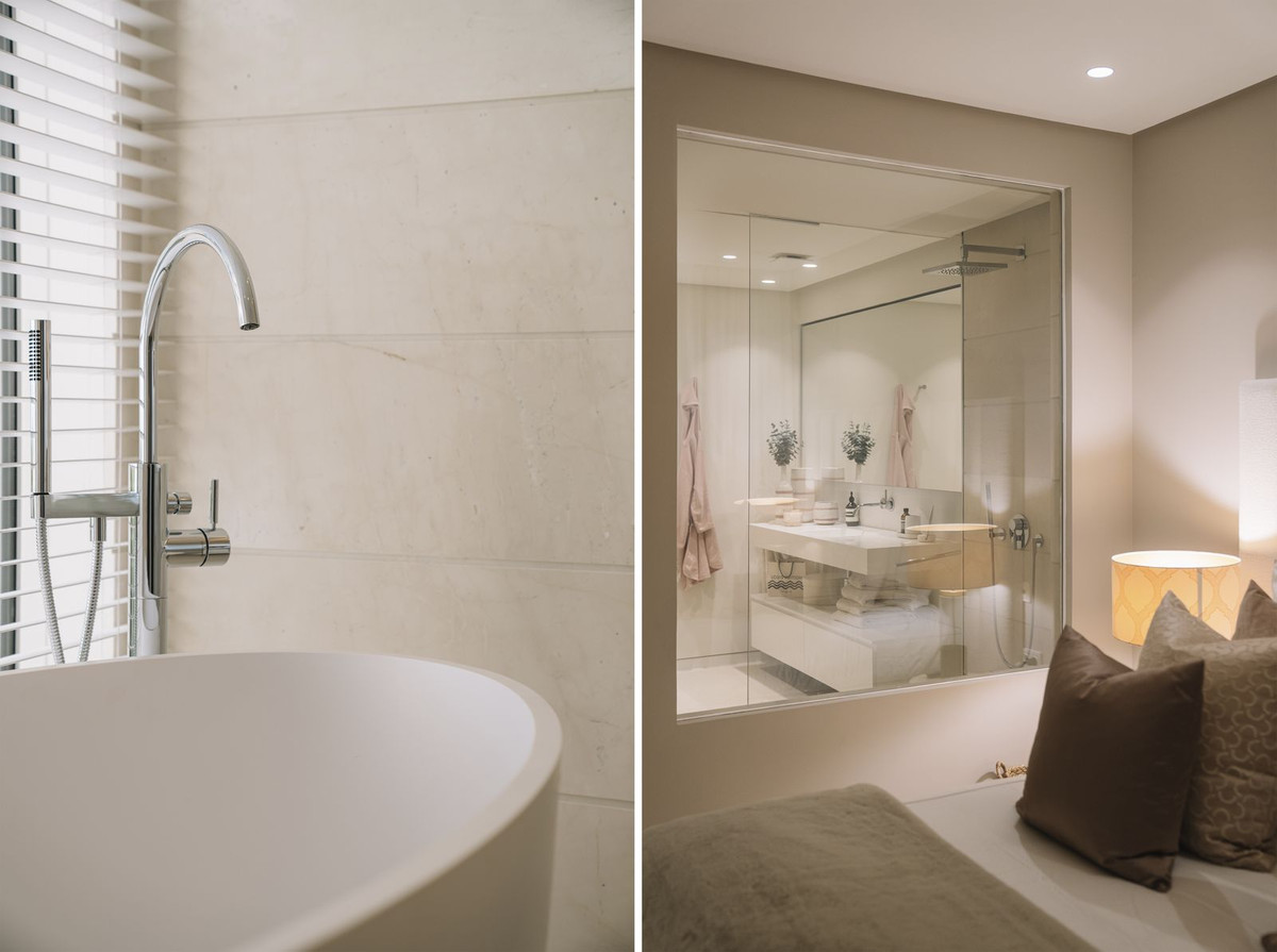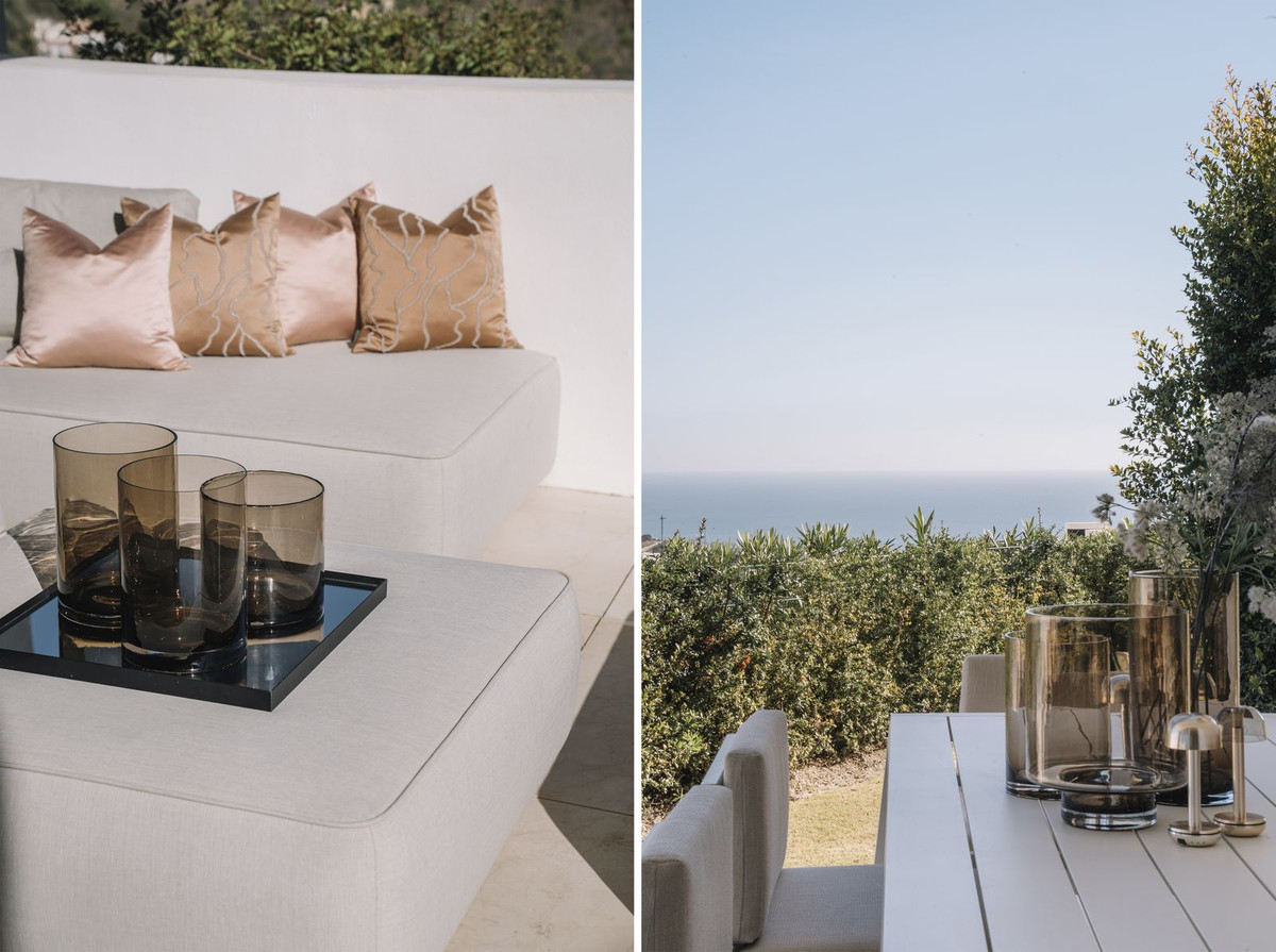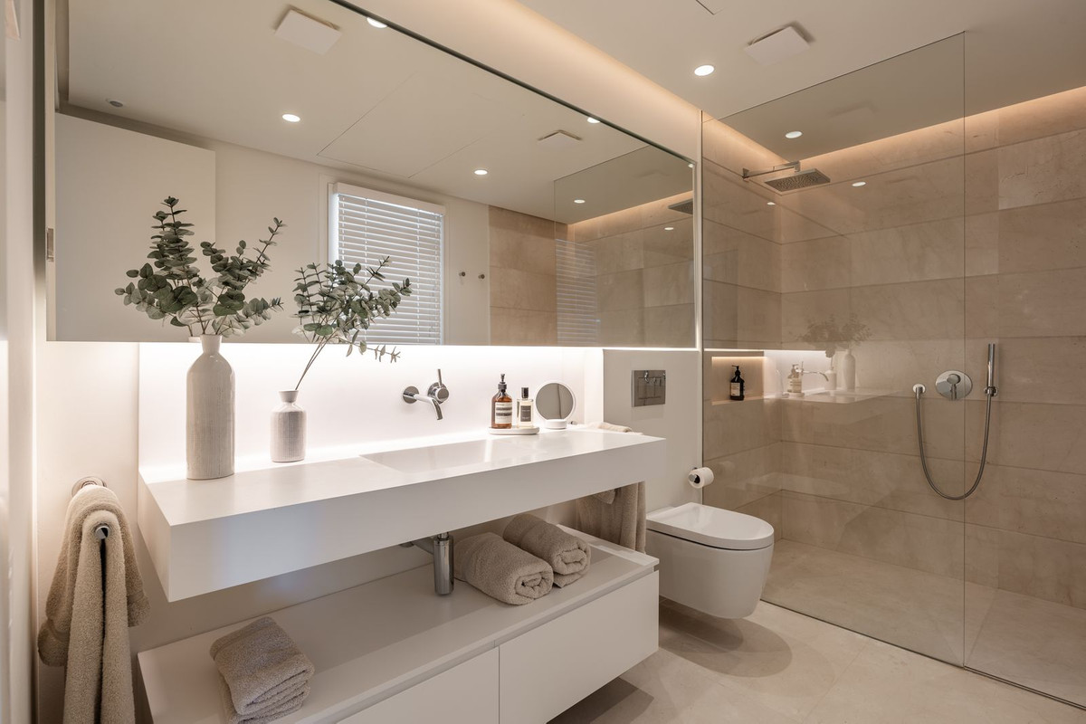 Elegant ground-floor apartment featuring 231m² living space, three en-suite bedrooms, Gunni Trentino kitchen, Eric Kuster interiors, marble floors, cozy fireplace, private 88m² garden with outdoor shower, panoramic sea views, Sonos sound system, and advanced ARC TV entertainment.