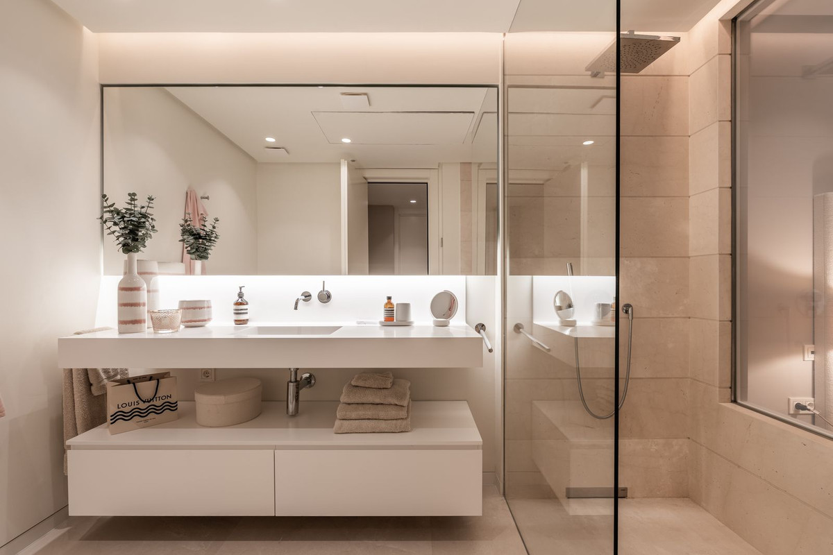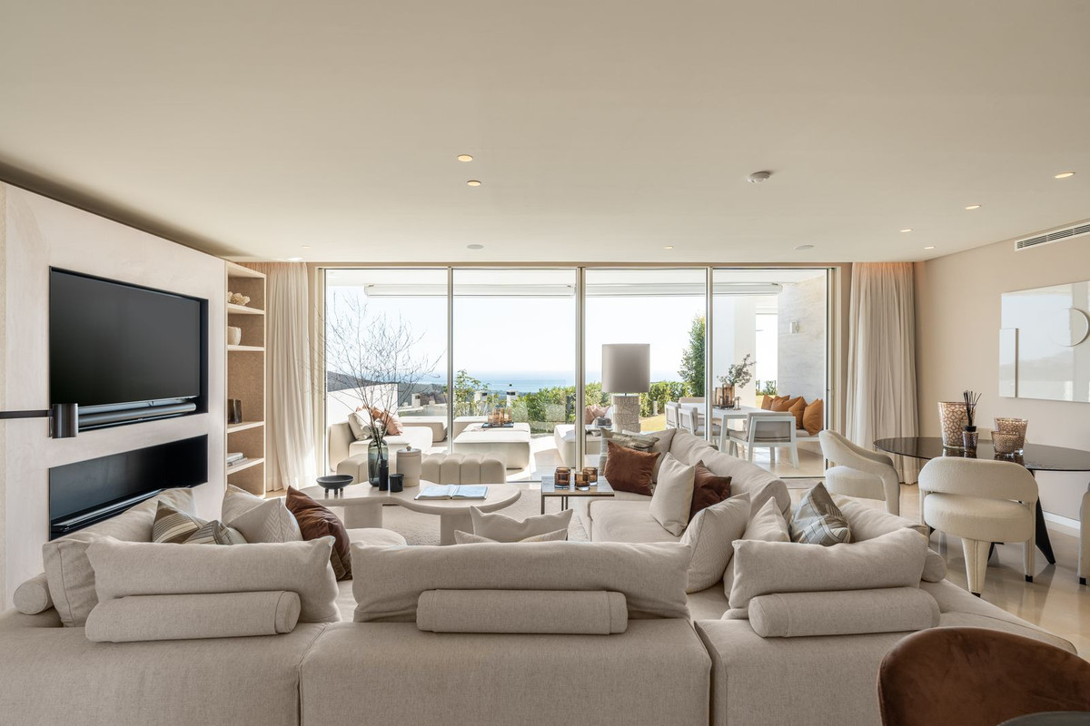 Beautiful ground-floor apartment offering 231 square meters of well-designed living space. Upon entering, you'll find a practical and stylish living and dining area seamlessly connected to an open-plan kitchen, featuring the renowned Gunni Trentino design. The living room, complete with a cozy fireplace, sets the tone for comfortable and welcoming gatherings. The interior, designed by Eric Kuster, boasts a refined touch with luxury elements like Loro Piana fabrics and curtains. Marble floors throughout the apartment, including the terrace. This three-bedroom apartment features all bedrooms en-suite, providing privacy to all homeowners. A guest toilet adds to the practical layout, striking a balance between personal space and communal living. Step outside to a terrace with a private 88 square meter garden. Take in the panoramic sea views, creating a perfect setting for relaxation. An added bonus is the outdoor shower, which adds a touch of convenience. The apartment is equipped with the Sonos by Illusion sound system, complete with strategically placed wall speakers in every room, including outside area. The property also features an advanced ARC TV system, promising good entertainment. This ground floor apartment offers a genuine living experience. The thoughtful design meets the practical needs of daily life, where simplicity meets sophistication.