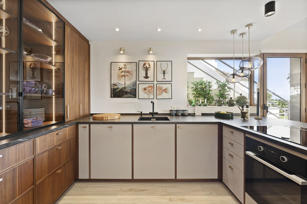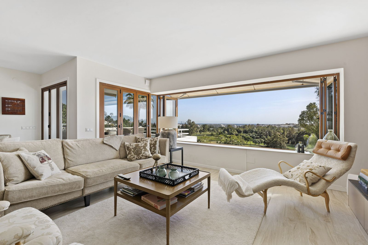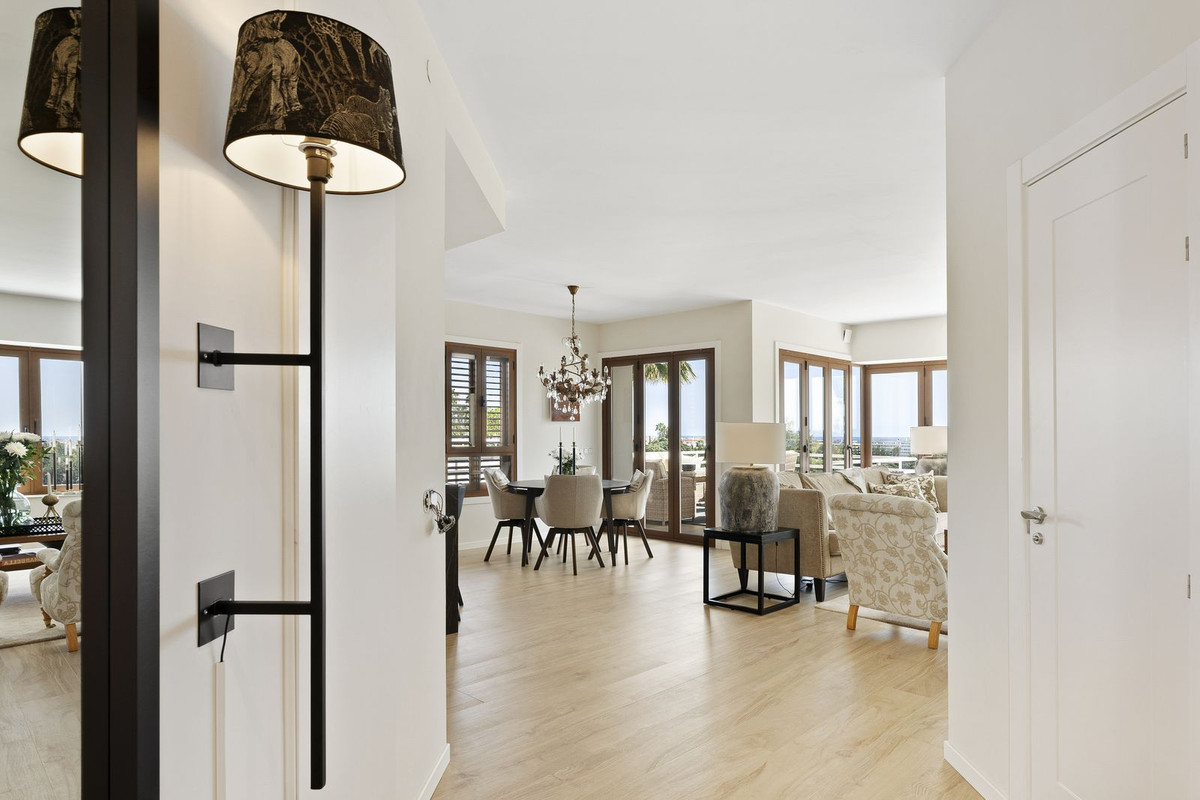 Stunning modern design penthouse in Nueva Andalucía. Fully renovated in 2020, this incredible residence offers a spacious living area split over two levels, with a built area of 347m², including 184m² of interior space and a 150m² terrace with panoramic views of the sea, surrounding golf courses, and swimming pools.