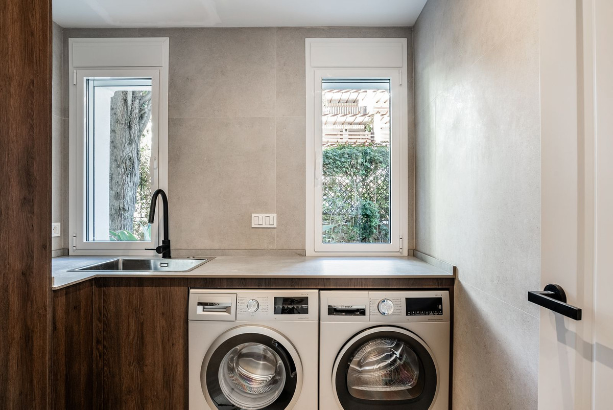 Stunning garden apartments located just off the renowned Golden Mile in Marbella. This completely unique apartment spans a total of 470 square meters, including a 241 square meter garden – all on a single level. As you step through the entrance, you're greeted by expansive social areas comprising a living room, kitchen, and dining area. The large windows seamlessly connect the indoors with your own private garden, creating an indoor-outdoor ambiance throughout the apartment. Boasting 4 bedrooms and 3 bathrooms, including a dedicated laundry room, this apartment offers both luxury and practicality. The master bedroom is particularly impressive, featuring a spacious en-suite bathroom and a generous walk-in closet with separate sections. Three of the bedrooms provide direct access to the garden, enhancing the connection to the outdoors. The outdoor patio features a outdoor kitchen and a pergola, surrounded by a vast lawn seldom seen in apartment living, giving the feeling of a villa. Meticulously renovated with the highest quality materials, every detail of this apartment is designed to exude warmth and comfort, ensuring a delightful living experience.