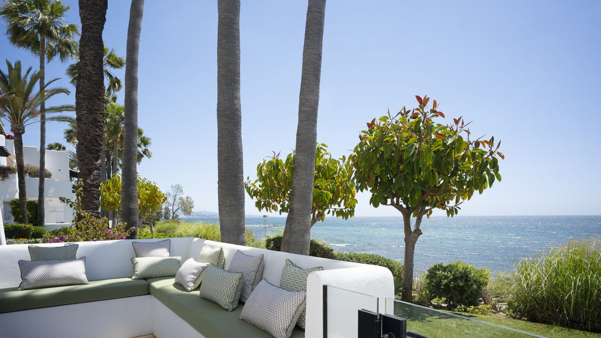Fully renovated frontline beach apartment in Puente Romano’s Jardín Persa featuring sea views, home automation, premium TECHNAL windows, underfloor heated bathrooms, dedicated underground parking, storage room, and exclusive access to tranquil Arabic-inspired gardens and Marbella’s seafront promenade.