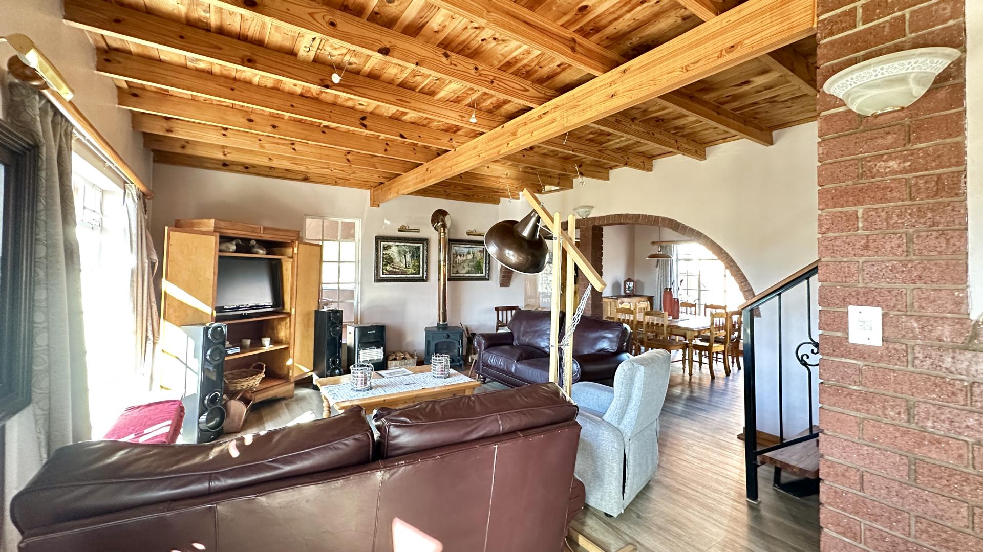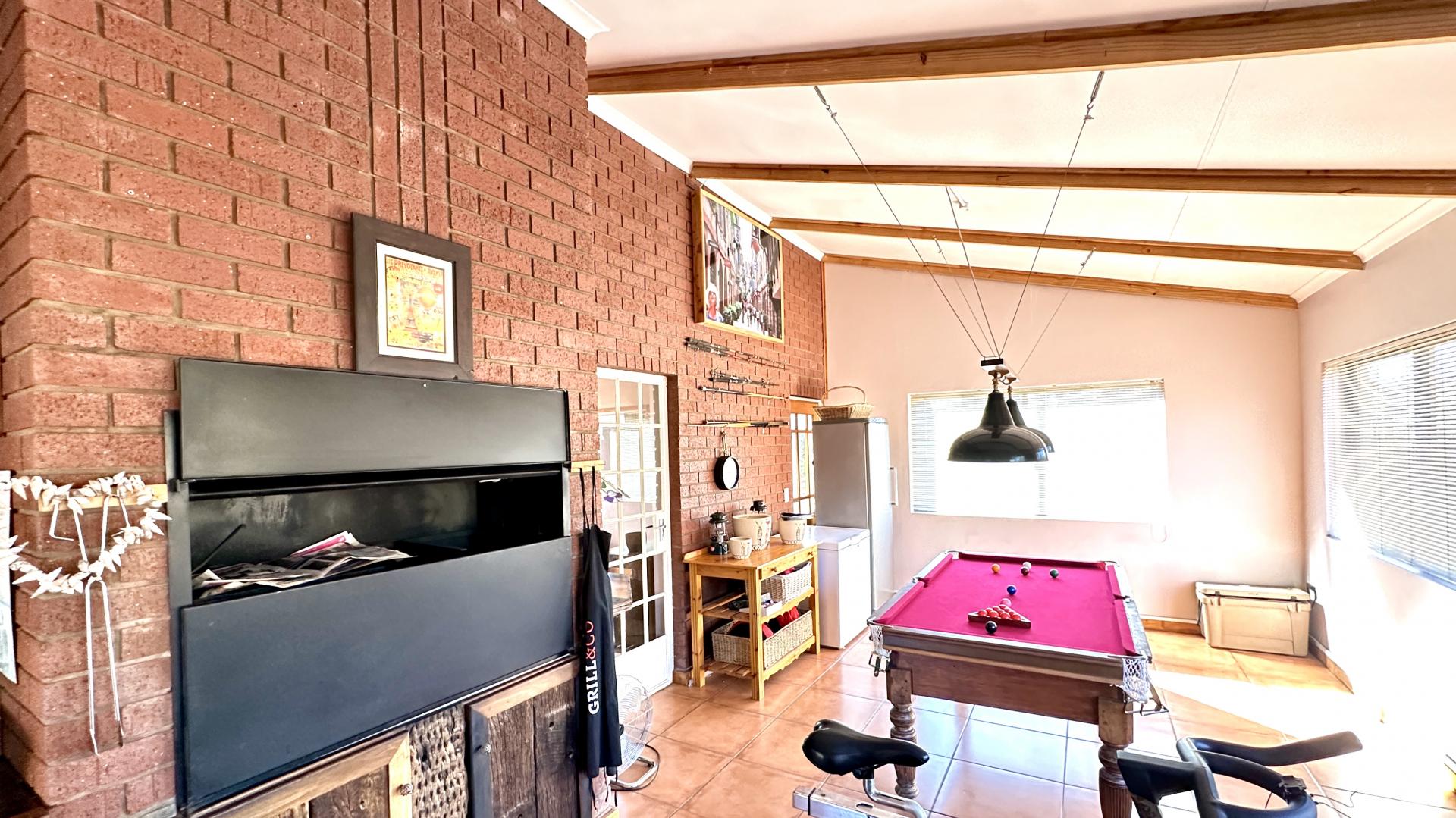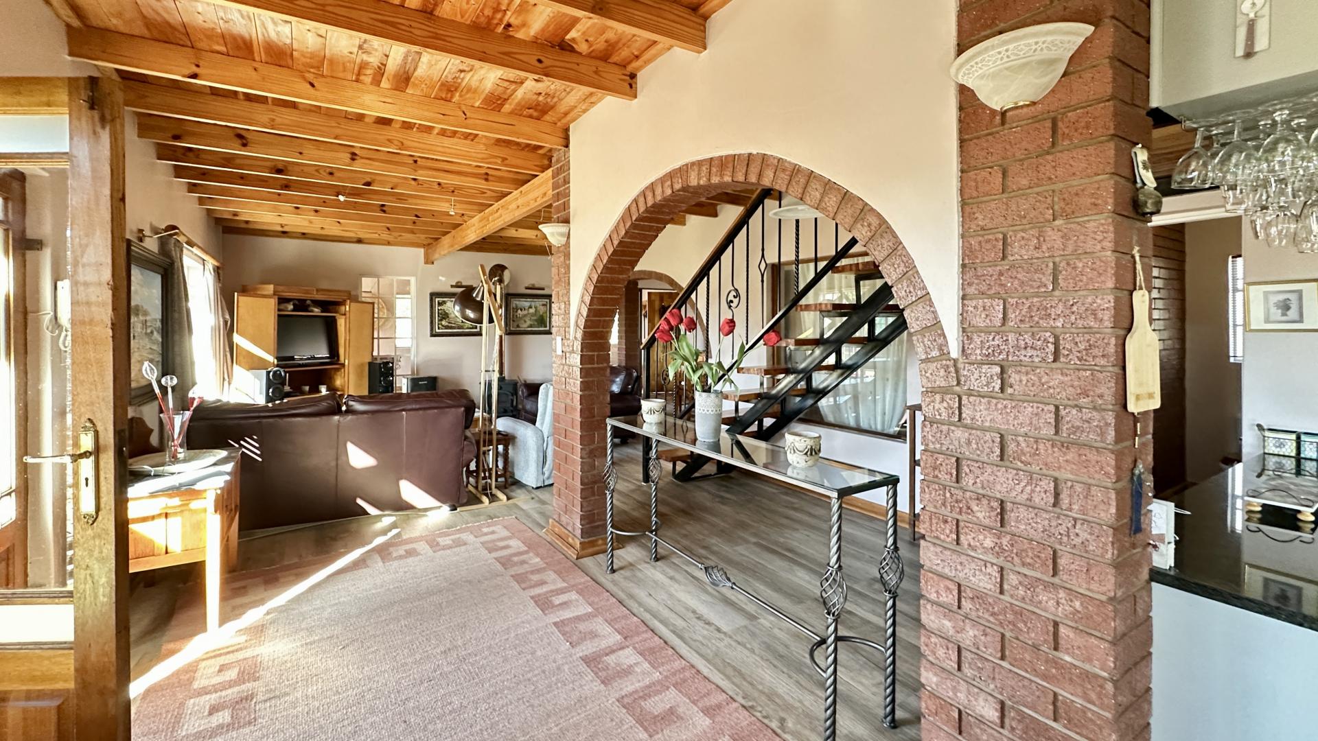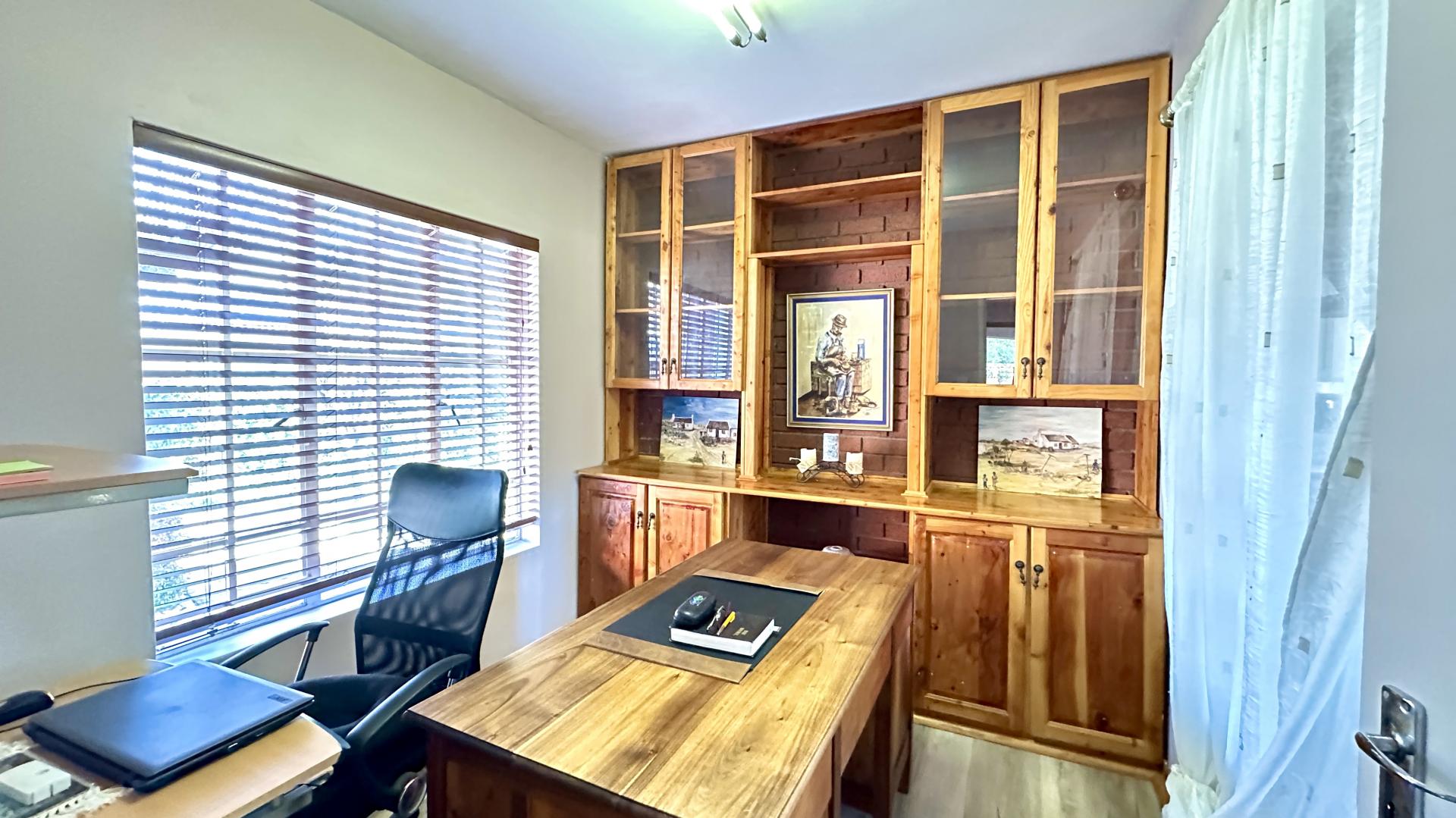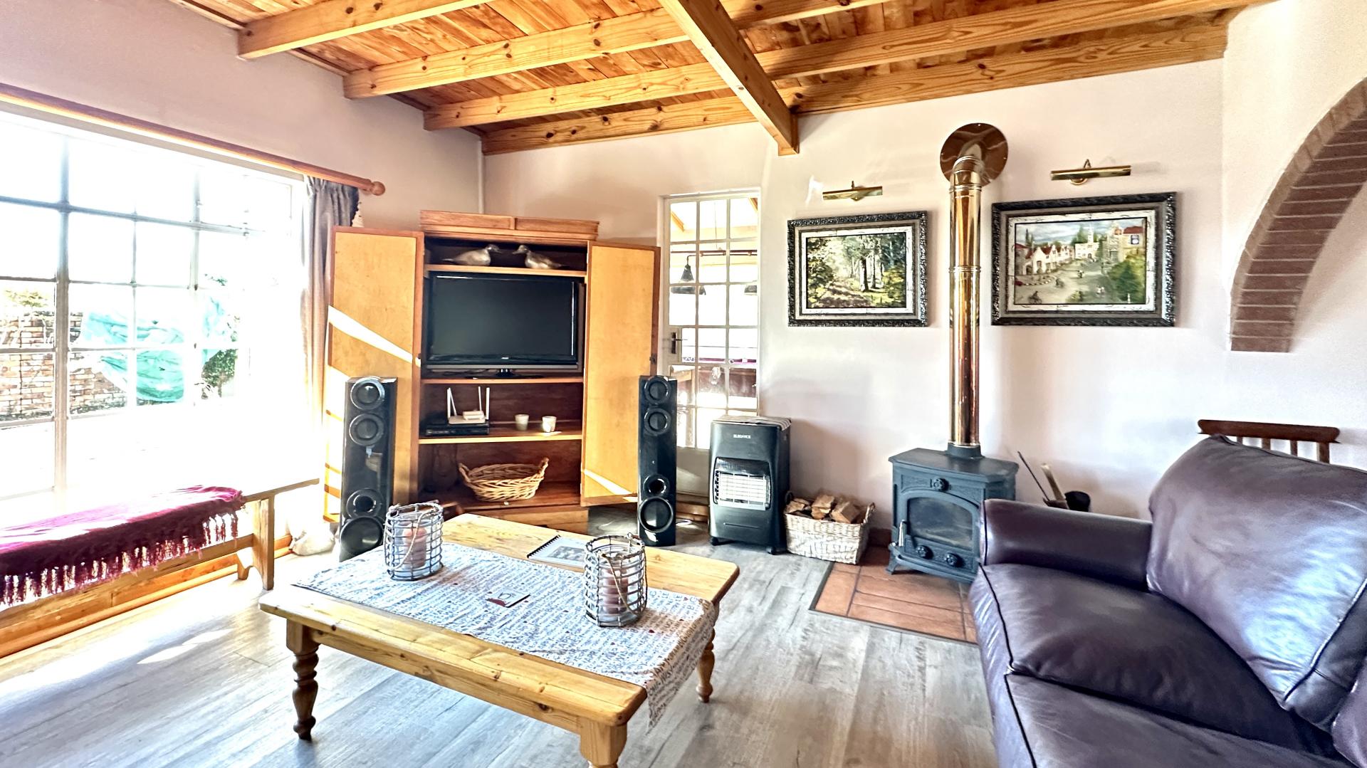 Generous living spaces flow seamlessly into an entertainment room complete with a built-in braai, ideal for hosting guests. A private study and powder room are conveniently situated off the main living area with a cozy combustion stove, adding both warmth and practicality.