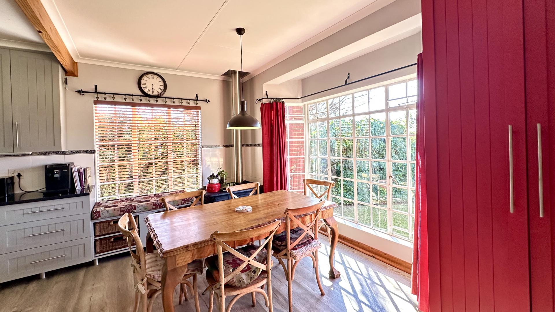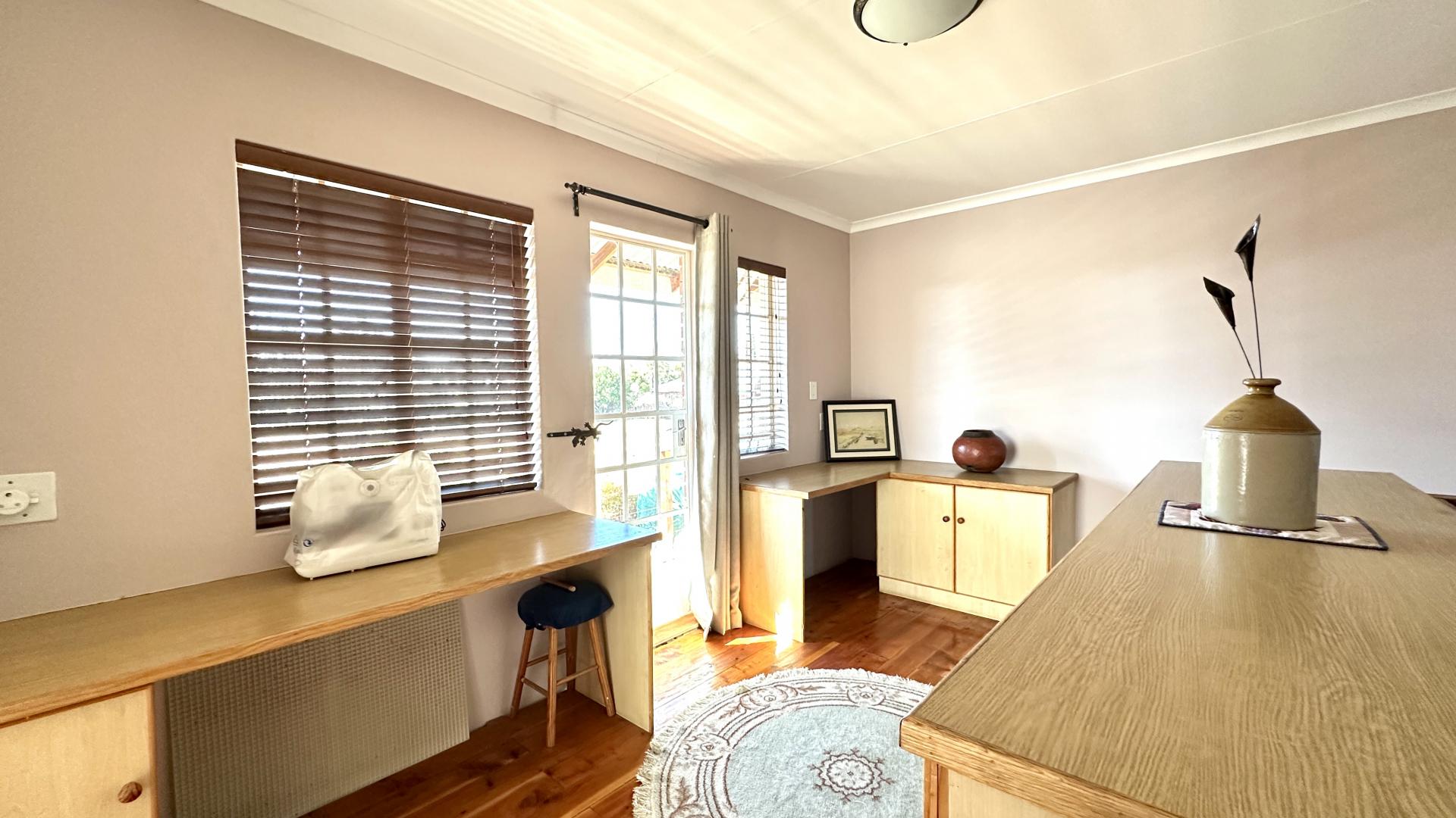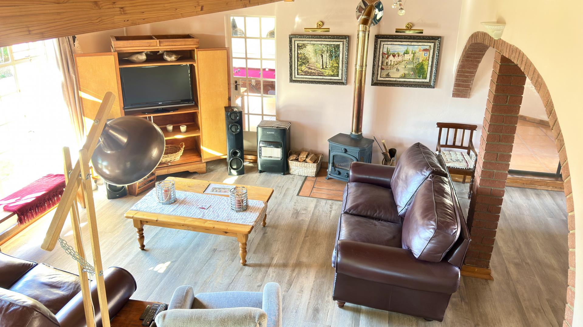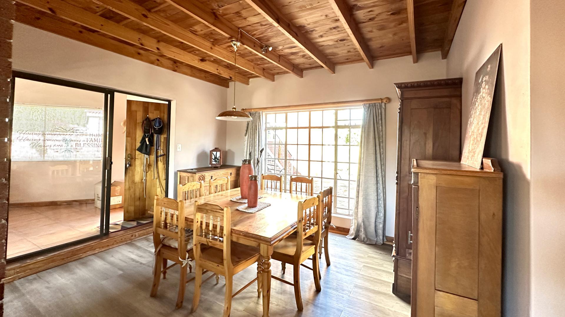 Generous living spaces flow seamlessly into an entertainment room complete with a built-in braai, ideal for hosting guests. A private study and powder room are conveniently situated off the main living area with a cozy combustion stove, adding both warmth and practicality.