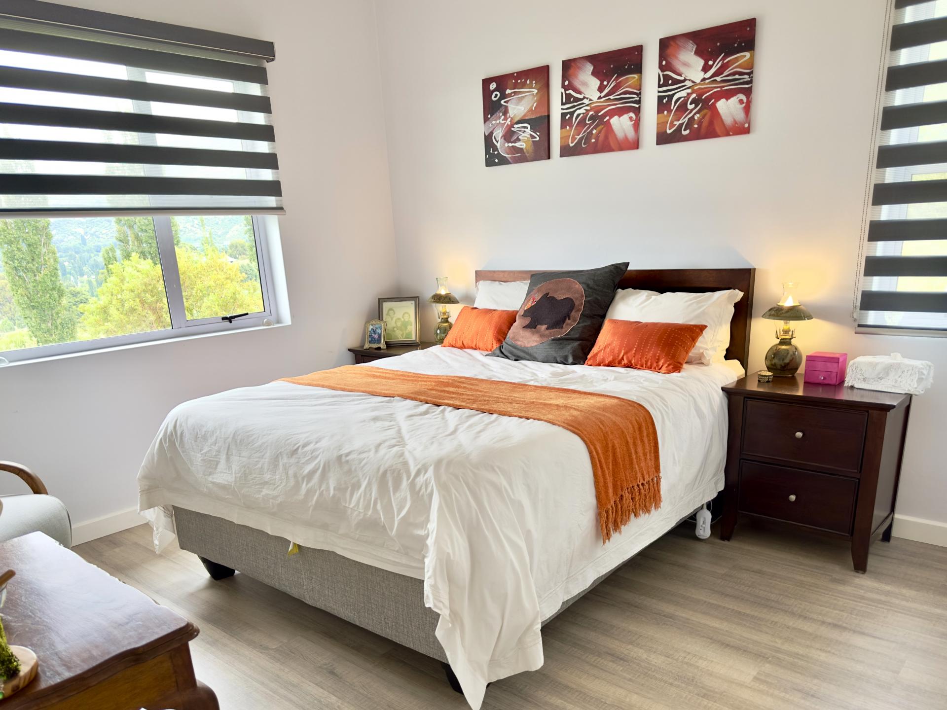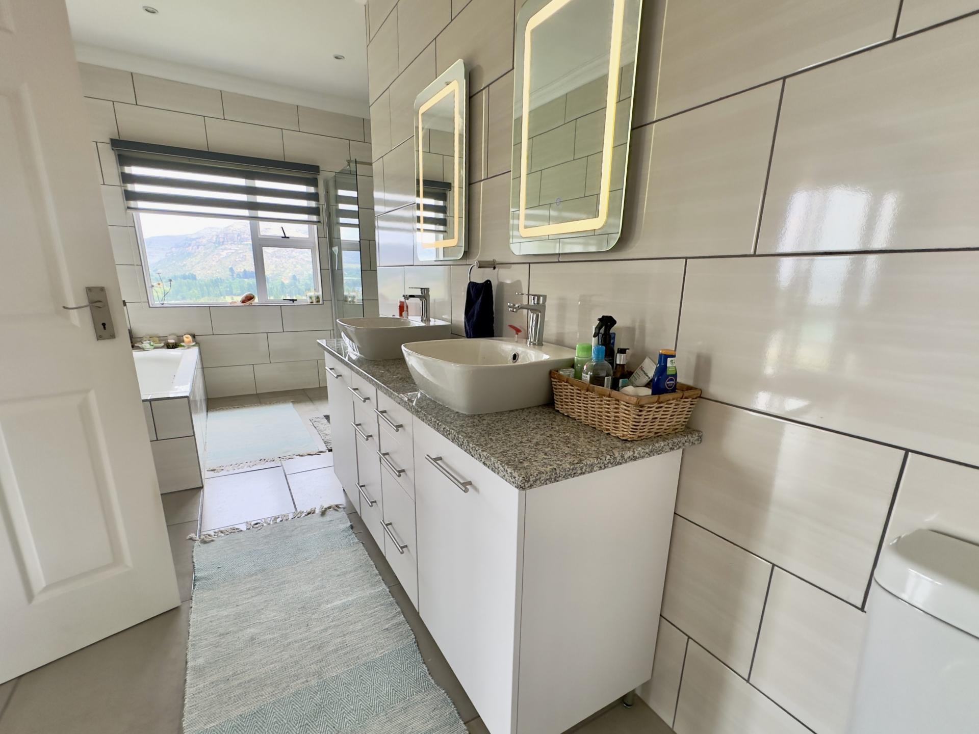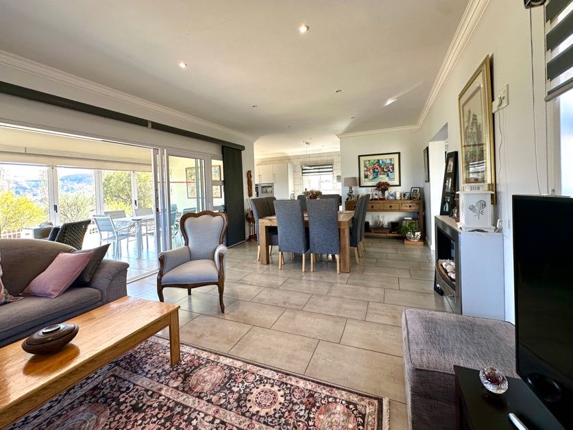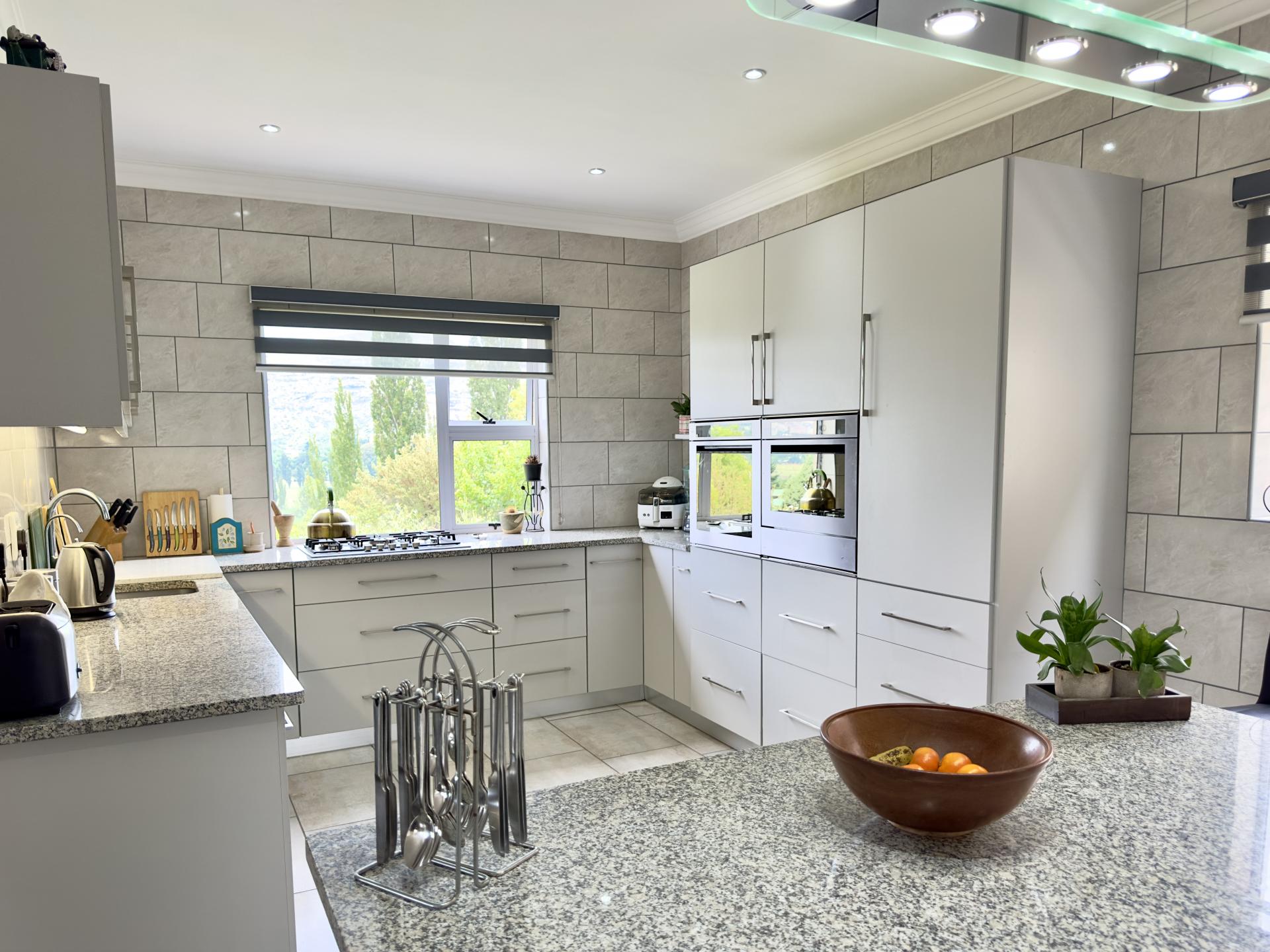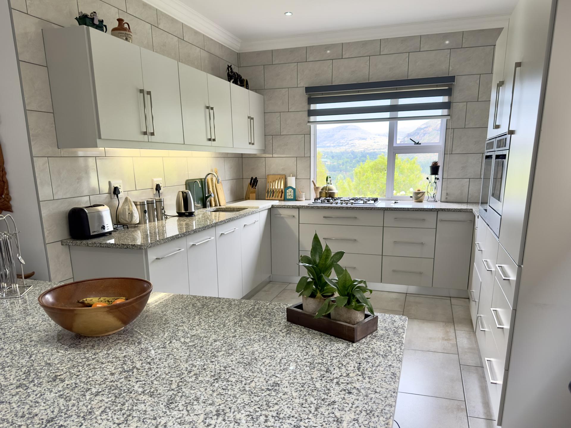 The home comprises a spacious open-plan living- and dining area together with a multi-functional entertainment area. The entertainment area is enclosed with aluminium stacking doors to allow uninterrupted mountain vistas. The well-designed kitchen features granite working tops and crisp white finishes. The scullery is carefully planned to be semi-concealed.