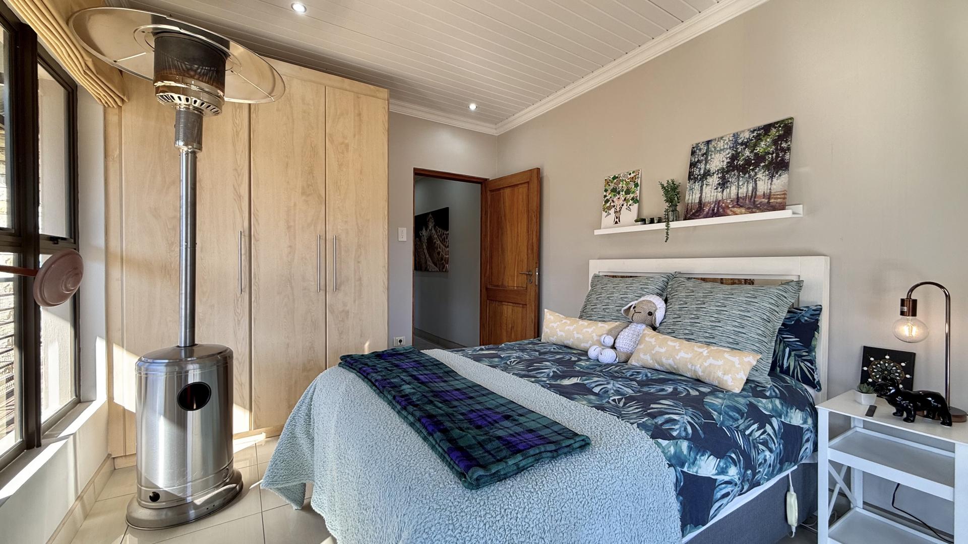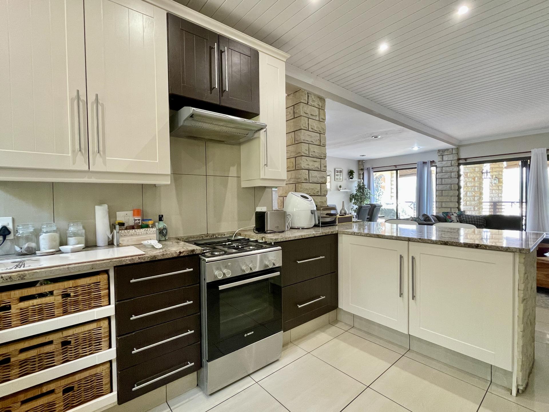 Step inside to discover a seamless open-plan living, dining, and kitchen area designed for modern comfort and effortless entertaining. The kitchen features granite countertops, a gas stove, and plenty of space for culinary creativity. The cozy lounge area is anchored by a combustion stove, creating a warm and inviting atmosphere on chilly evenings. The dining room flows directly onto the balcony, complete with a built-in braai, perfect for entertaining family and friends with the 16th Hole as your backdrop.