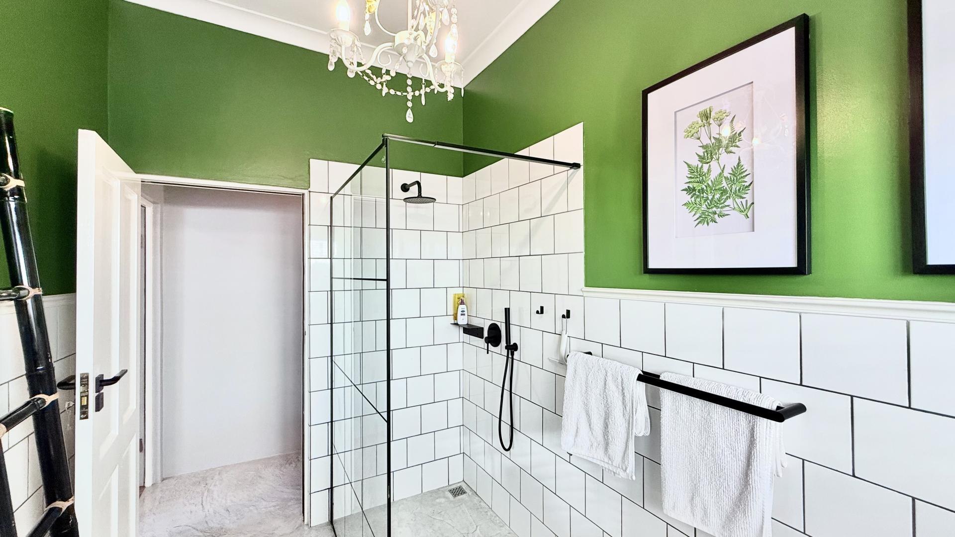 The stylish, well-appointed kitchen boasts a pantry cupboard and a gas stove, making it both functional and sophisticated.