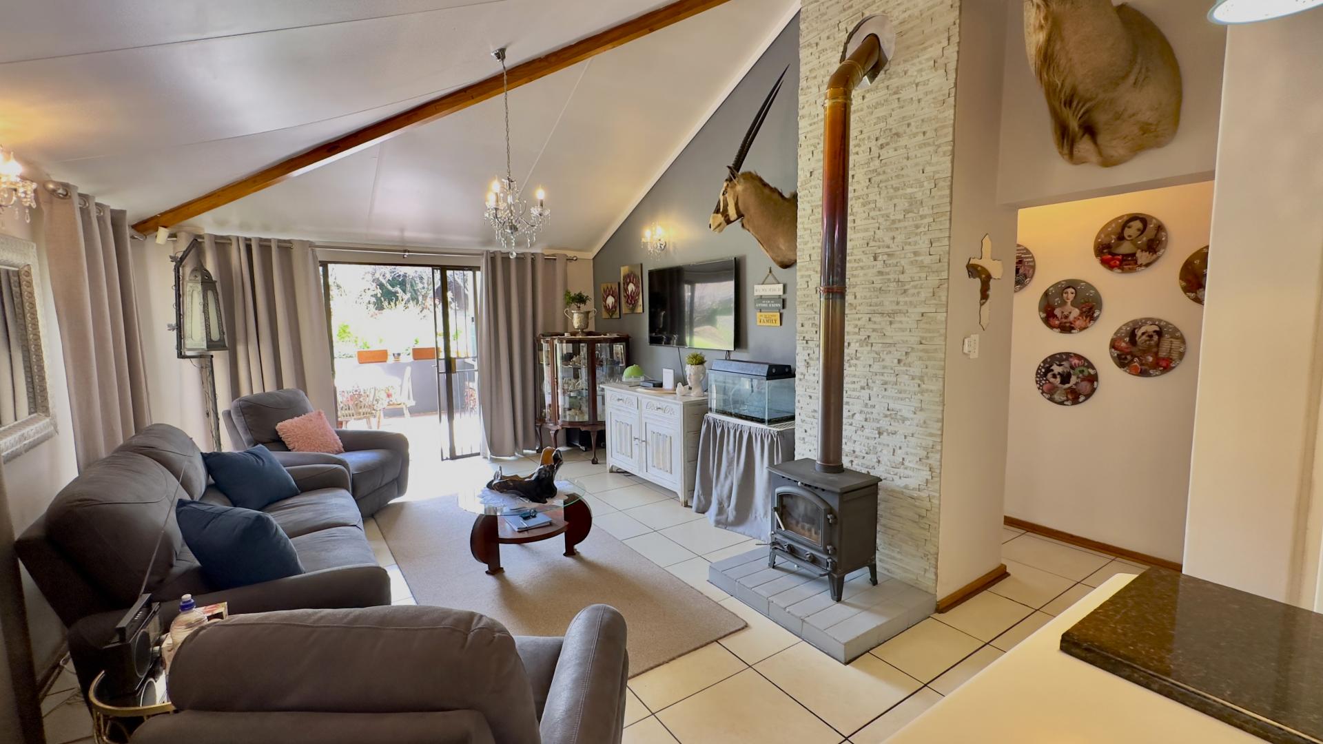 The kitchen is well-appointed with generous cupboard space and includes a separate laundry and scullery. The open-plan design flows seamlessly into the lounge and dining area, which opens out onto a covered patio with a built-in braai and counter space—ideal for outdoor entertaining.