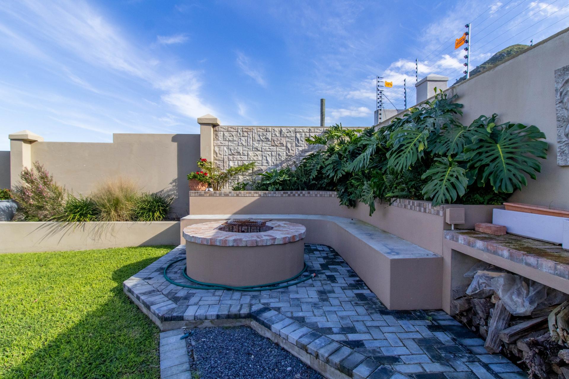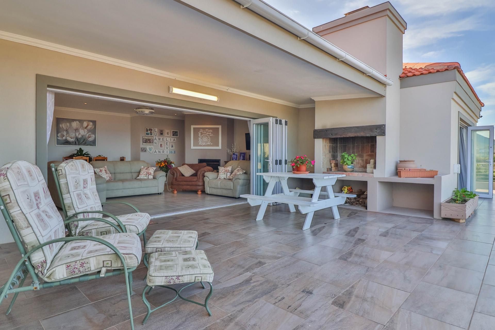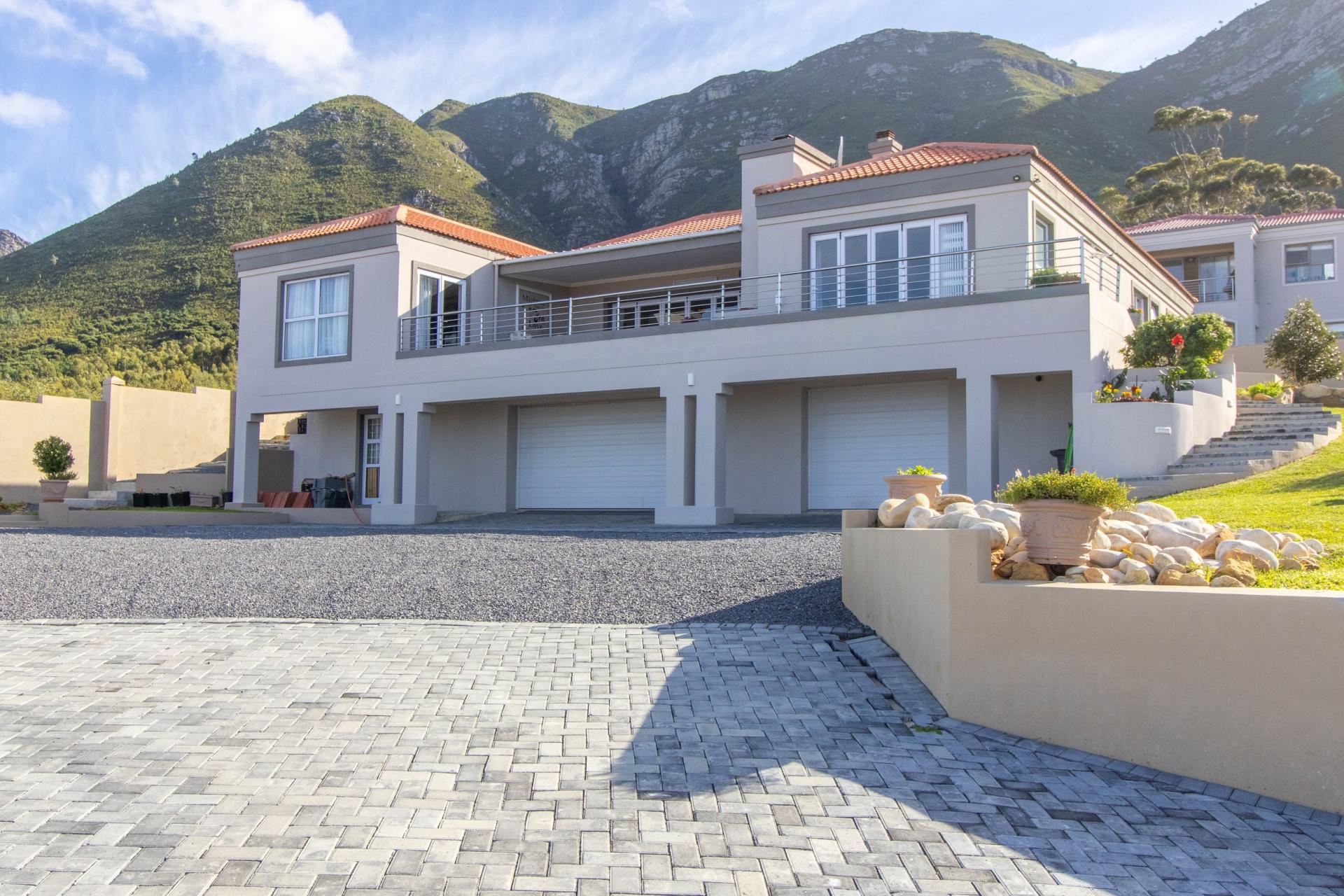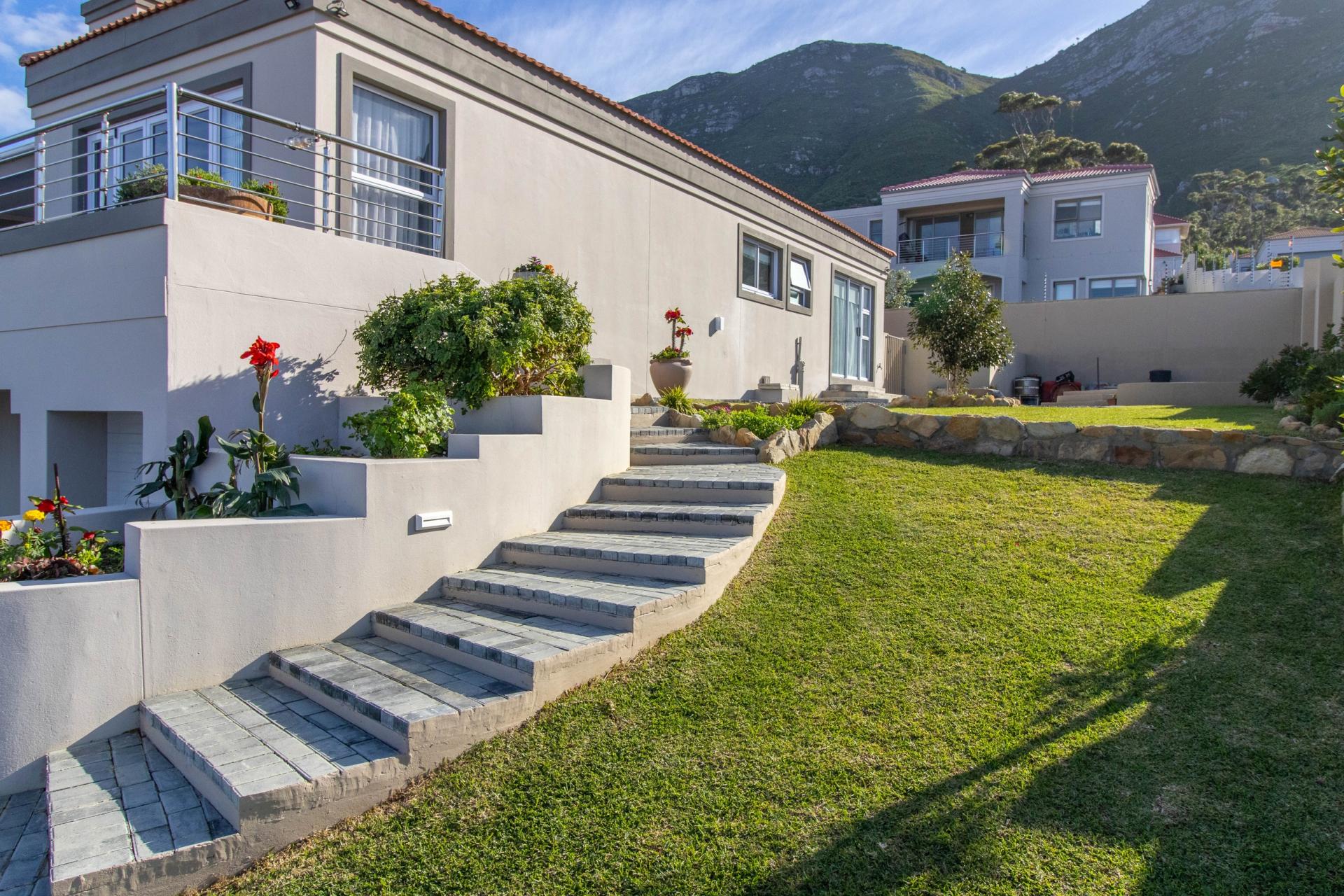 The well-maintained garden features a fire pit and scenic mountain views, creating a perfect retreat for outdoor enjoyment. The home also boasts 3 large garages on the lower level with direct access to the house and a spacious storeroom perfect for storing tools and outdoor items. Set within a secure and peaceful estate, this home offers the perfect blend of nature and convenience. Its prime location provides easy access to all amenities, including beaches, schools, wine farms, and restaurants.