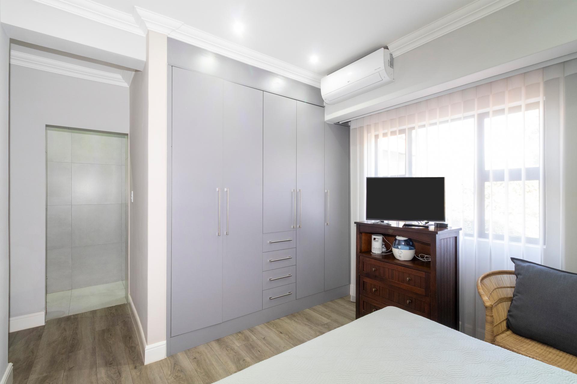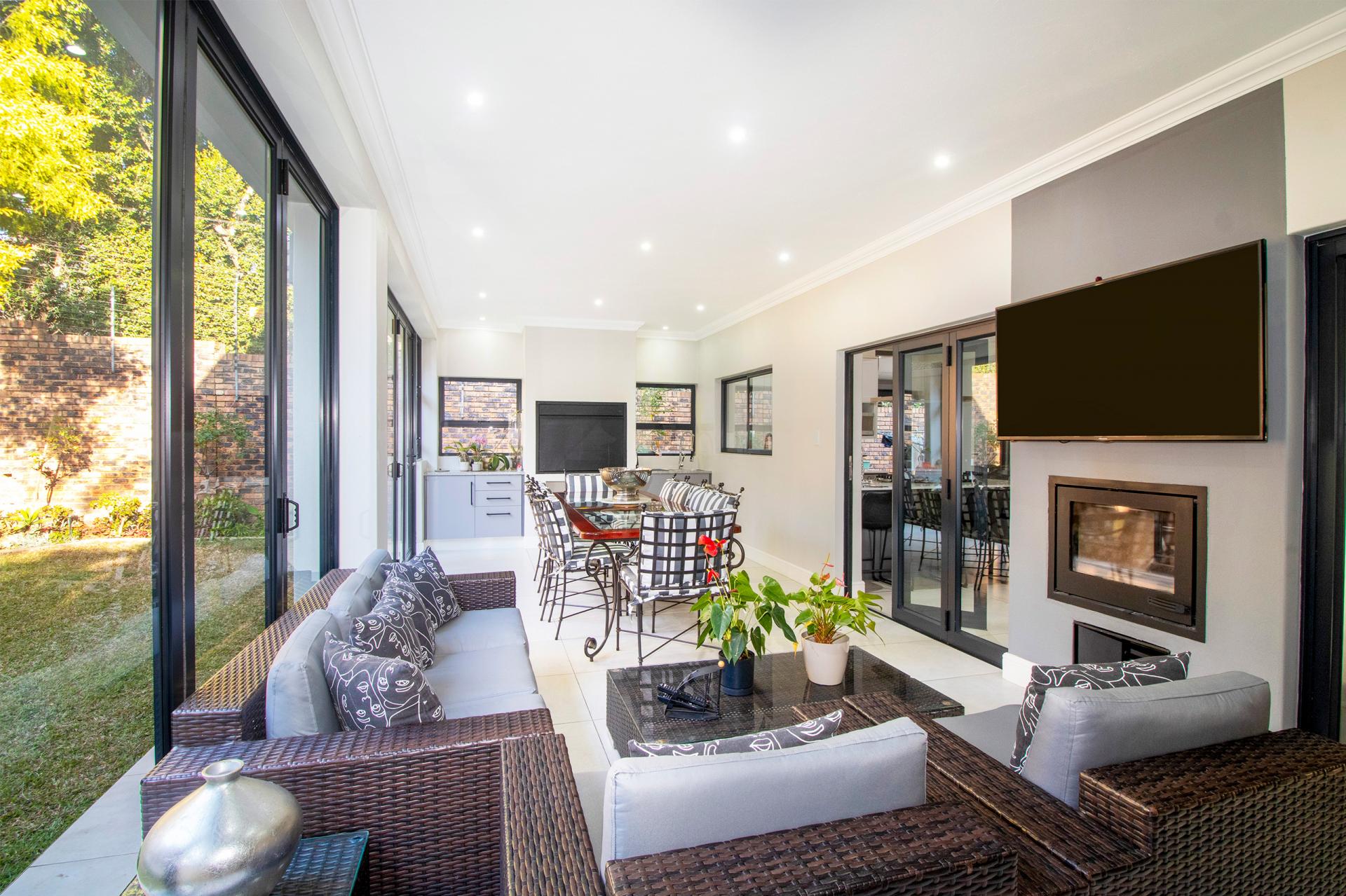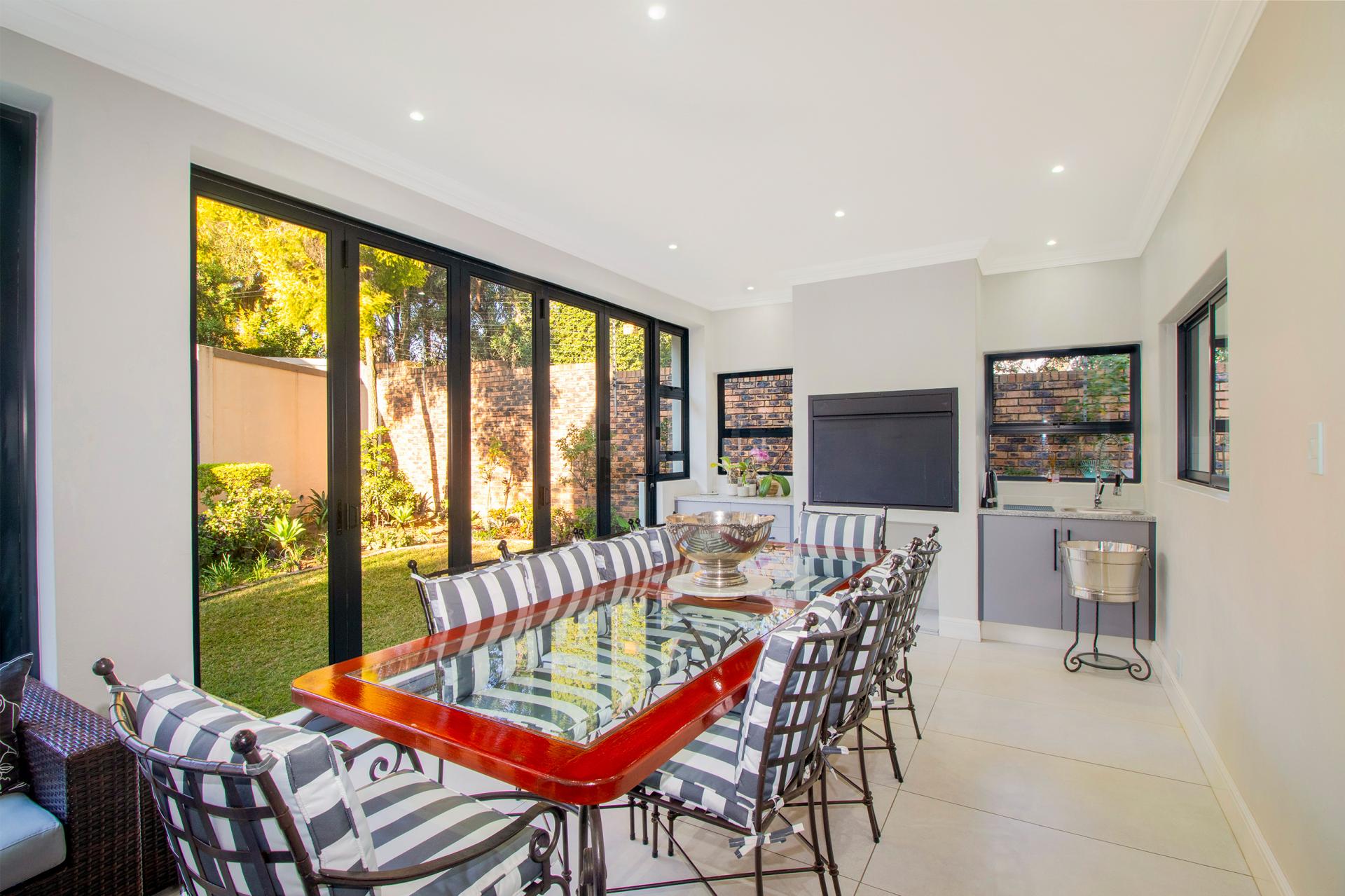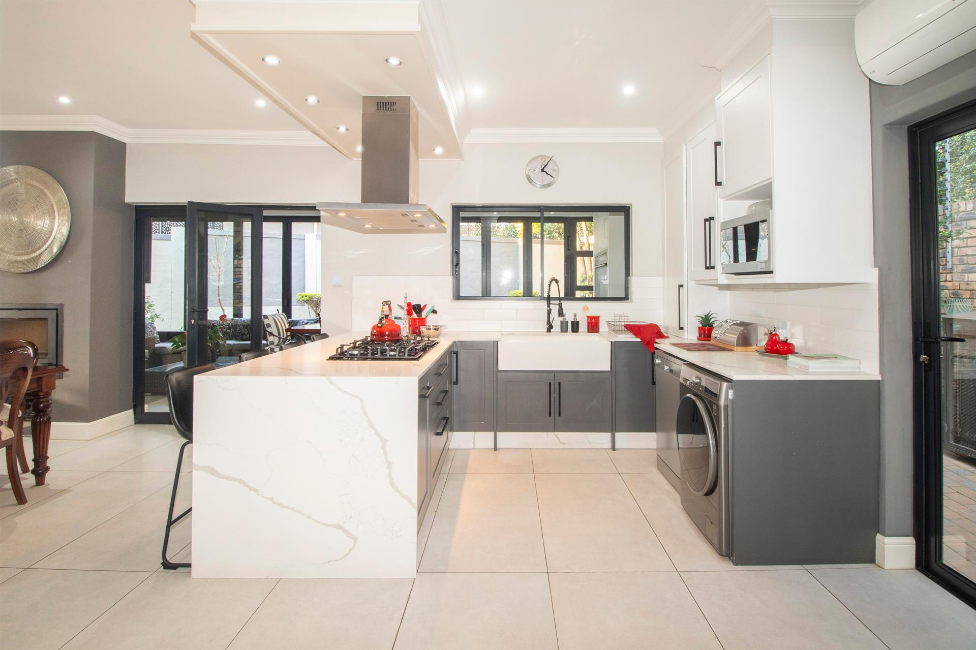 All three bedrooms are en-suite, offering privacy and comfort, while a stylish guest bathroom and large dedicated study add to the home’s convenience. The open-plan lounge and dining area flows effortlessly into a beautiful, well-appointed kitchen featuring a large gas stove — ideal for both everyday family meals and entertaining. From here, the living spaces extend into a fully enclosed entertainment patio, complete with a custom-built bar — perfect for hosting guests all year round. A cozy pajama lounge offers a secondary living area for relaxed family time.