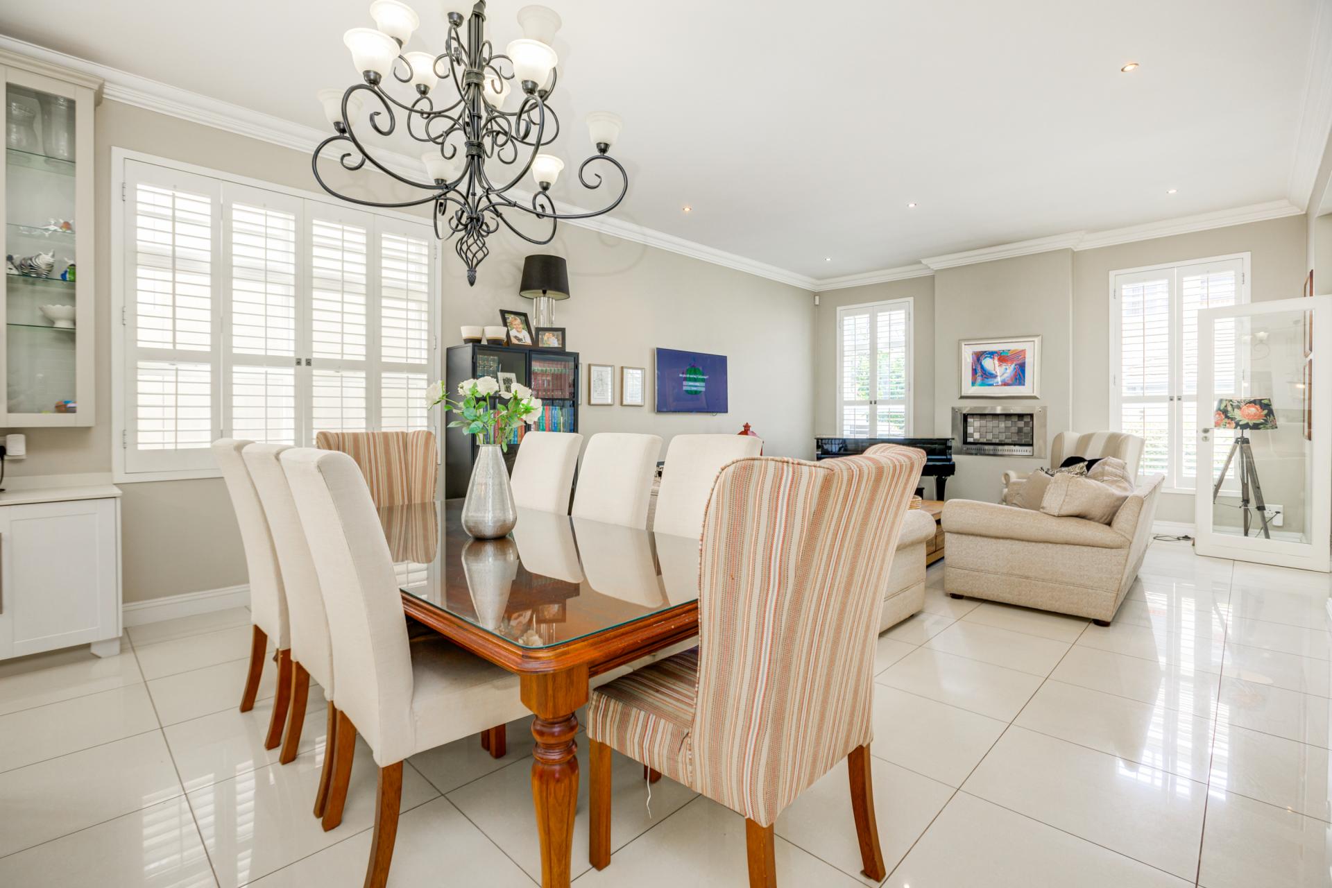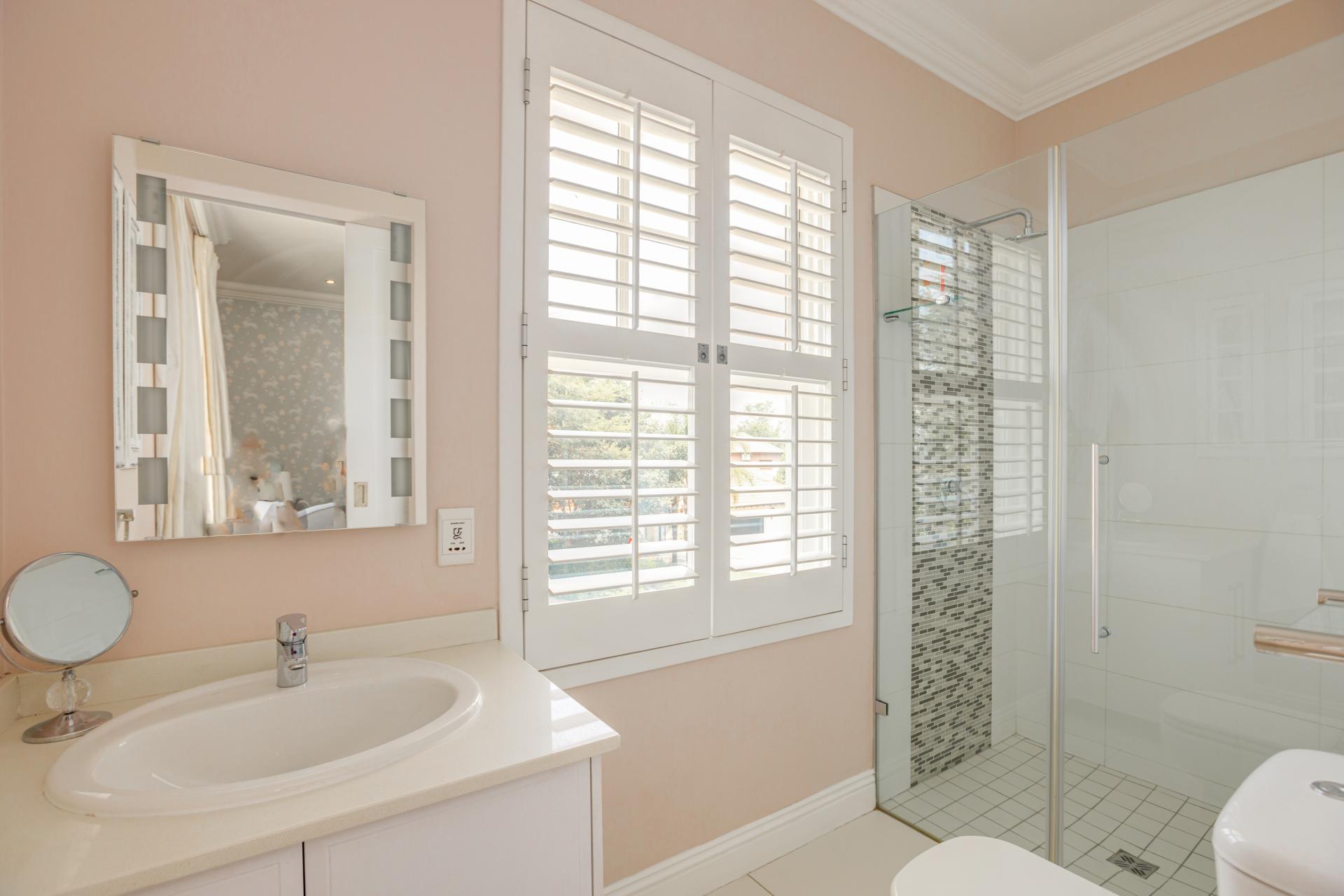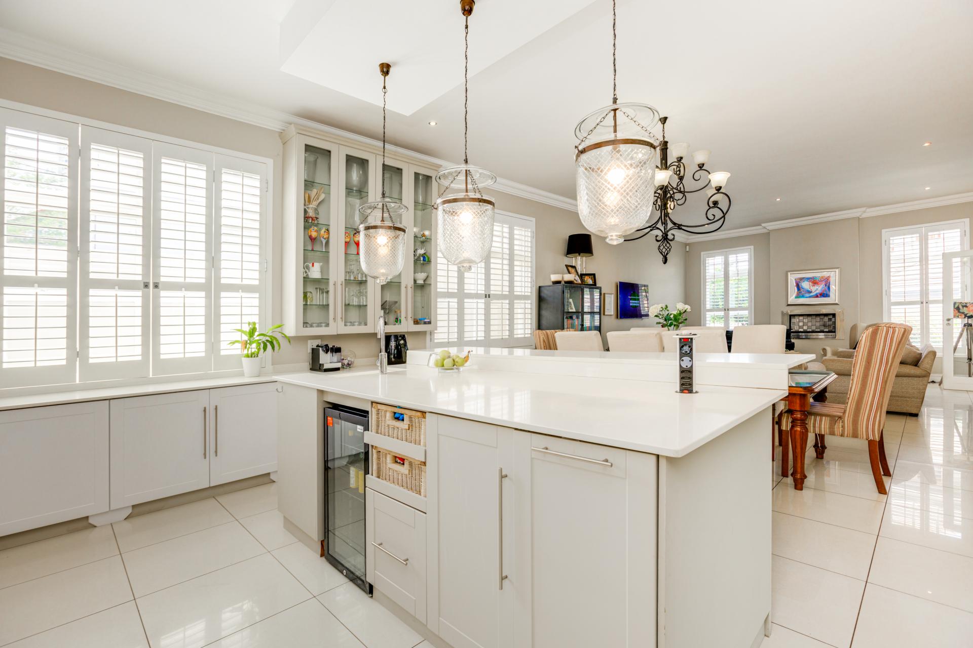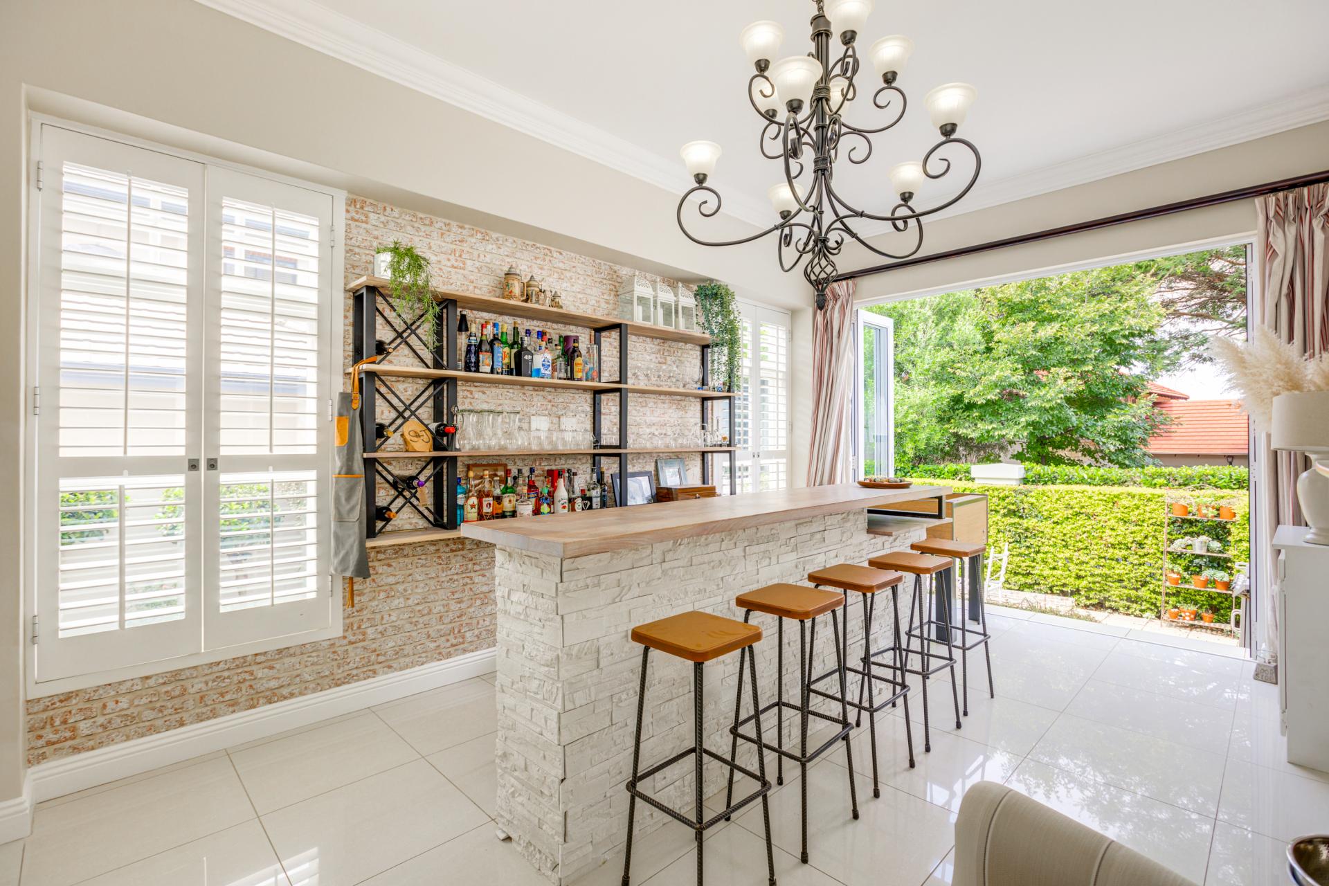 Step inside to discover spacious, flowing living areas that include a formal lounge with a cozy gas fireplace, an open-plan dining area, and a beautifully designed white kitchen, featuring a SMEG oven with extractor fan, gas hob, and electric oven, as well as sleek Caesarstone countertops and a center island that makes meal preparation effortless. The home is adorned with American shutters throughout, enhancing both privacy and aesthetic appeal. A separate scullery provides space for three appliances, while the guest cloakroom, elegantly finished with wallpaper, adds a touch of sophistication. The stylish bar area is perfect for entertaining, seamlessly connecting to a quaint outdoor dining space through stacking aluminum doors, making it an ideal setting for alfresco dining. A large storeroom or staffroom with a separate shower, basin, and toilet adds further convenience.