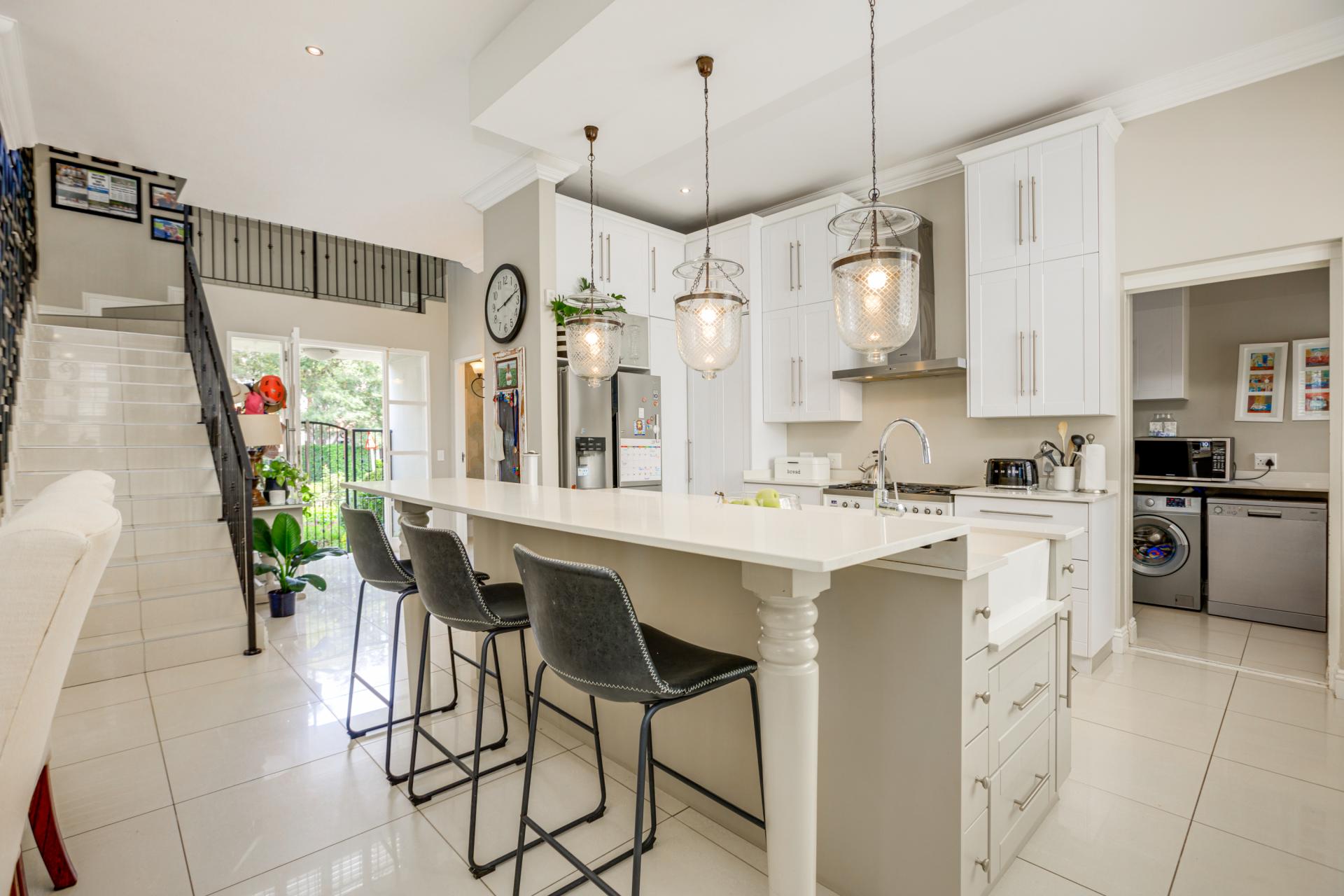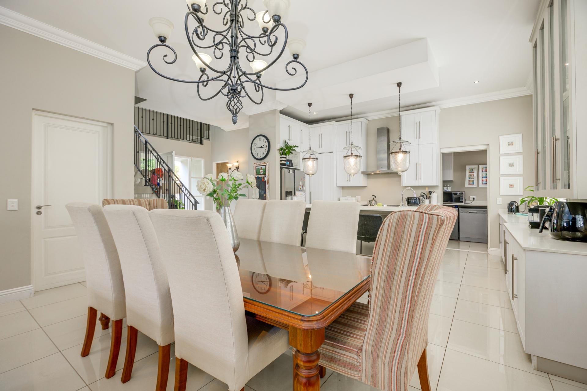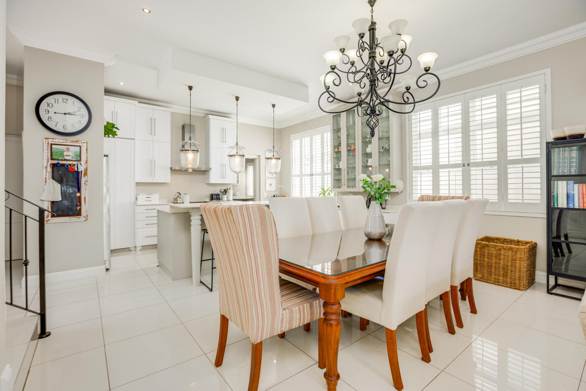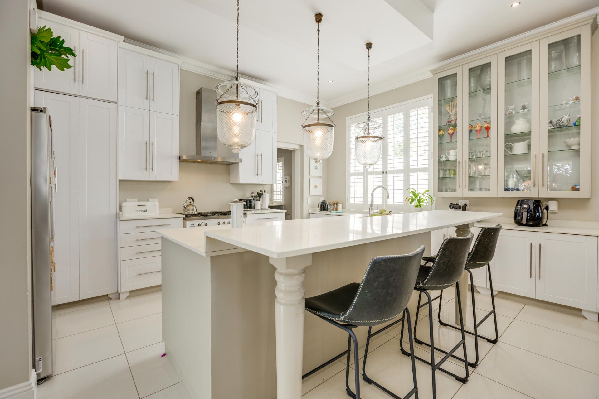 Step inside to discover spacious, flowing living areas that include a formal lounge with a cozy gas fireplace, an open-plan dining area, and a beautifully designed white kitchen, featuring a SMEG oven with extractor fan, gas hob, and electric oven, as well as sleek Caesarstone countertops and a center island that makes meal preparation effortless. The home is adorned with American shutters throughout, enhancing both privacy and aesthetic appeal. A separate scullery provides space for three appliances, while the guest cloakroom, elegantly finished with wallpaper, adds a touch of sophistication. The stylish bar area is perfect for entertaining, seamlessly connecting to a quaint outdoor dining space through stacking aluminum doors, making it an ideal setting for alfresco dining. A large storeroom or staffroom with a separate shower, basin, and toilet adds further convenience.