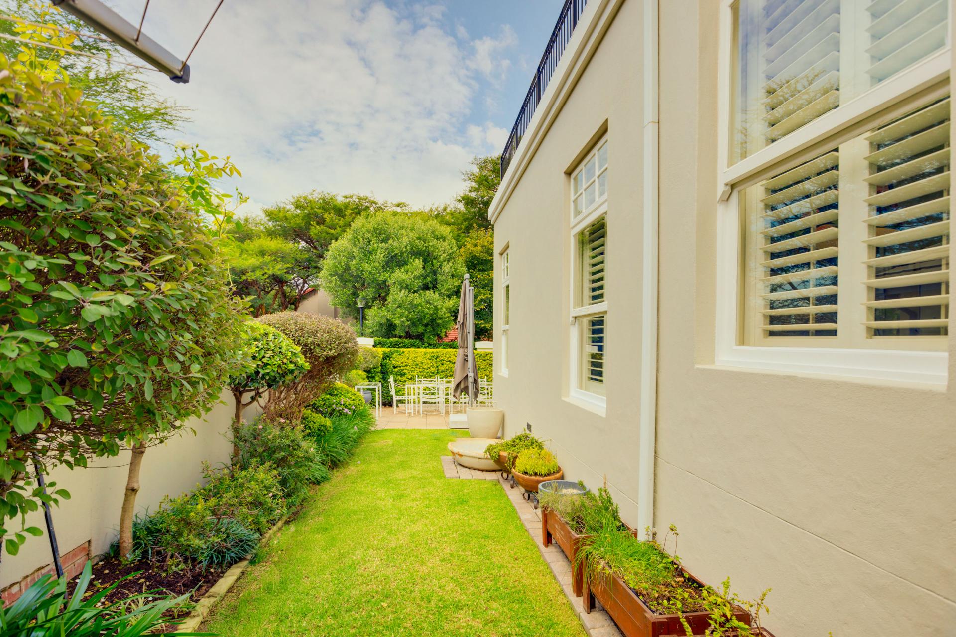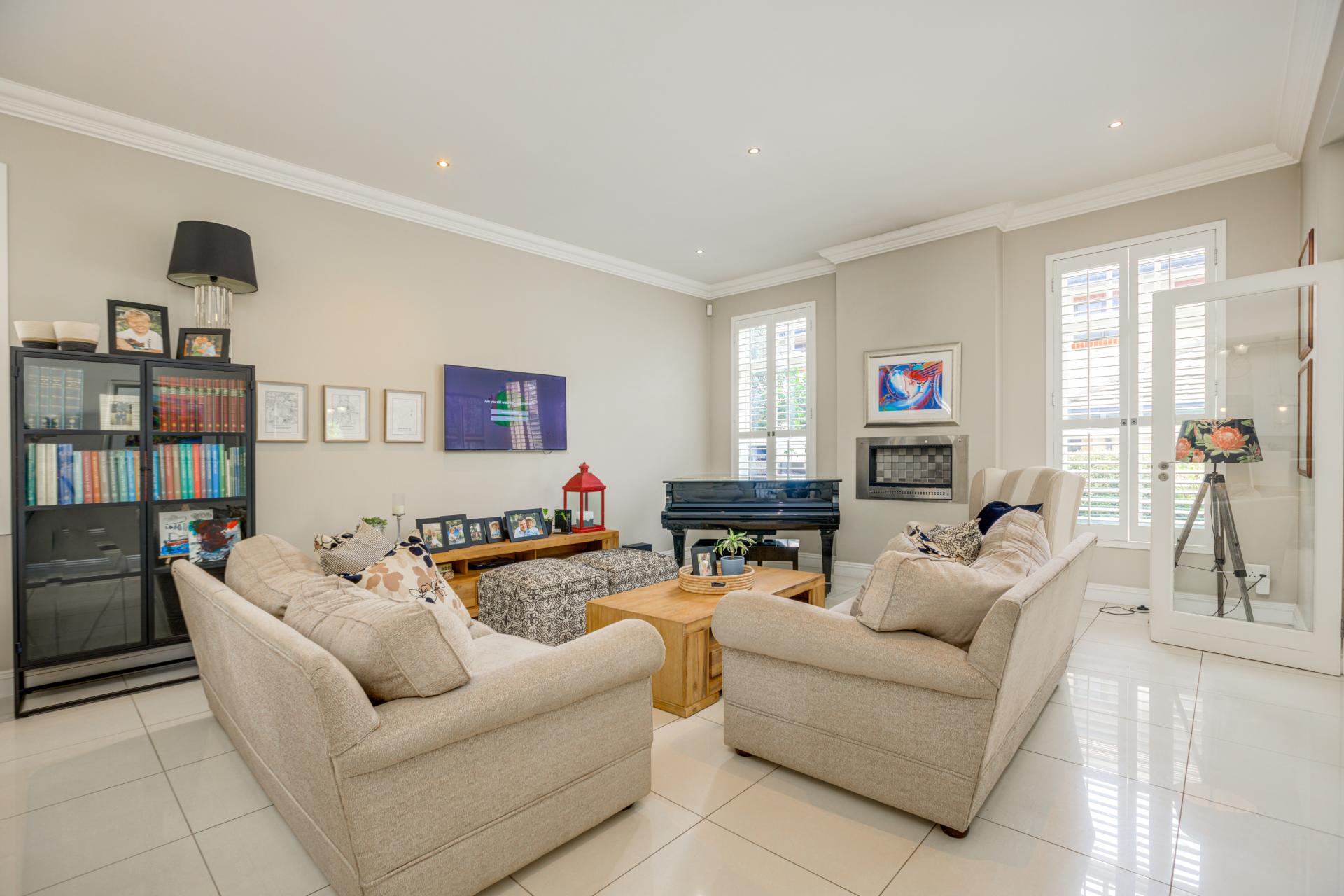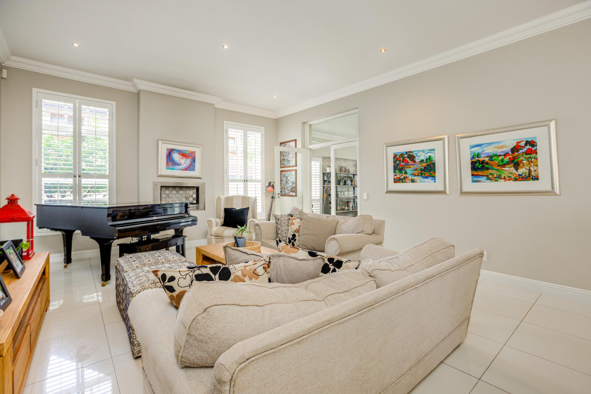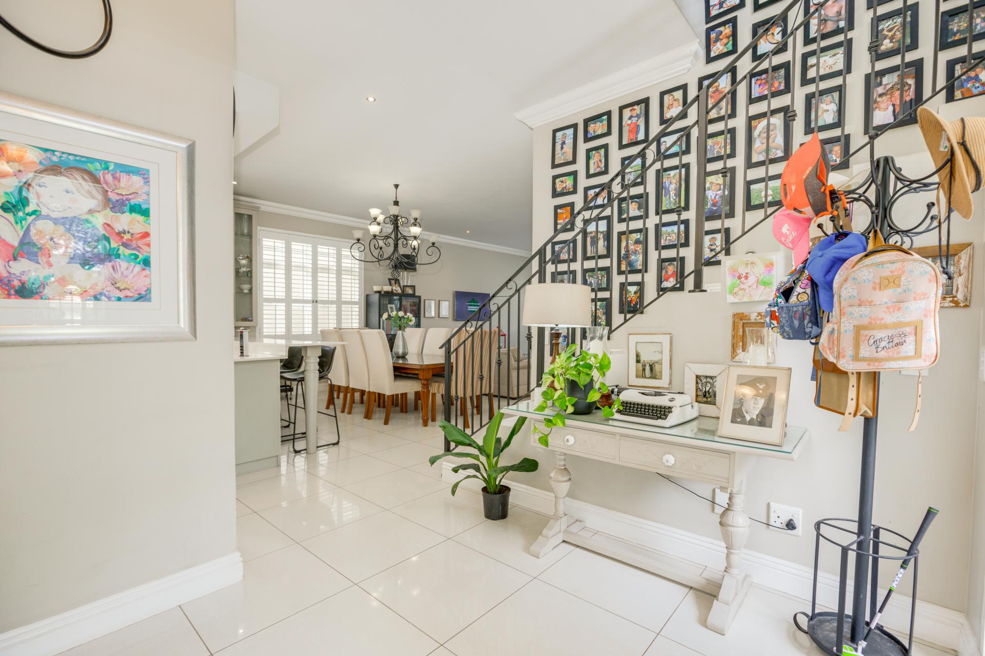Step inside to discover spacious, flowing living areas that include a formal lounge with a cozy gas fireplace, an open-plan dining area, and a beautifully designed white kitchen, featuring a SMEG oven with extractor fan, gas hob, and electric oven, as well as sleek Caesarstone countertops and a center island that makes meal preparation effortless. The home is adorned with American shutters throughout, enhancing both privacy and aesthetic appeal. A separate scullery provides space for three appliances, while the guest cloakroom, elegantly finished with wallpaper, adds a touch of sophistication. The stylish bar area is perfect for entertaining, seamlessly connecting to a quaint outdoor dining space through stacking aluminum doors, making it an ideal setting for alfresco dining. A large storeroom or staffroom with a separate shower, basin, and toilet adds further convenience.