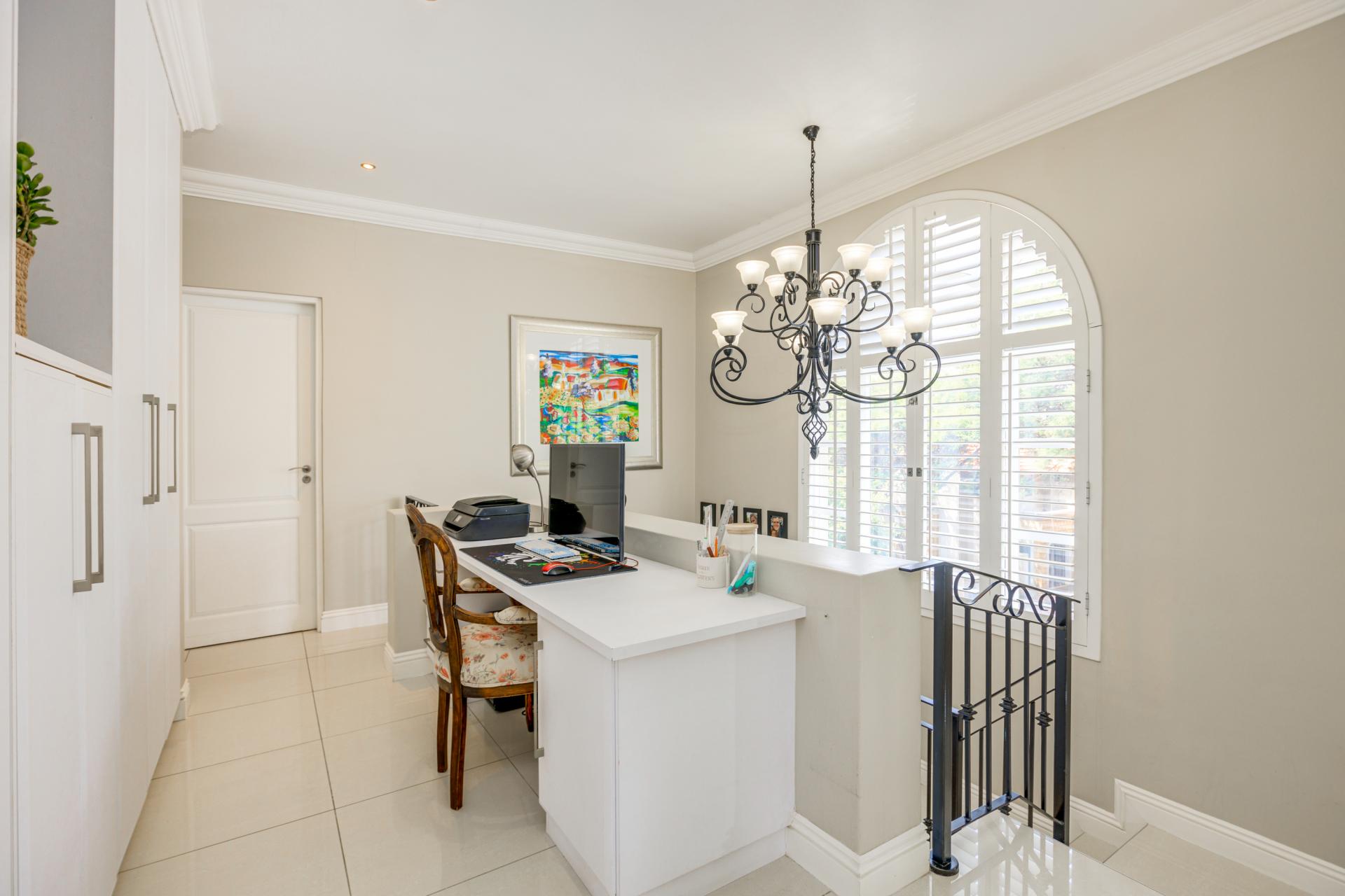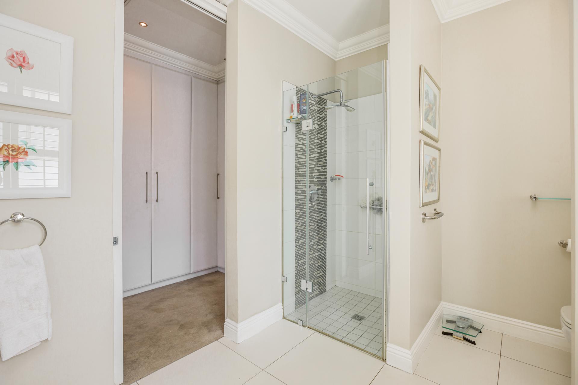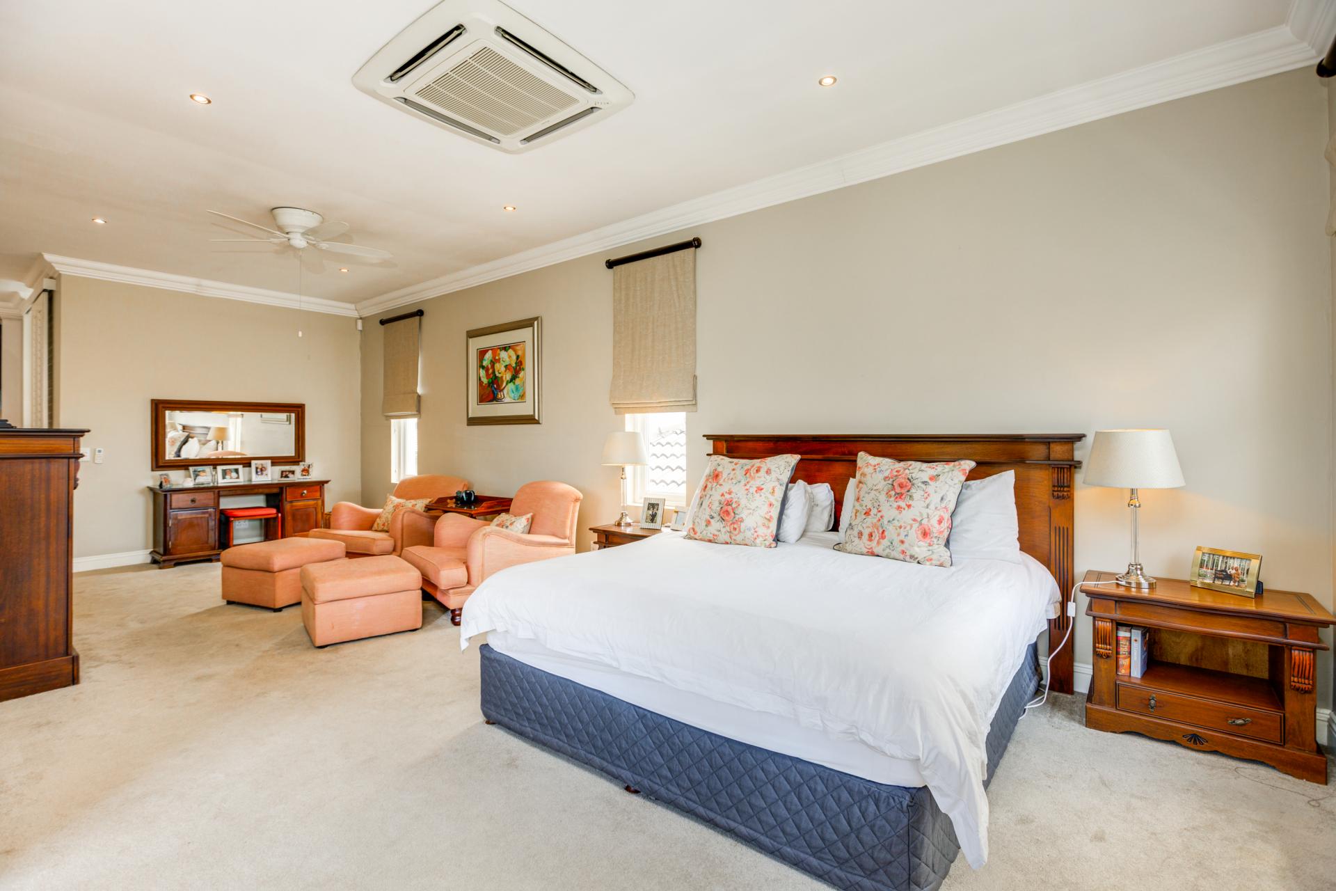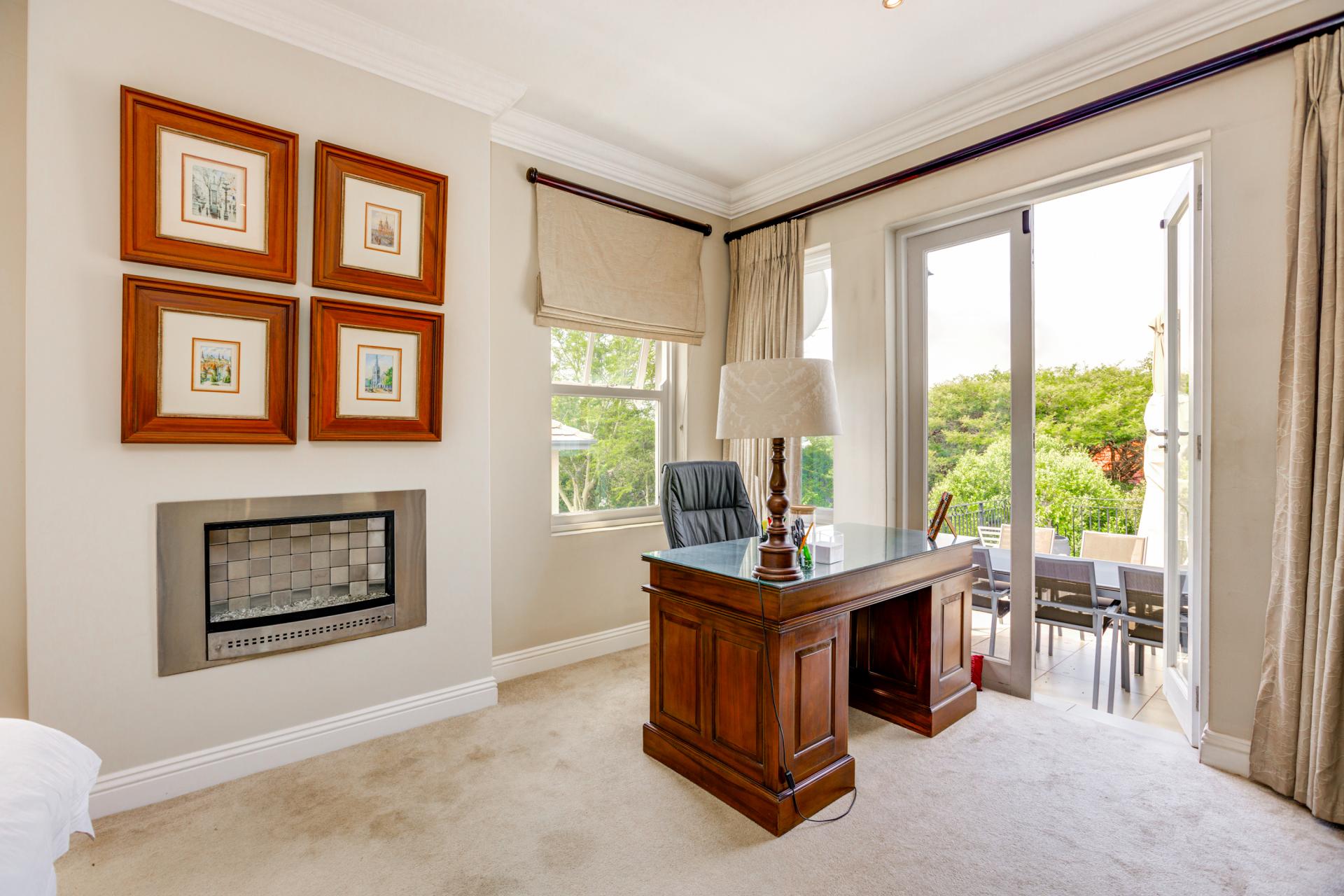 Upstairs, a study pause area with ample cupboard space provides a perfect workspace or reading nook. The first bedroom is spacious and carpeted, complete with American shutters, generous built-in cupboards, an en-suite bathroom, and air conditioning. The second bedroom, also carpeted and fitted with ample cupboard space, features an en-suite bathroom with a shower, basin, and toilet and opens onto a gorgeous balcony, offering serene views of the estate and lush green tree canopies. Completing the upstairs accommodation is the magnificent main bedroom, a sanctuary of luxury that includes a private study area leading to a balcony with breathtaking views. A separate, large walk-in dresser provides ample storage space, while the main en-suite bathroom exudes opulence with double vanities set on sleek steel stone countertops, a spacious bath, heated towel rails, and a large shower. All bedrooms in the home are fitted with air conditioning, ensuring comfort throughout the seasons.