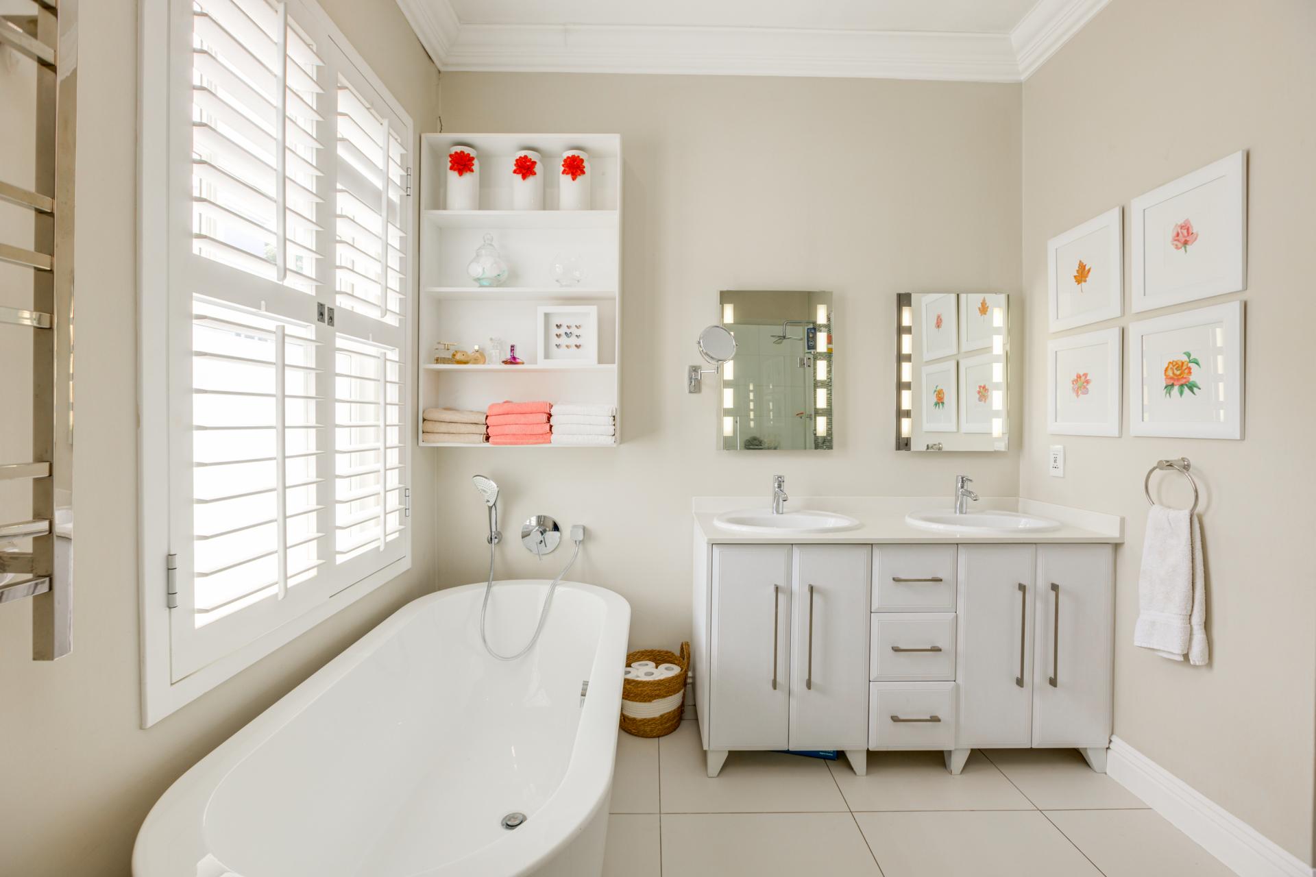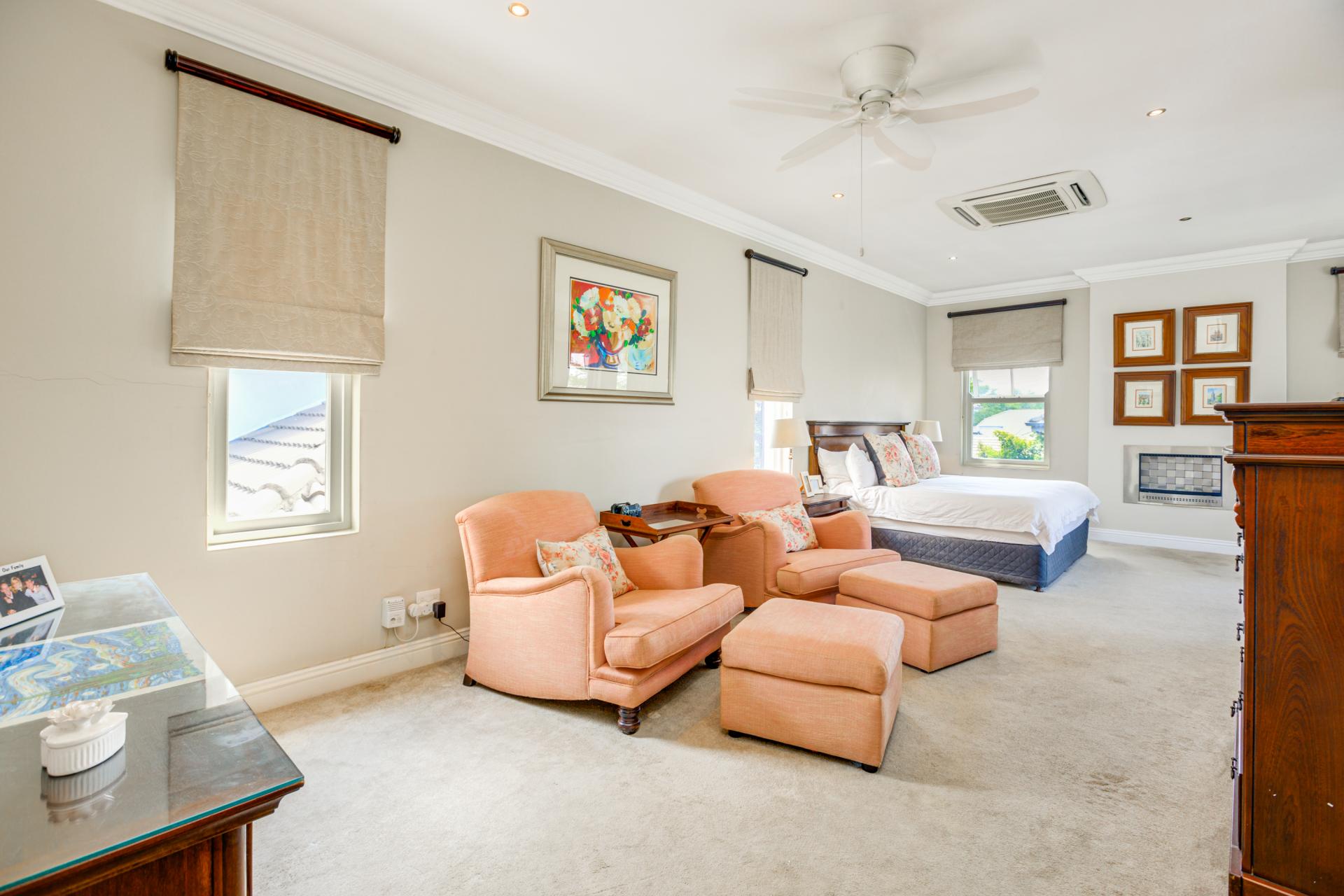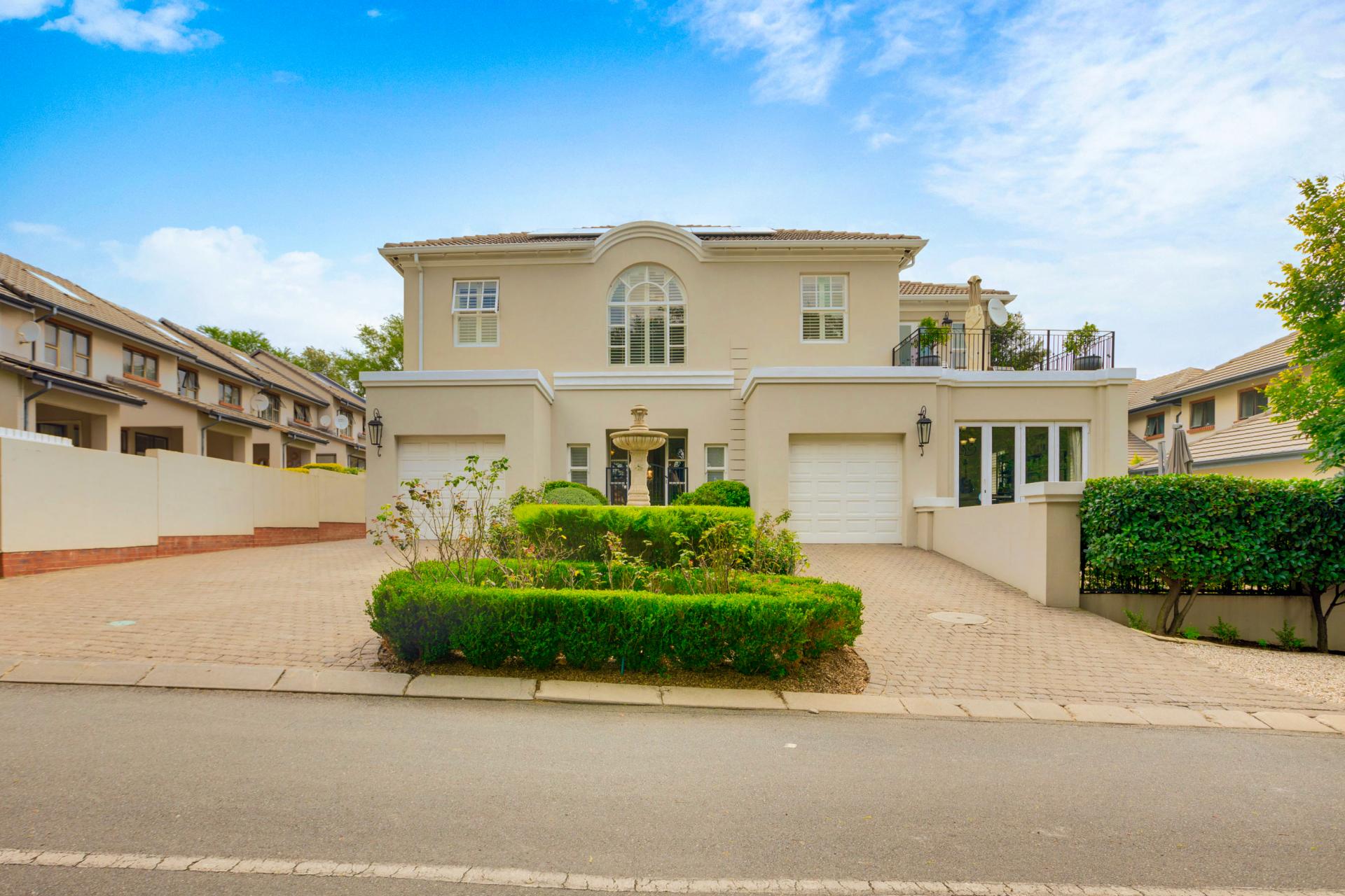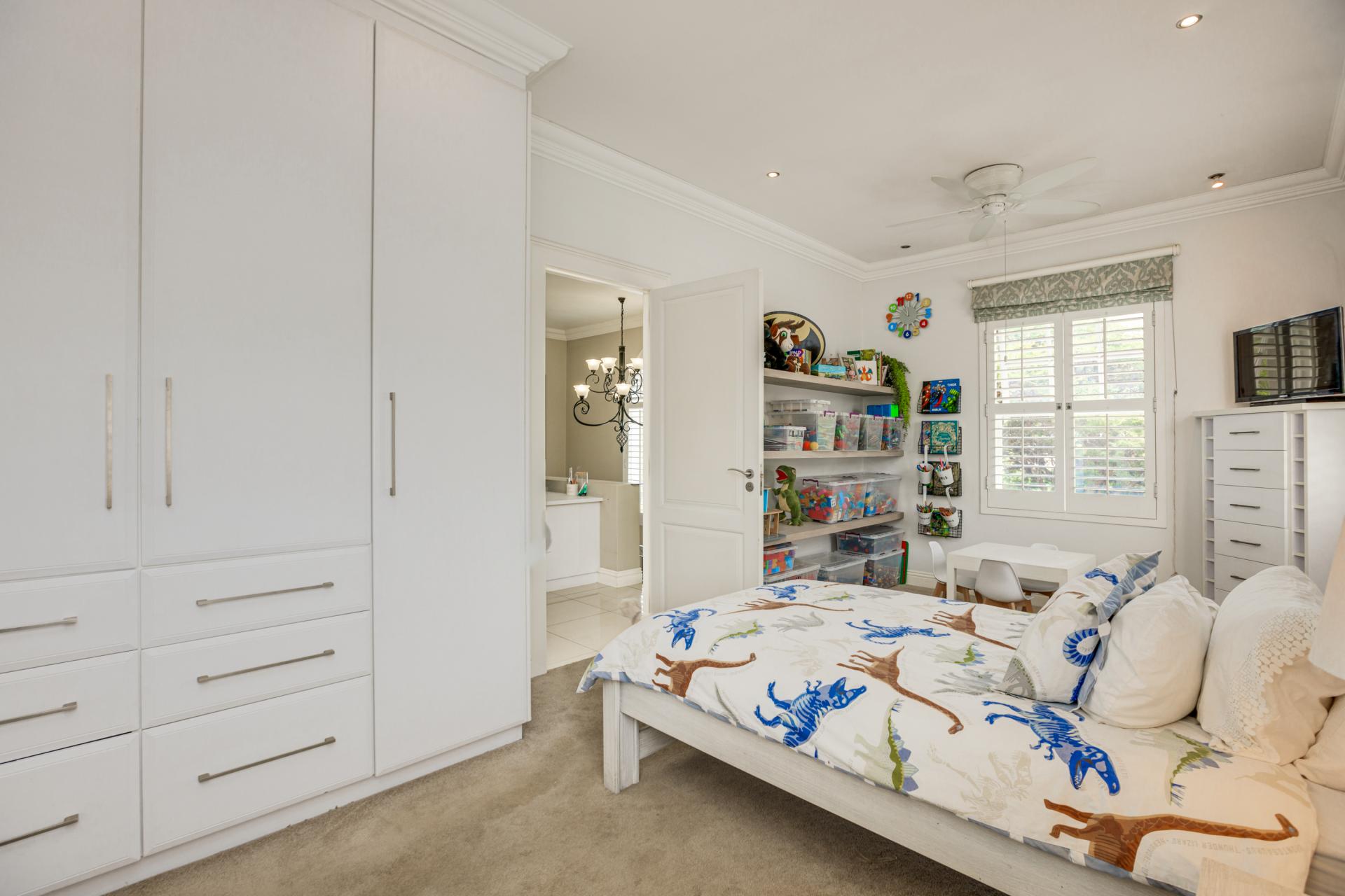 Upstairs, a study pause area with ample cupboard space provides a perfect workspace or reading nook. The first bedroom is spacious and carpeted, complete with American shutters, generous built-in cupboards, an en-suite bathroom, and air conditioning. The second bedroom, also carpeted and fitted with ample cupboard space, features an en-suite bathroom with a shower, basin, and toilet and opens onto a gorgeous balcony, offering serene views of the estate and lush green tree canopies. Completing the upstairs accommodation is the magnificent main bedroom, a sanctuary of luxury that includes a private study area leading to a balcony with breathtaking views. A separate, large walk-in dresser provides ample storage space, while the main en-suite bathroom exudes opulence with double vanities set on sleek steel stone countertops, a spacious bath, heated towel rails, and a large shower. All bedrooms in the home are fitted with air conditioning, ensuring comfort throughout the seasons.