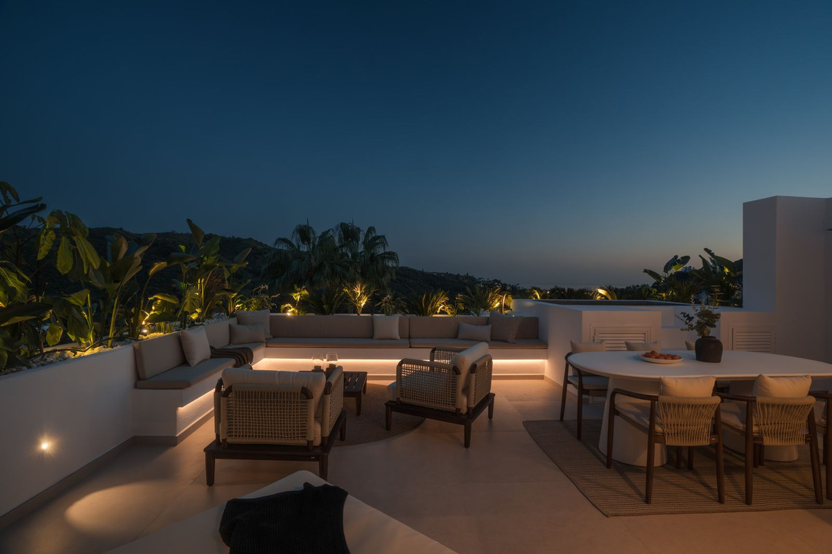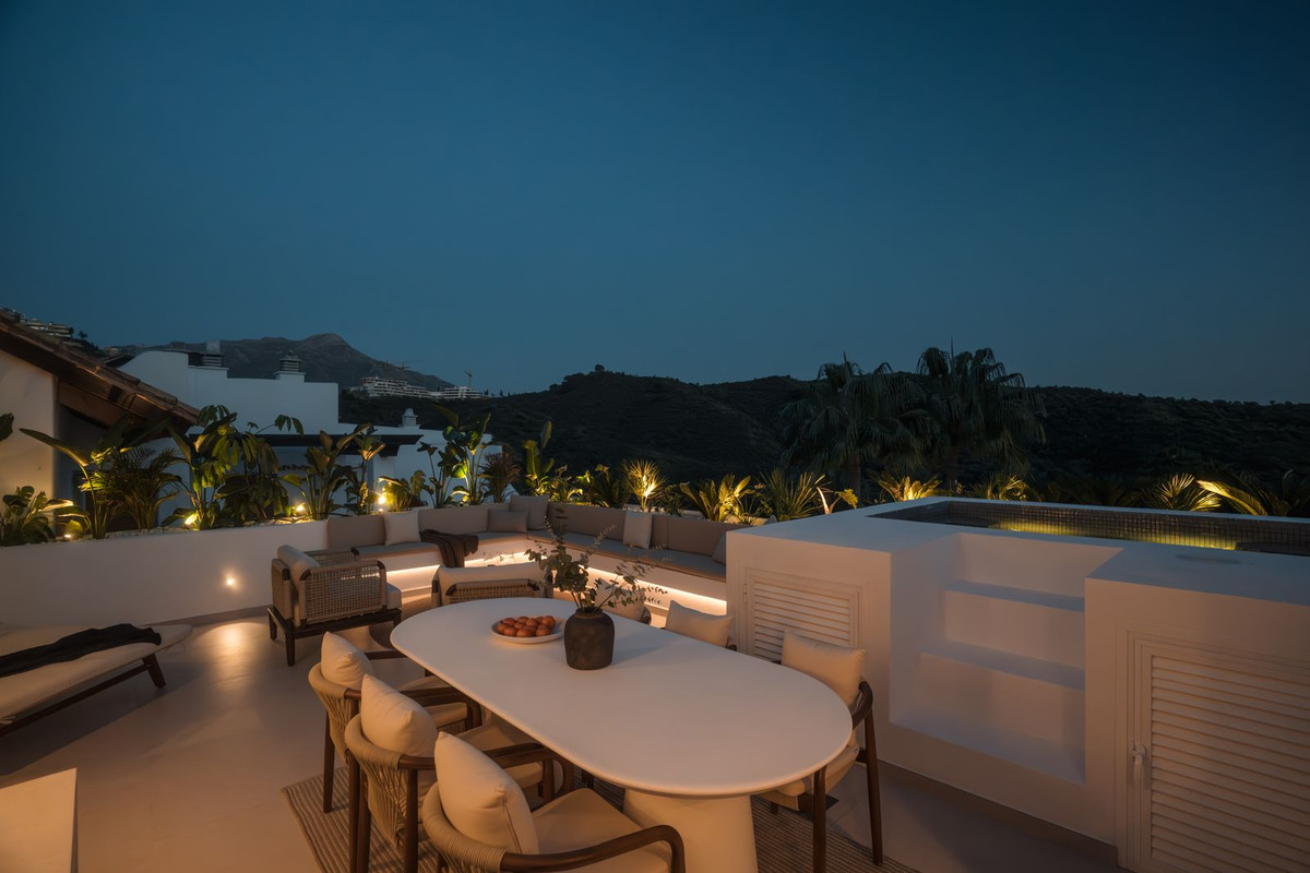 Absolutely stunning, meticulously crafted apartment in the heart of La Quinta, Benahavis. Featuring chevron bespoke wooden floors, rich natural textures, expansive stone-tiled bathrooms and a sleek Danespan kitchen with premium Miele appliances. The first floor offers three spacious bedrooms, including one en-suite, plus an open living and dining area flowing onto a terrace. Upstairs, the master suite features a walk-in closet, a luxurious bathroom and a private terrace with a sundeck and plunge pool. Enjoy stunning views of La Concha, the Mediterranean, and La Quinta Golf. An absolute must view property, ideal for anyone wanting villa sized living in a lock up and leave apartment!